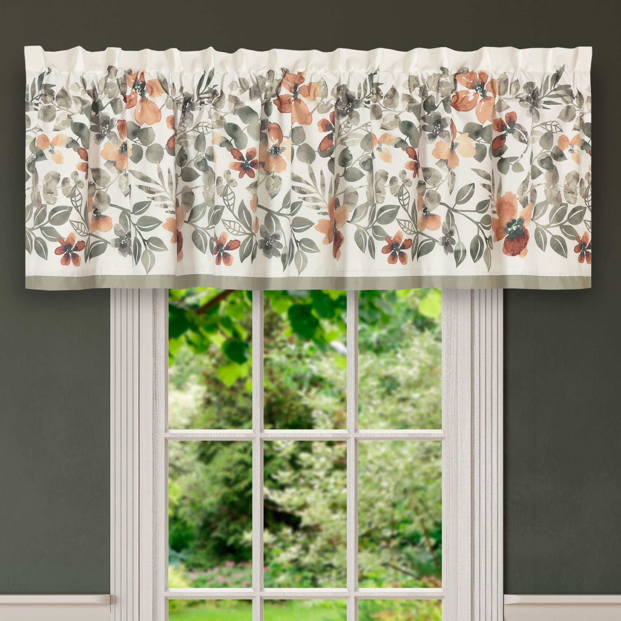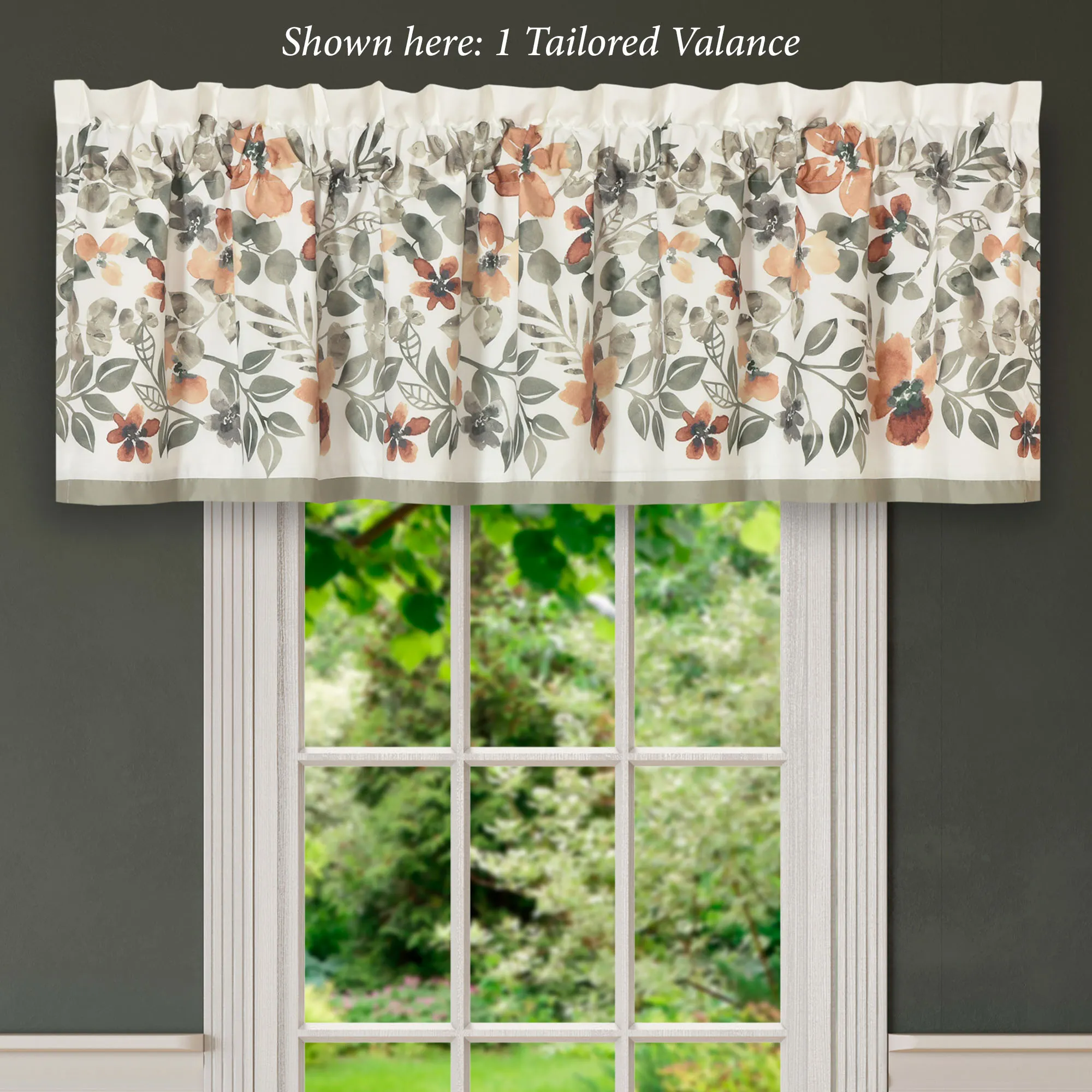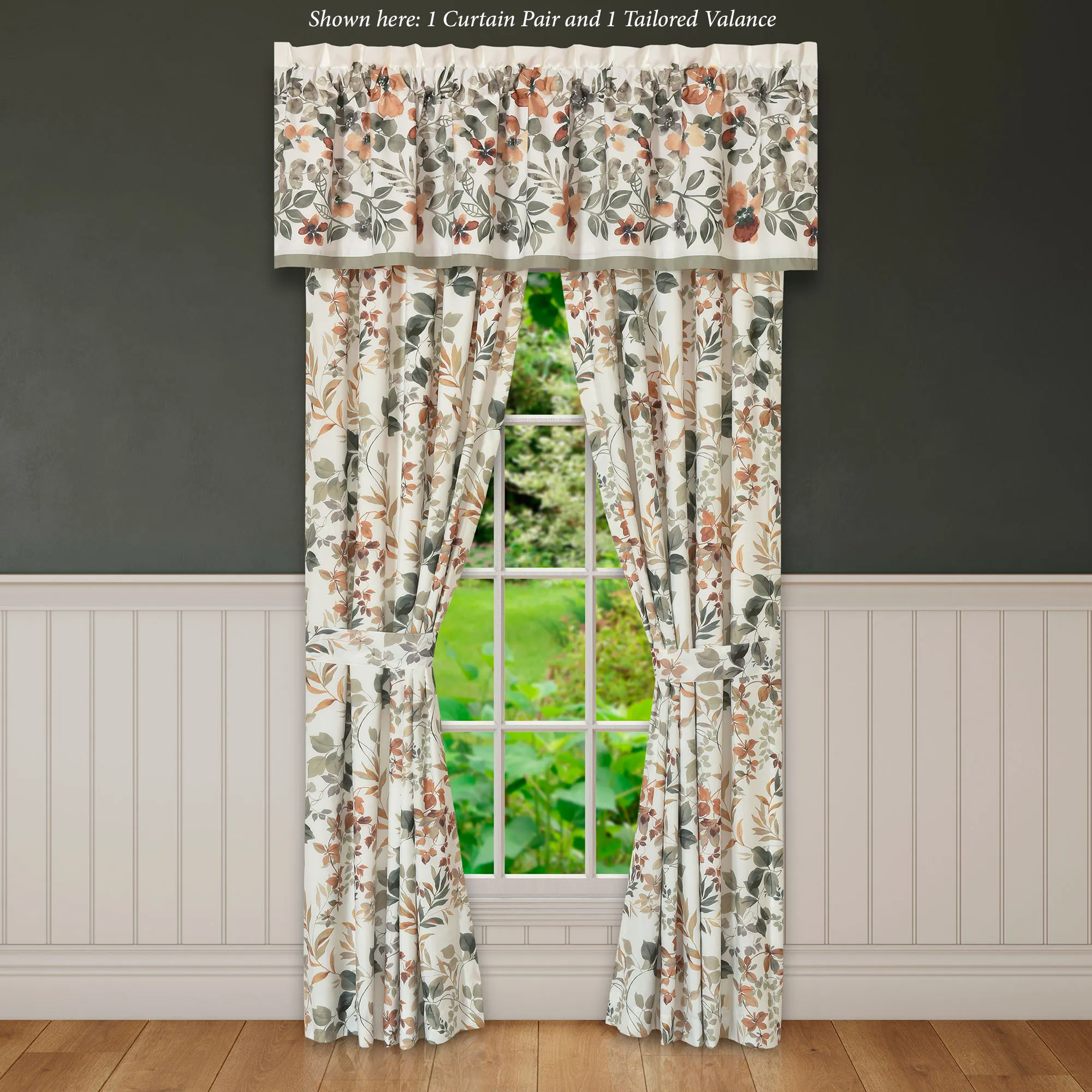 Lined Window Treatments have tailored edges and 3" rod pockets. Curtain Pair includes tiebacks. Valance has a sage bottom band.