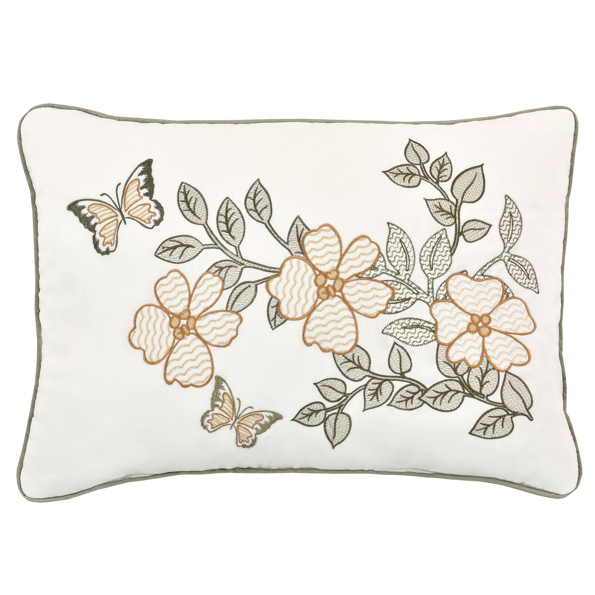 Pillows: Spot clean. Piped Square has leaves and reverses to leafy medallions. Quilted Square is vermicelli-quilted sage with bound edges; reverses to leafy medallions. Piped Rectangle has embroidered florals, leaves, and butterflies on ivory.