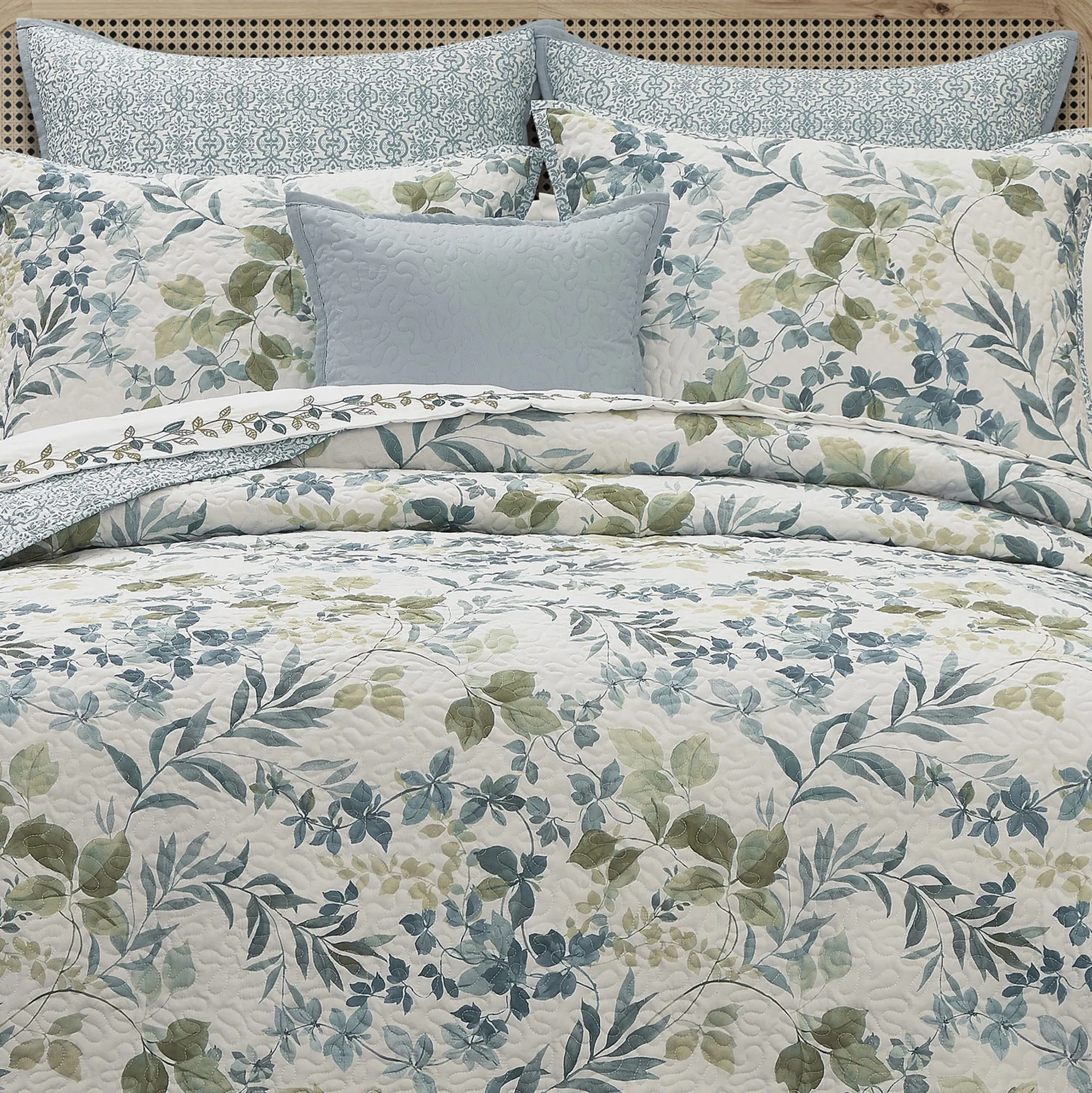 Evergreen II Blue and Green Reversible Botanical Leaf Print Quilt Set Bedding by Royal Court