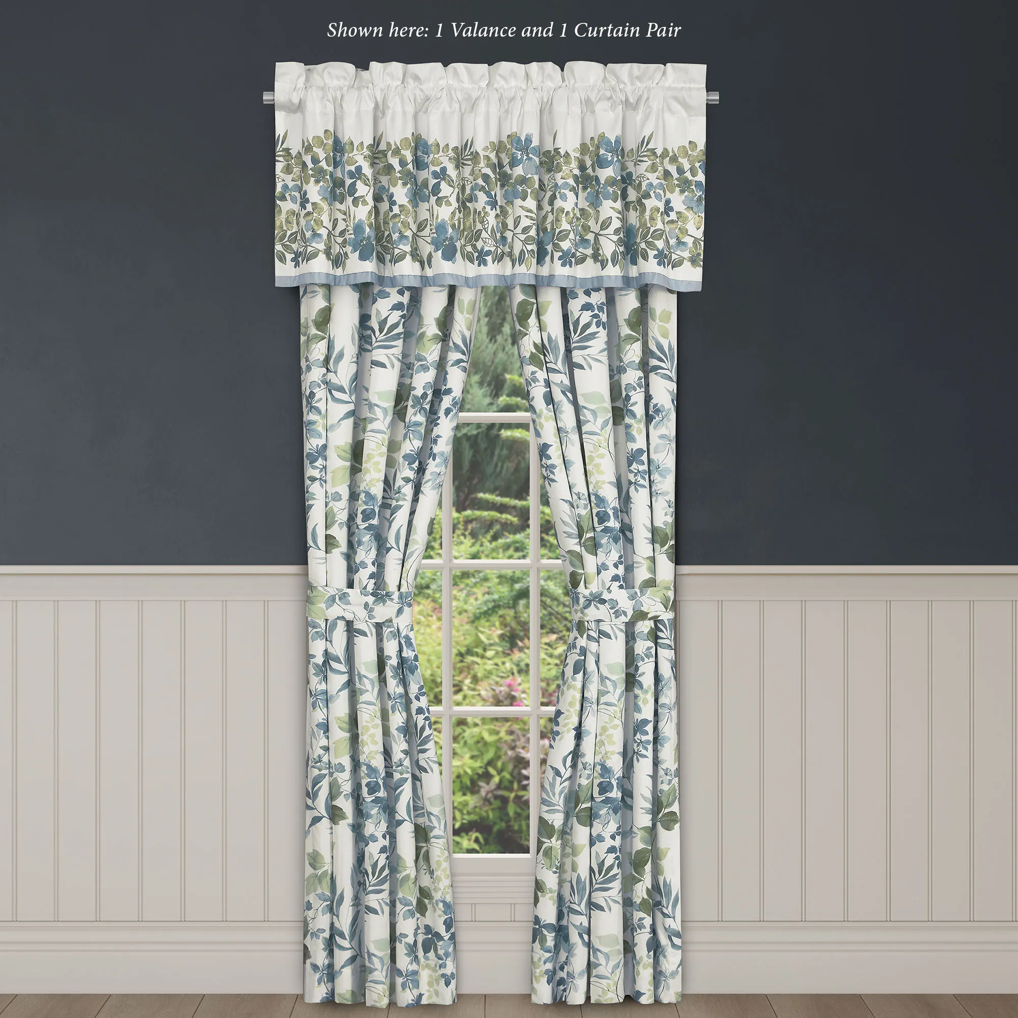 Lined Window Treatments have leaves, tailored edges, and 3" rod pockets. Curtain Pair includes tiebacks. Valance has a bottom blue band.