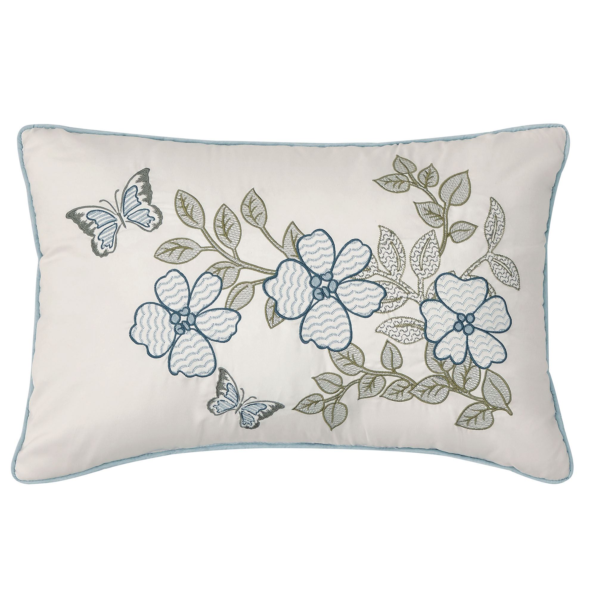 Pillows: Spot clean. Piped Square has leaves and reverses to leafy latticework. Quilted Square is blue with vermicelli quilting and bound edges; reverses to leafy latticework. Rectangle features embroidered florals, leaves, and butterflies on ivory with piped edges.