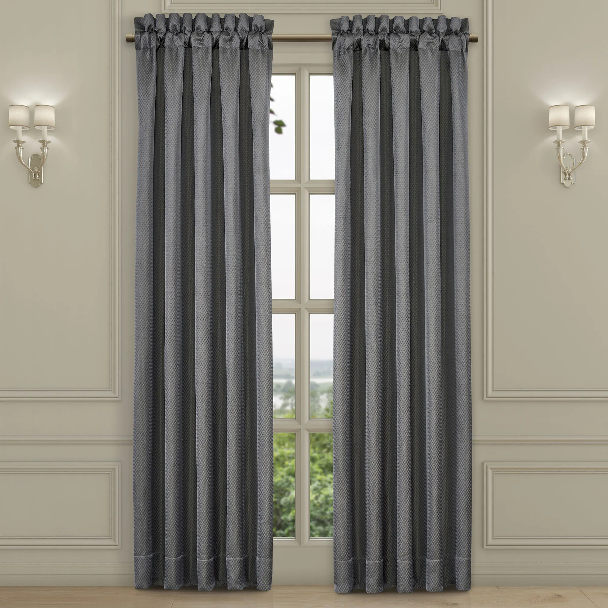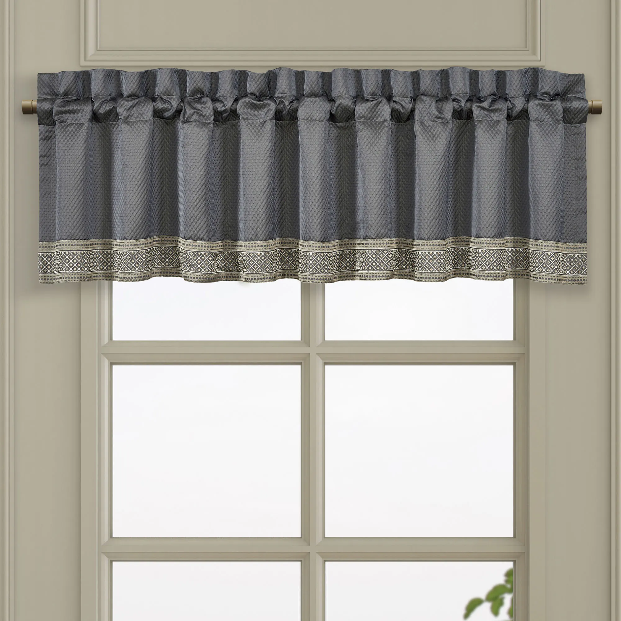 Tailored, lined Window Treatments have embossed diamond motifs and 3" rod pockets. Wide Curtain Pair includes tiebacks. Curtains are available in two lengths. Valance has woven diamond and dot designs.