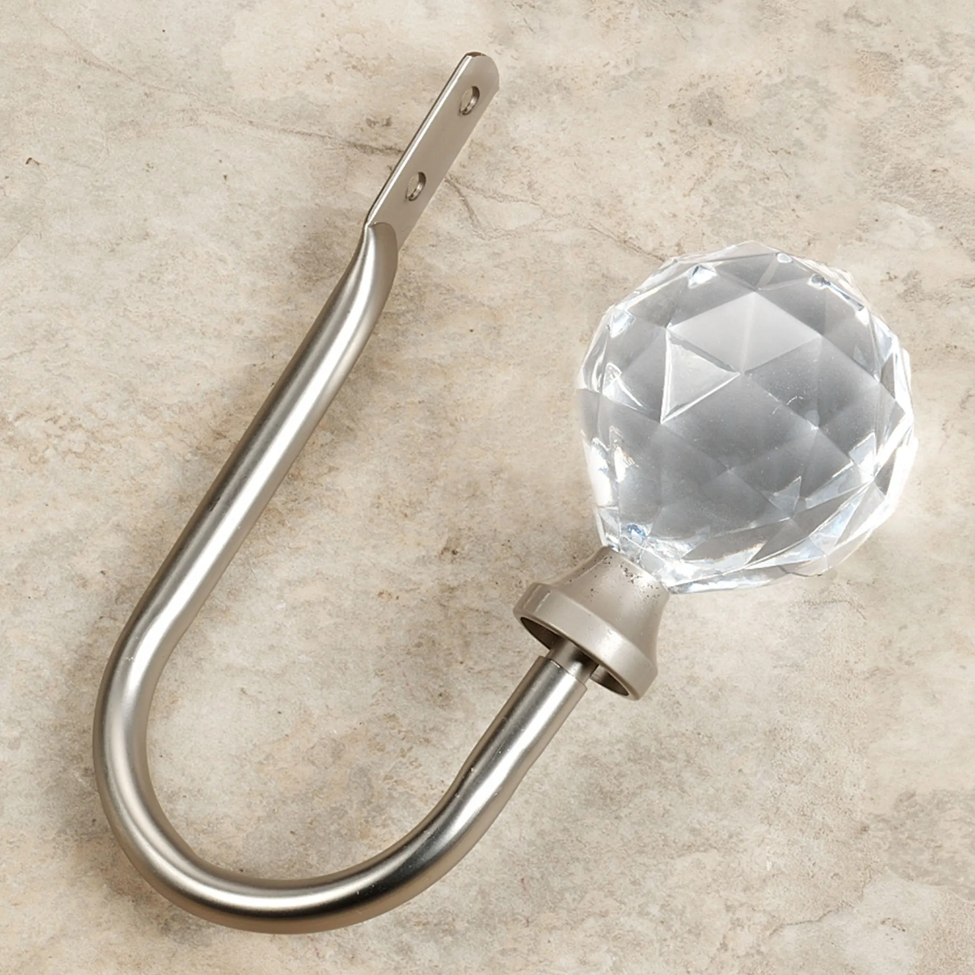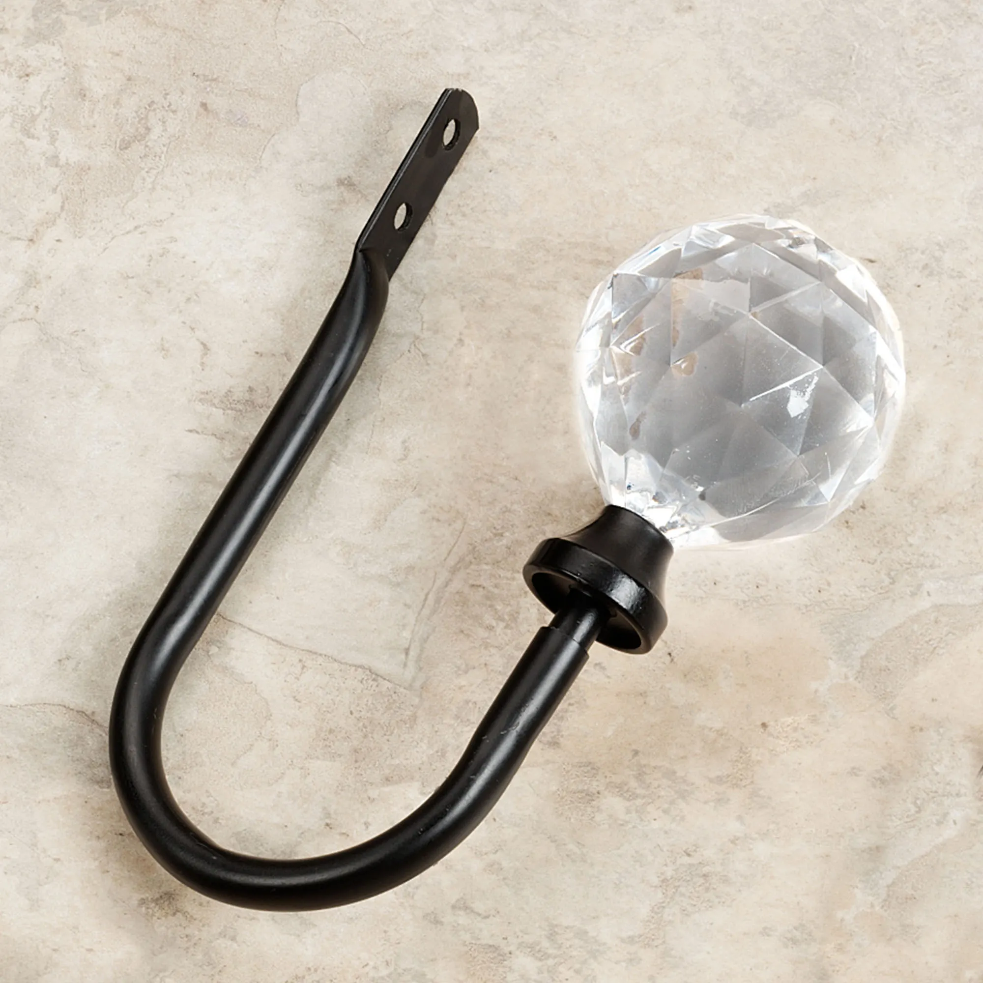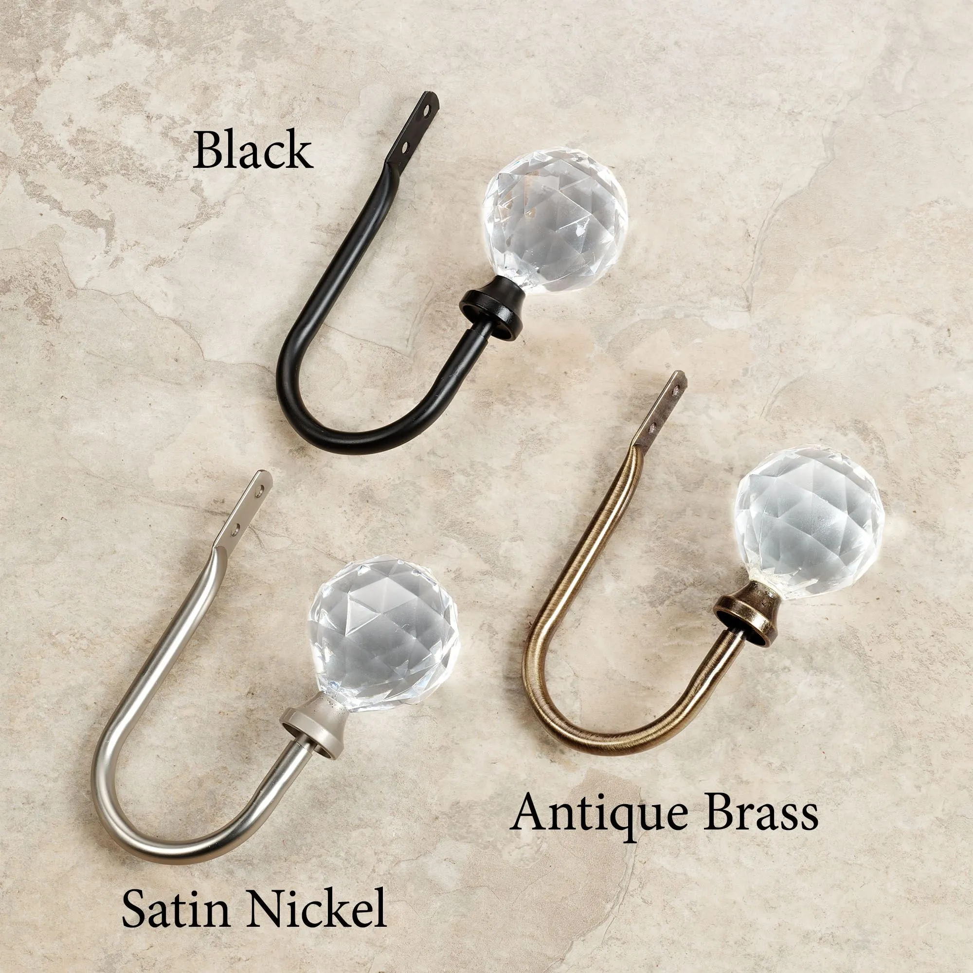 The Faceted Curtain Holdback Pair brings a luxurious accent to your window treatment. Each metal holdback has a faceted clear acrylic crystal orb finial and a J-hook with 3"D projection. Each holdback is 4.5"Wx2.5"H.