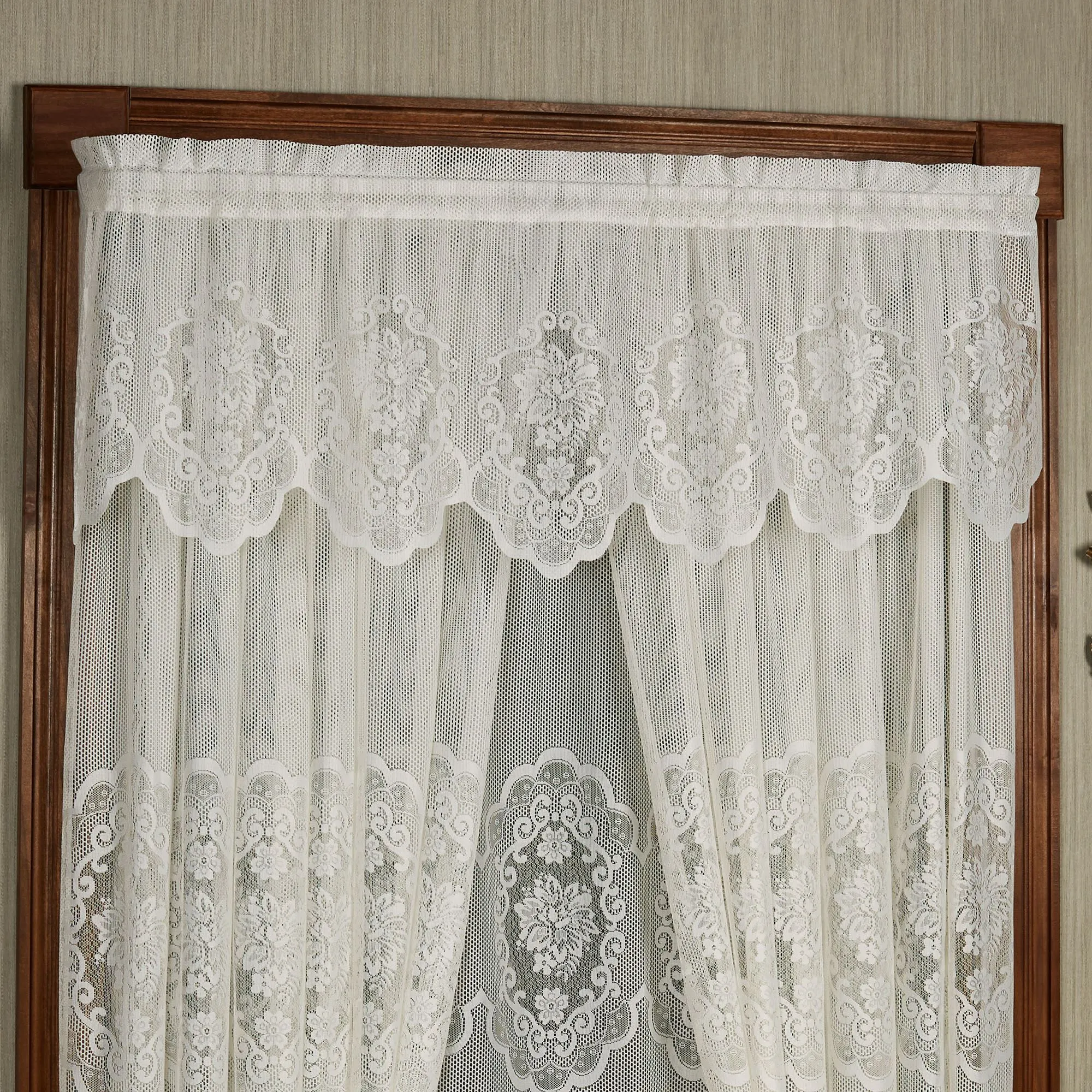The Fairmount Lace Window Treatment is the perfect elegant decorating solution. Polyester lace window treatment has beautiful floral motifs, scalloped edges, and delicate openwork lace. Rod pockets are 2". Specify Curtain Panel, 56"W; Swag Valance Pair, 56"Wx63"L; Tailored Valance, 56"Wx13"L; or Scalloped Valance, 56"Wx18"L. Machine wash. Imported.