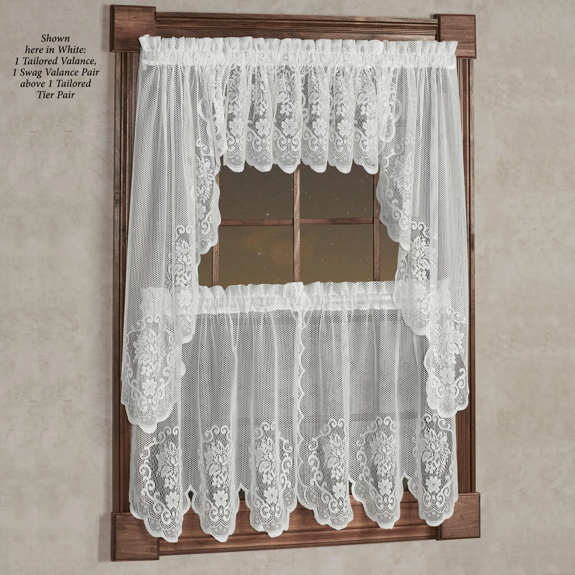 • Shown: 1 Tailored Valance & 1 Swag Pair above 1 Tier Pair