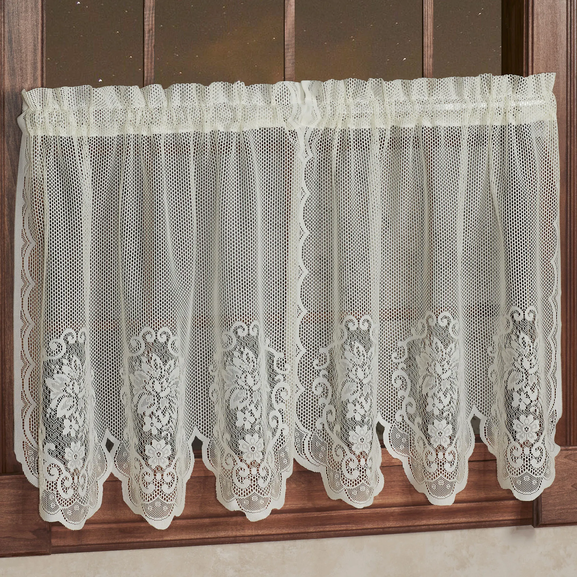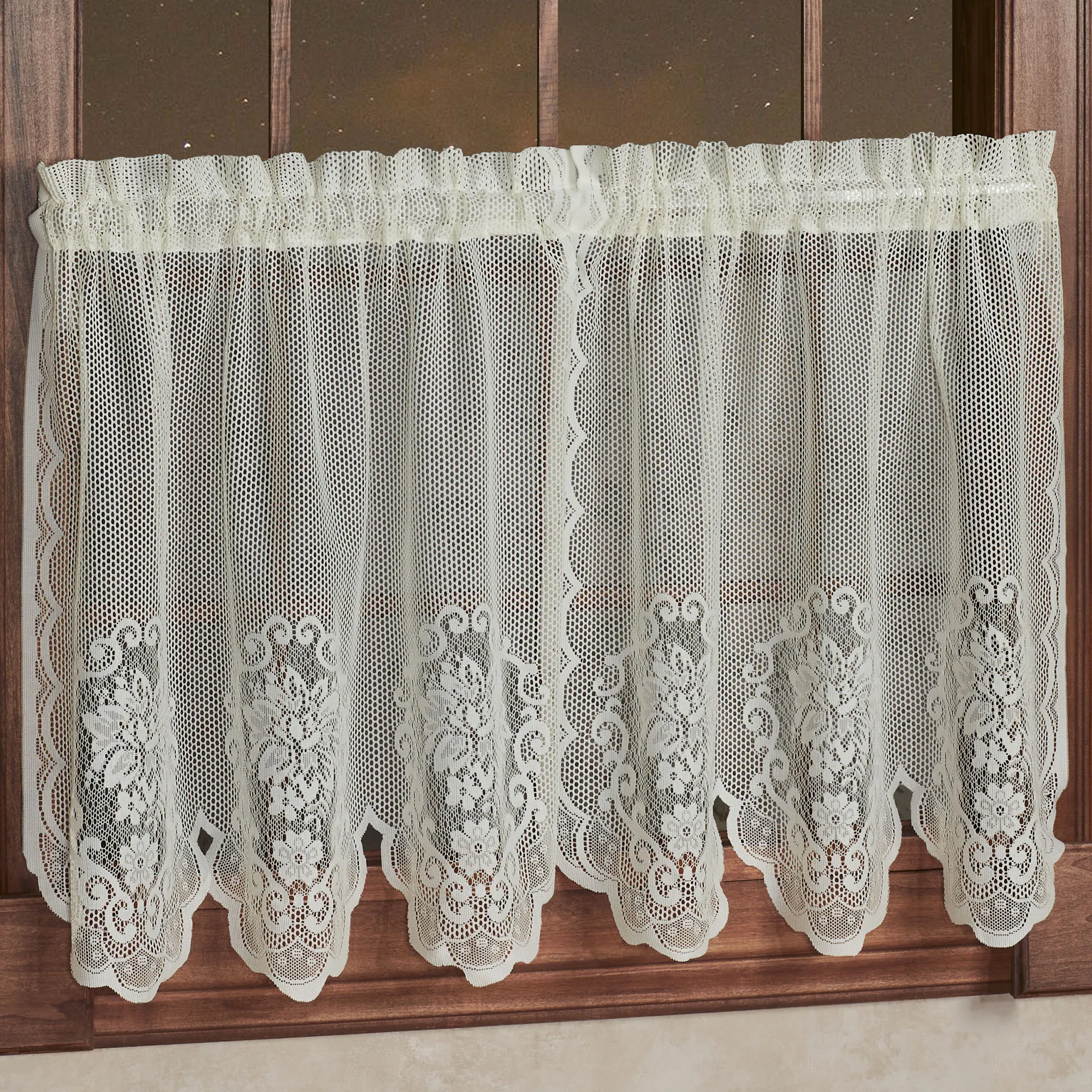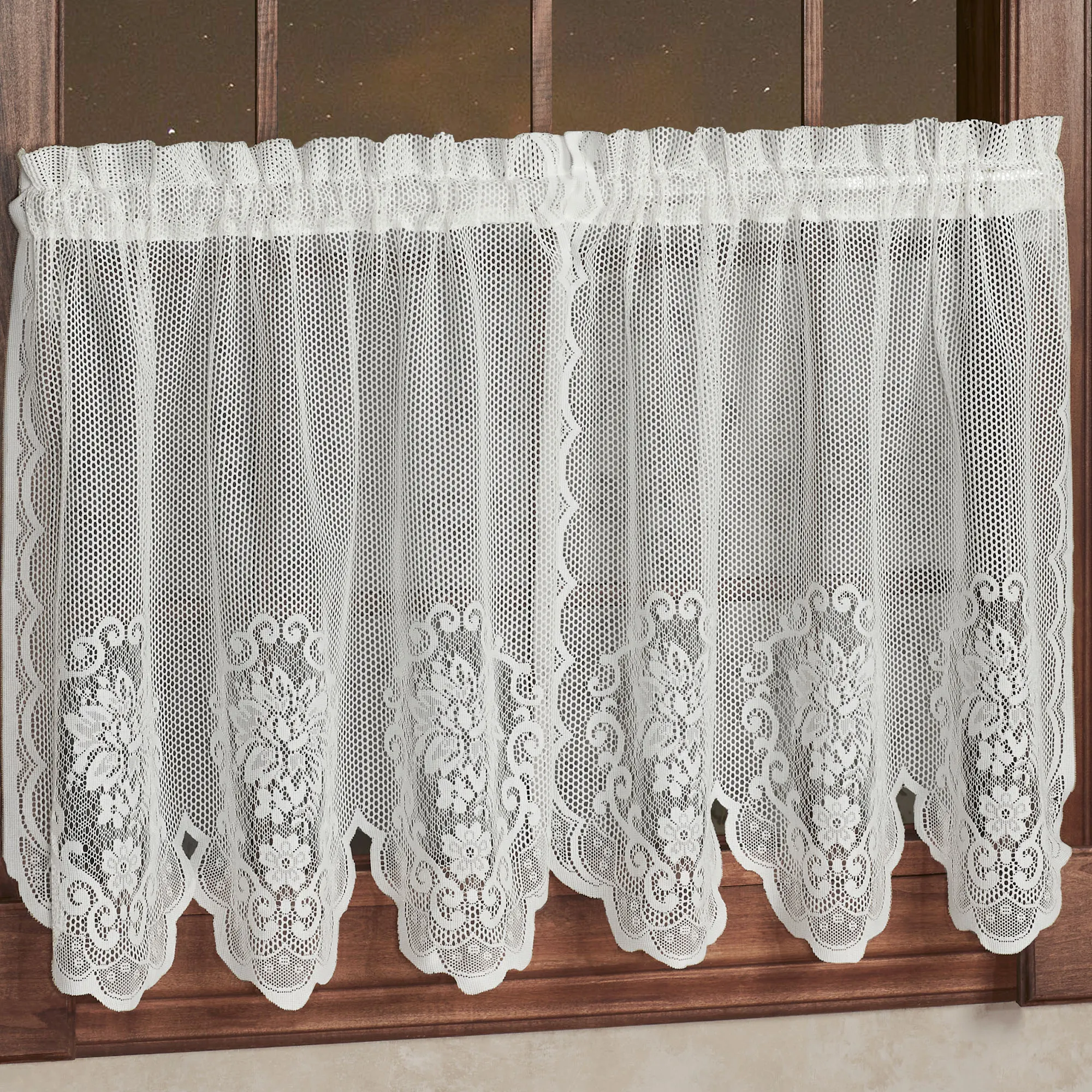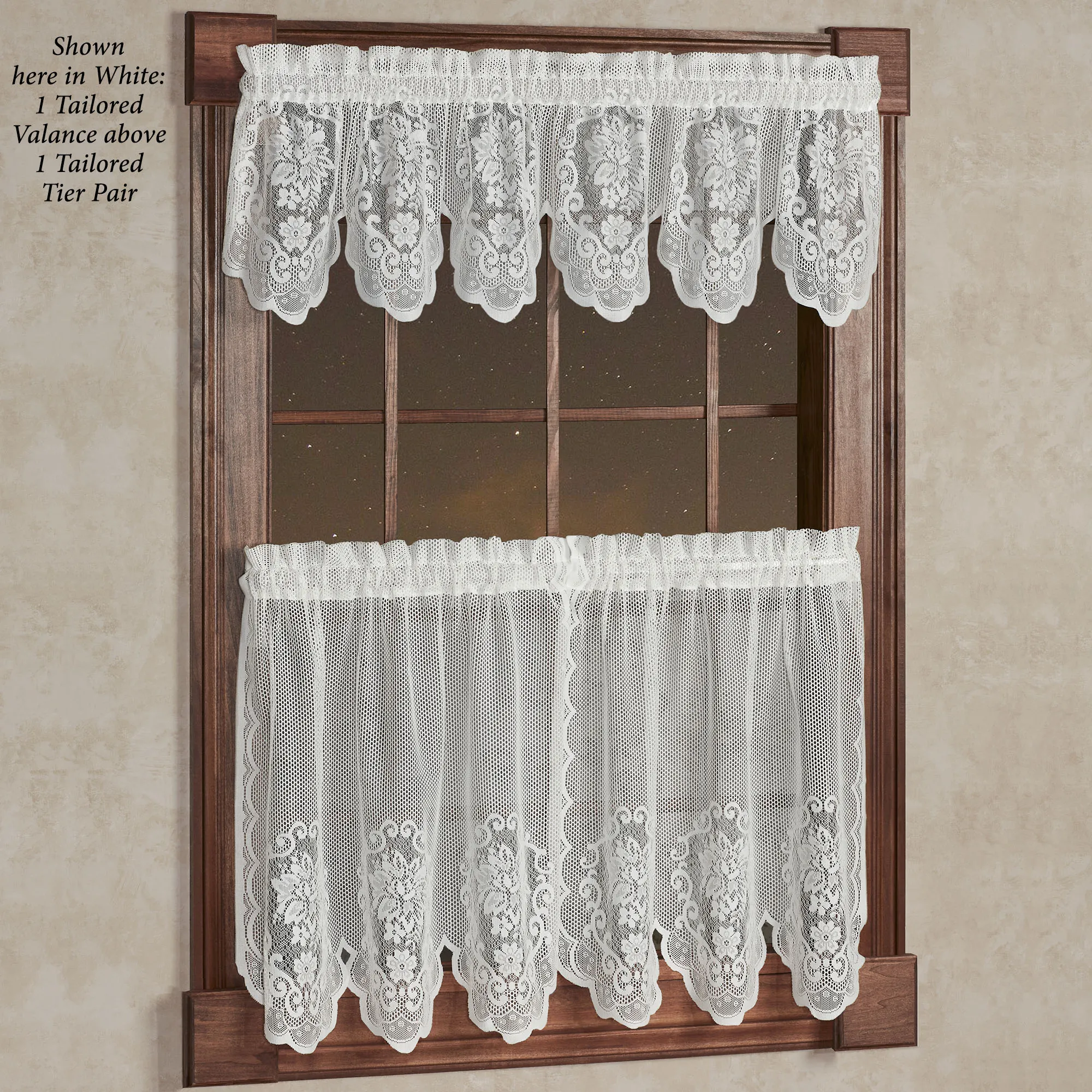 The Fairmount Lace Tier Window Treatment is the perfect elegant decorating solution. Polyester lace window treatment features beautiful floral motifs, scalloped edges, and delicate openwork lace. Specify Tailored Tier Pair, Tailored Valance, or Swag Valance Pair. Window treatment has 2" rod pockets. Machine wash. Imported.