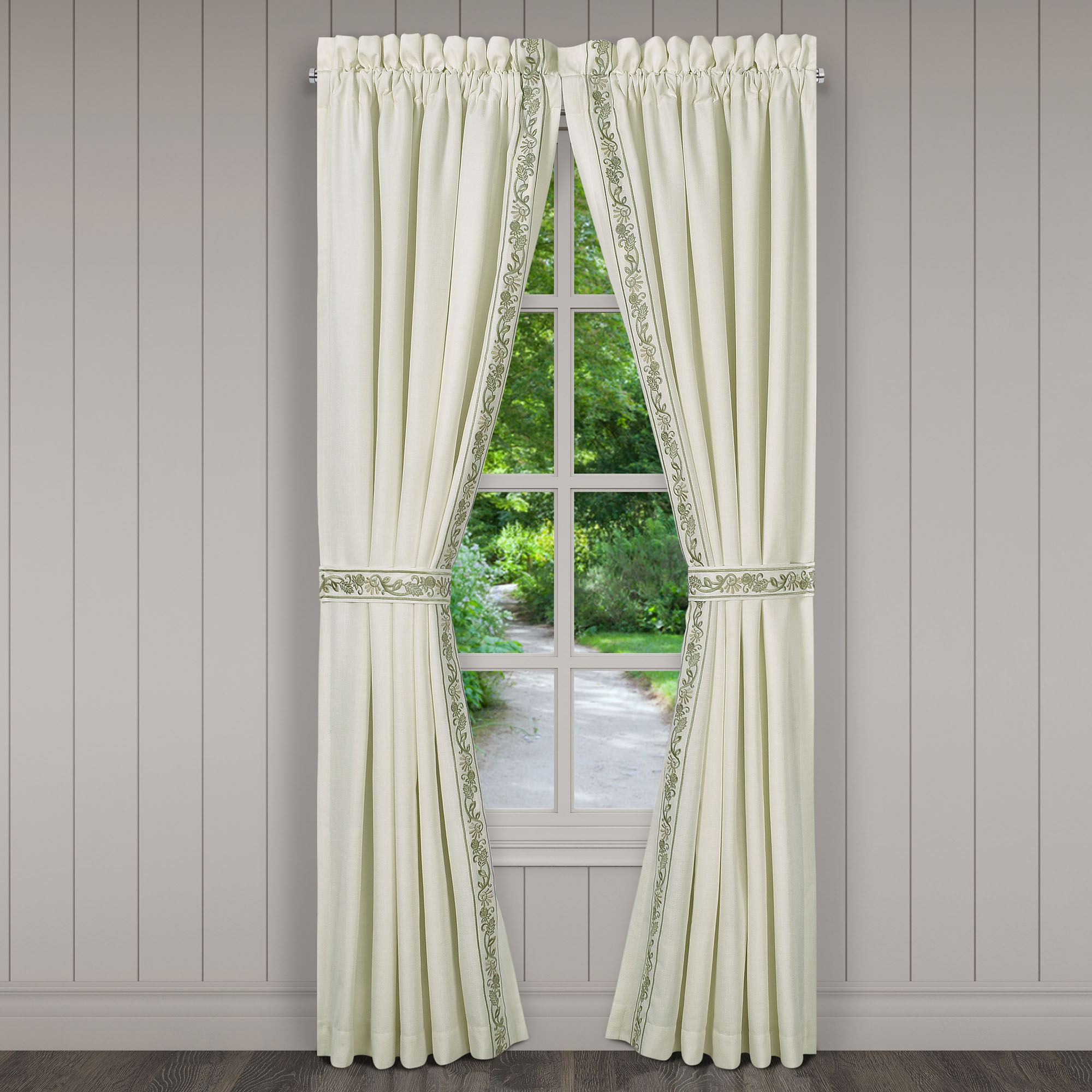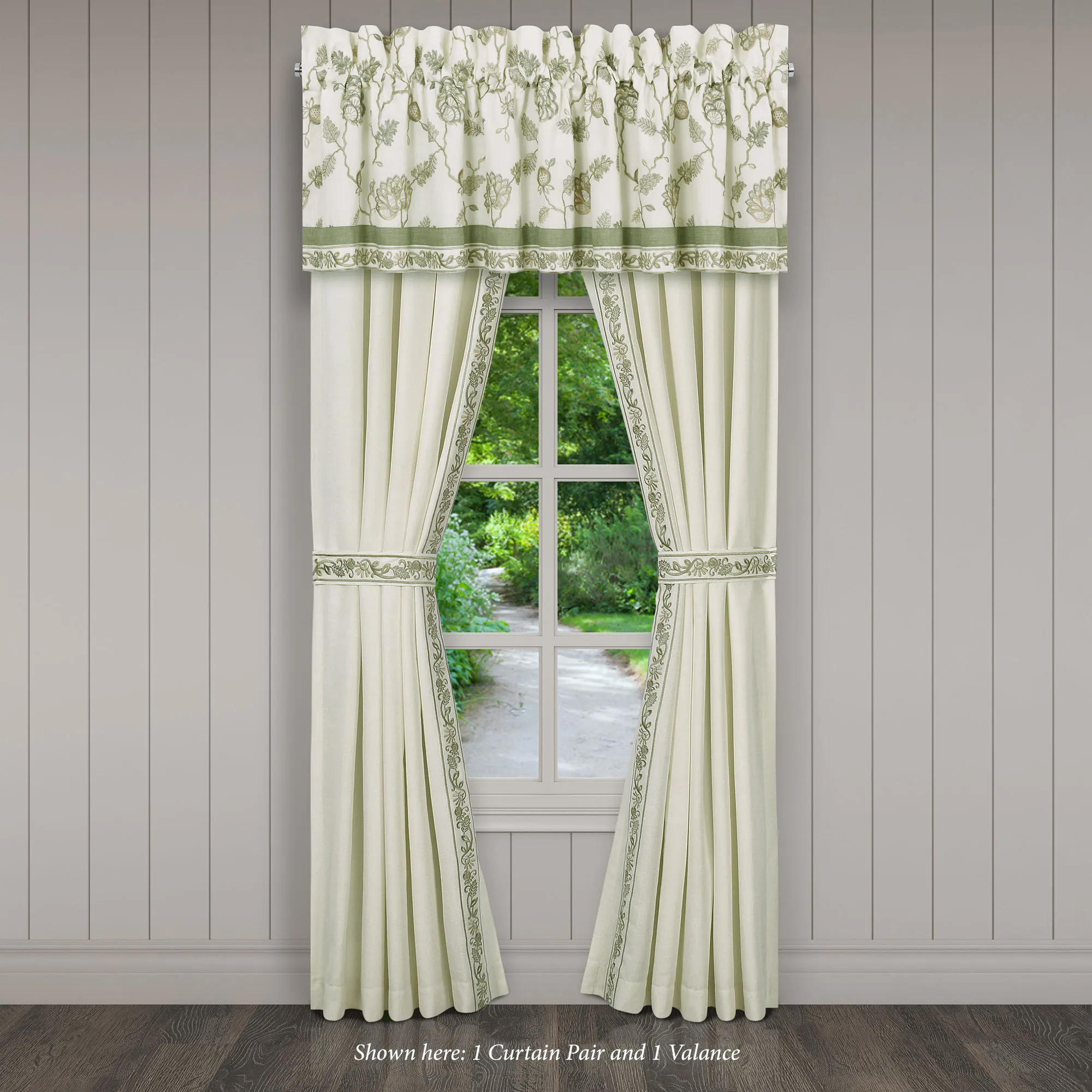 Lined Window Treatments have a tailored edge with embroidered trim. Wide Curtain Pair is ivory with a trim-decorated inside edge and a 3" rod pocket. Tiebacks are included. Curtains are available in two lengths. Valance features embroidered florals, a sage accent band, and a 3.25" rod pocket.