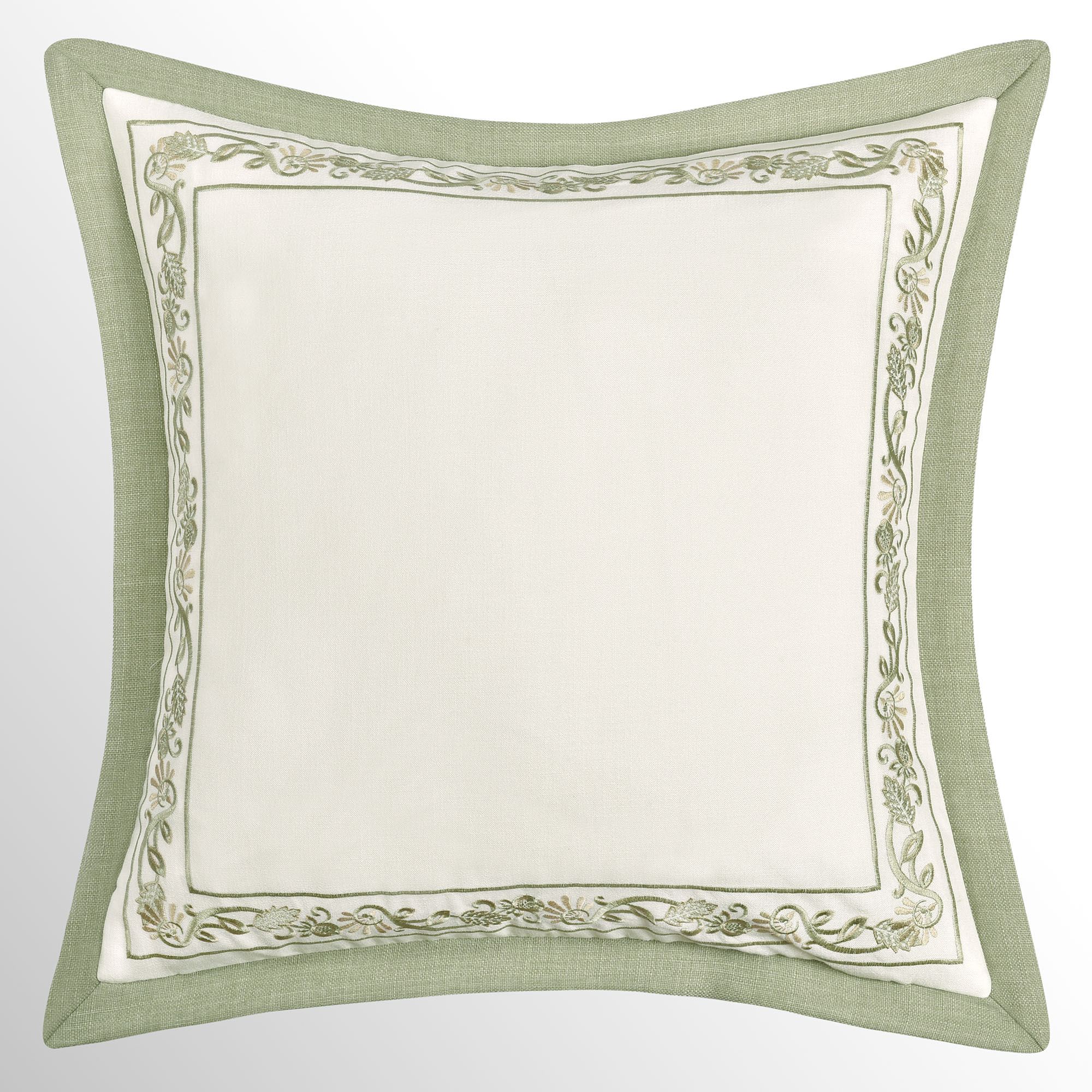 European Sham is ivory with an embroidered trim frame and sage flanged edges; reverses to ivory with sage diamonds; zipper closure.