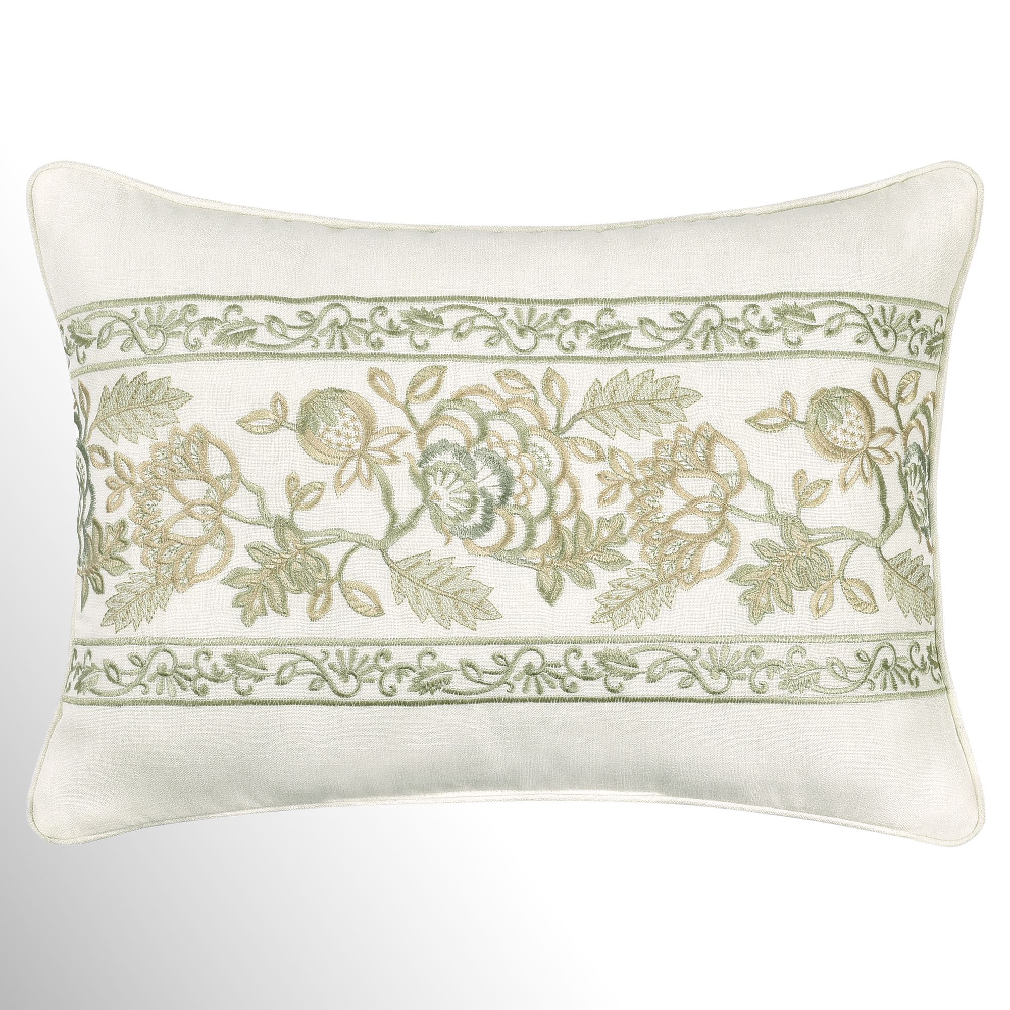 Pillows: Spot clean. Square is ivory with an embroidered trim frame and sage flanged edges; reverses to ivory with sage diamonds. Piped Rectangle has an embroidered floral center with embroidered trim. Neckroll has embroidered florals accented with piping, bands of sage diamonds, and sage tied ends.