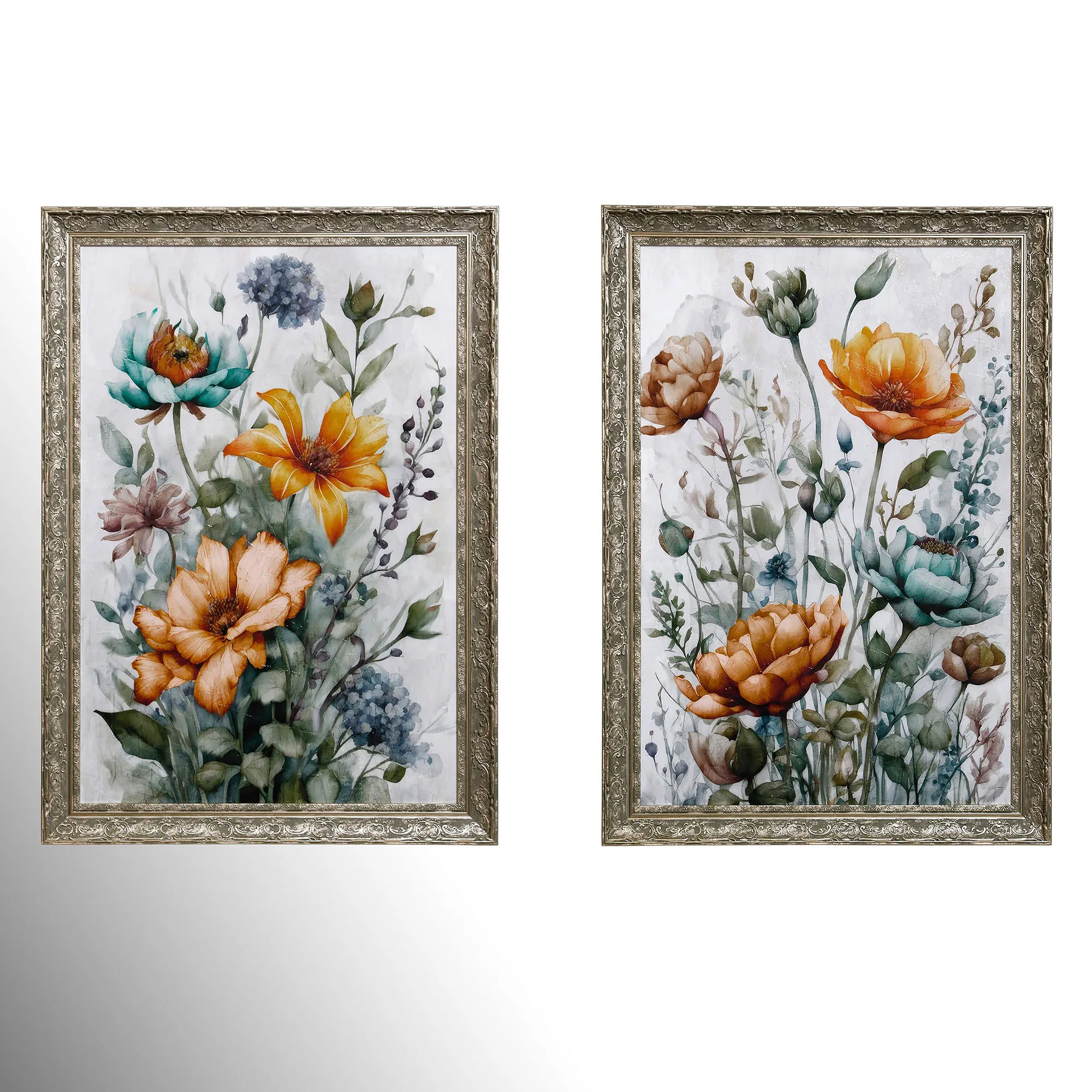 Lovely Fall Floral Whimsy blossoms from this framed wall art. Proudly made in the USA, each paper print artwork features a textured design with beautiful muted copper, turquoise, and golden orange blossoms on a color-washed white background. An elaborately detailed polystyrene frame encases the designs in an antiqued champagne silver hue. I has two warm-toned flowers that are angled forward. II has more cool-toned flowers that face the sky. Each is 30"Wx1.5"Dx42"H.