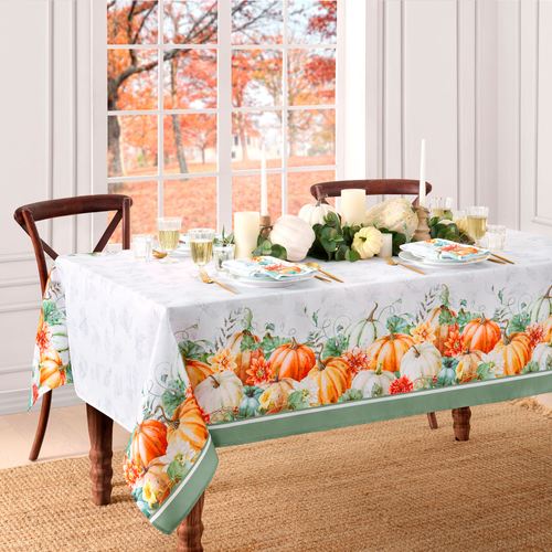 The Fall Flourish Pumpkin Table Linens are polyester. Imported.