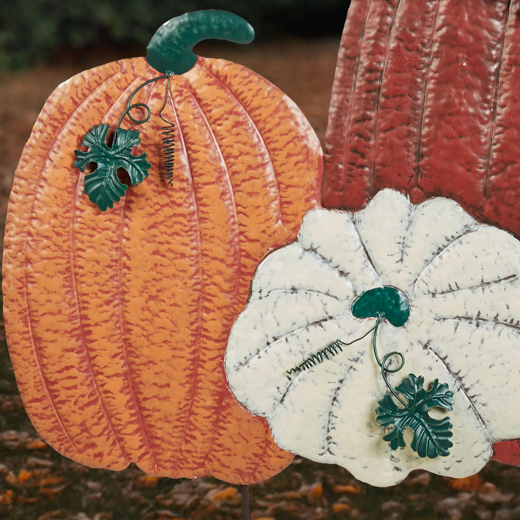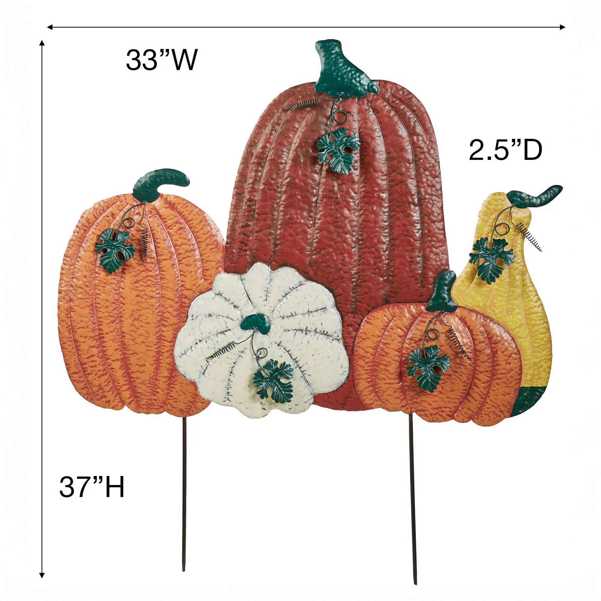 The Fall Harvest Pumpkin Yard Stake celebrates the bold shades of autumn. Handpainted in hues of orange, yellow, white, and green, the handcrafted metal sign features an arrangement of four textured pumpkins and a gourd with dimensional leaves and curly vines. Outdoor seasonal use. With stakes to secure the decorative sign into the ground, the design measures 33"Wx2.5"Dx37"H overall.