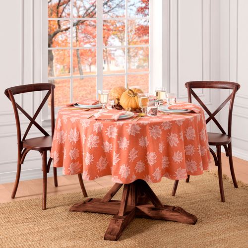The Falling Foliage Table Linens decorate your tablescape in a grand autumnal display. Adding texture and depth to your seasonal dining table, each preshrunk cotton table accessory features off-white jacquard-woven maple leaves on a solid soothing fall hue. Tailored edges finish each element. Choose Round Tablecloth, Rectangle Tablecloth, Oval Tablecloth, or Napkin Set of 8. Machine washable. Imported.