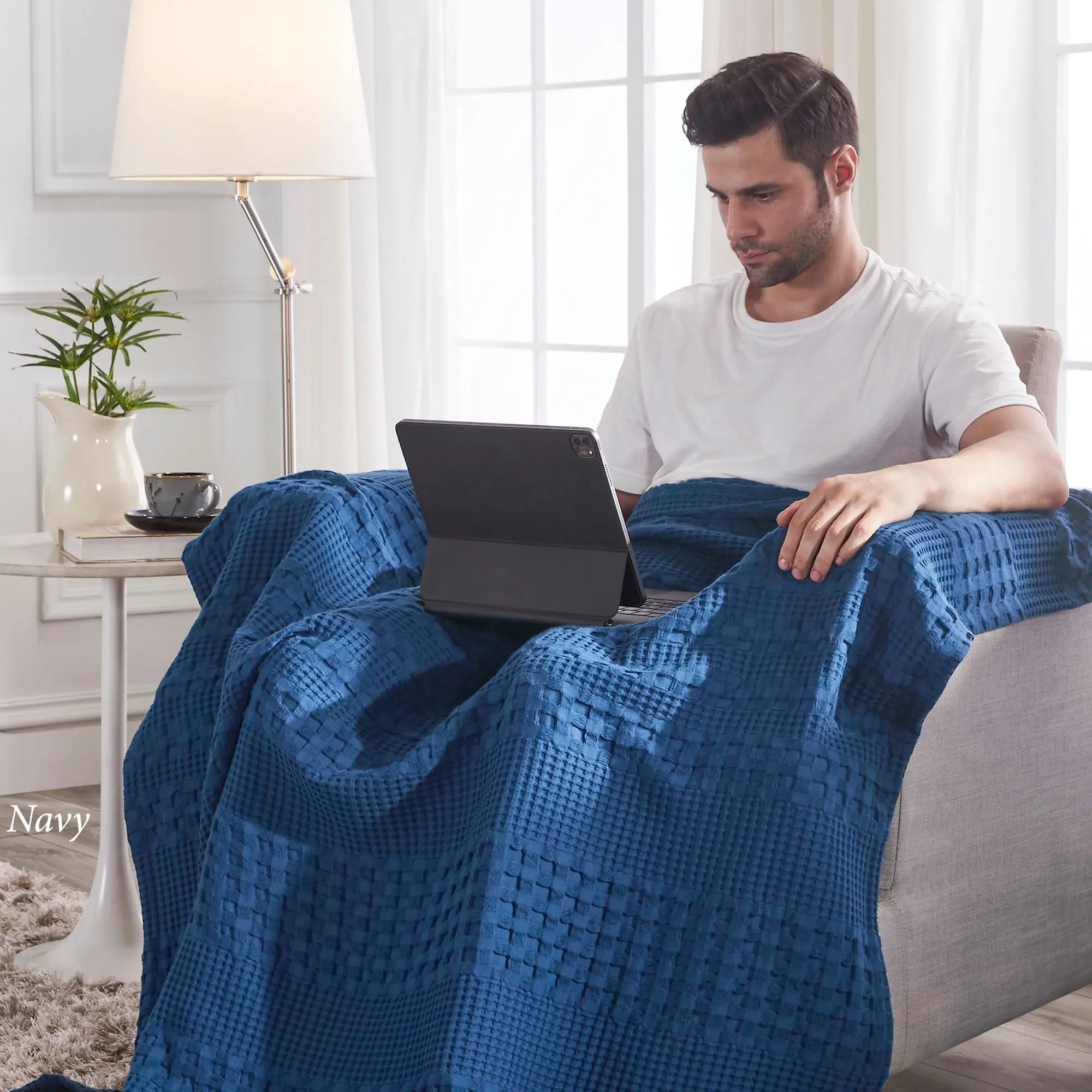 Snuggle up with the true charm of the Farmhouse Throw. From April & Olive, the solid color blanket features a high-quality pure cotton design pre-washed for an immediately soft, cozy feel. The unique waffle-weave texture adds charm while also ensuring warmth and beauty. Throw measures 50"x60". Machine washable. Imported.
