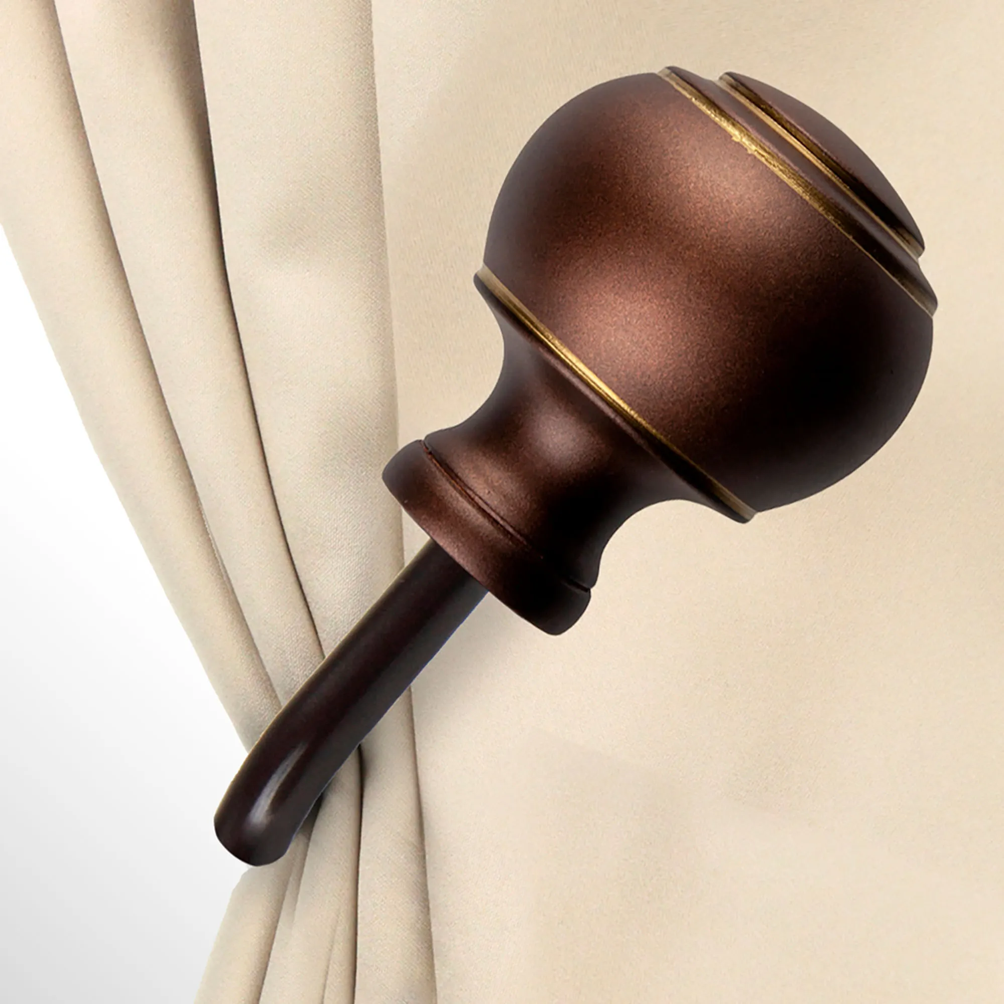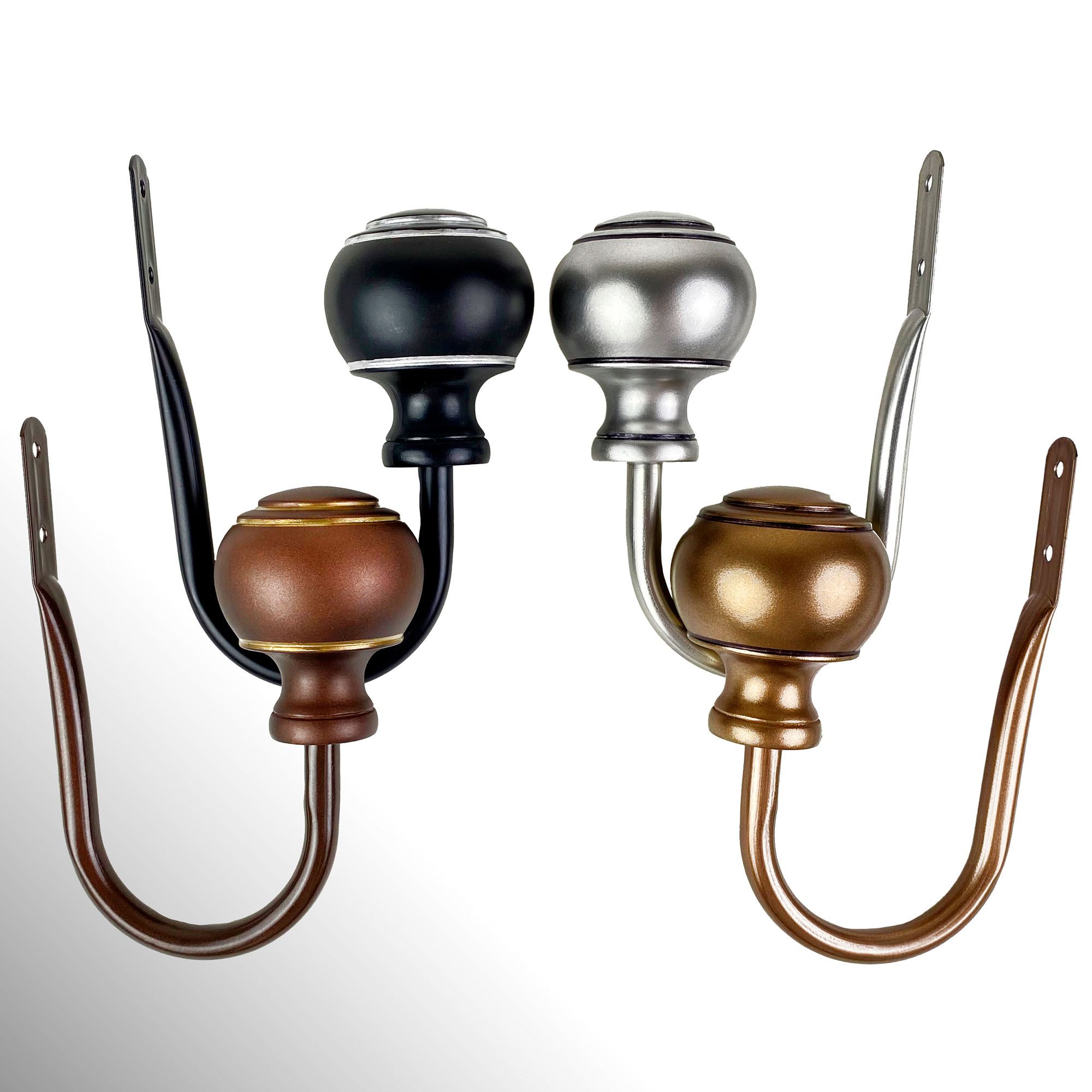 The Farrar Curtain Holdback Pair provides a classic complement. Each steel holdback has a round resin finial that exudes a timeless air with linear detailing. The holdback pair has a "J" shape that projects 3" to contain your curtains; each measures 3"Wx5.75"L.