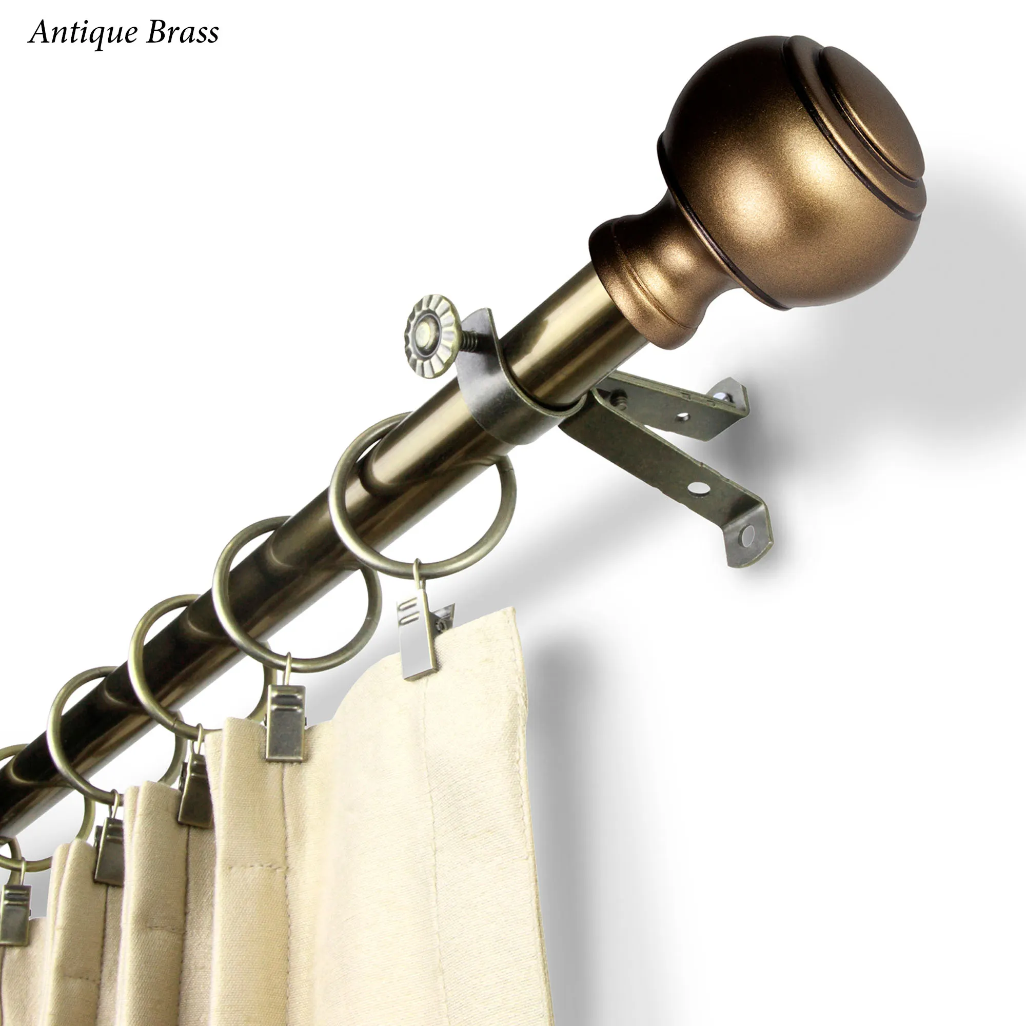 The Farrar Curtain Rod and Finial Set provides a classic complement. Each round resin finial exudes a timeless air with linear detailing. The Rod and Finial Set includes one .75" dia. telescoping steel rod; two finials, measuring 2.75"Wx1.25"Dx2.25"L each; brackets that project 2.75" each; and mounting hardware. The 18"-28" and 28"-48" sizes include two brackets; the 48"-84" and 66"-120" sizes include three brackets; the 120"-170" size includes four brackets. The Holdback Pair, sold separately, has a "J" shape that projects 3" to contain your curtains; each measures 3"Wx5.75"L.