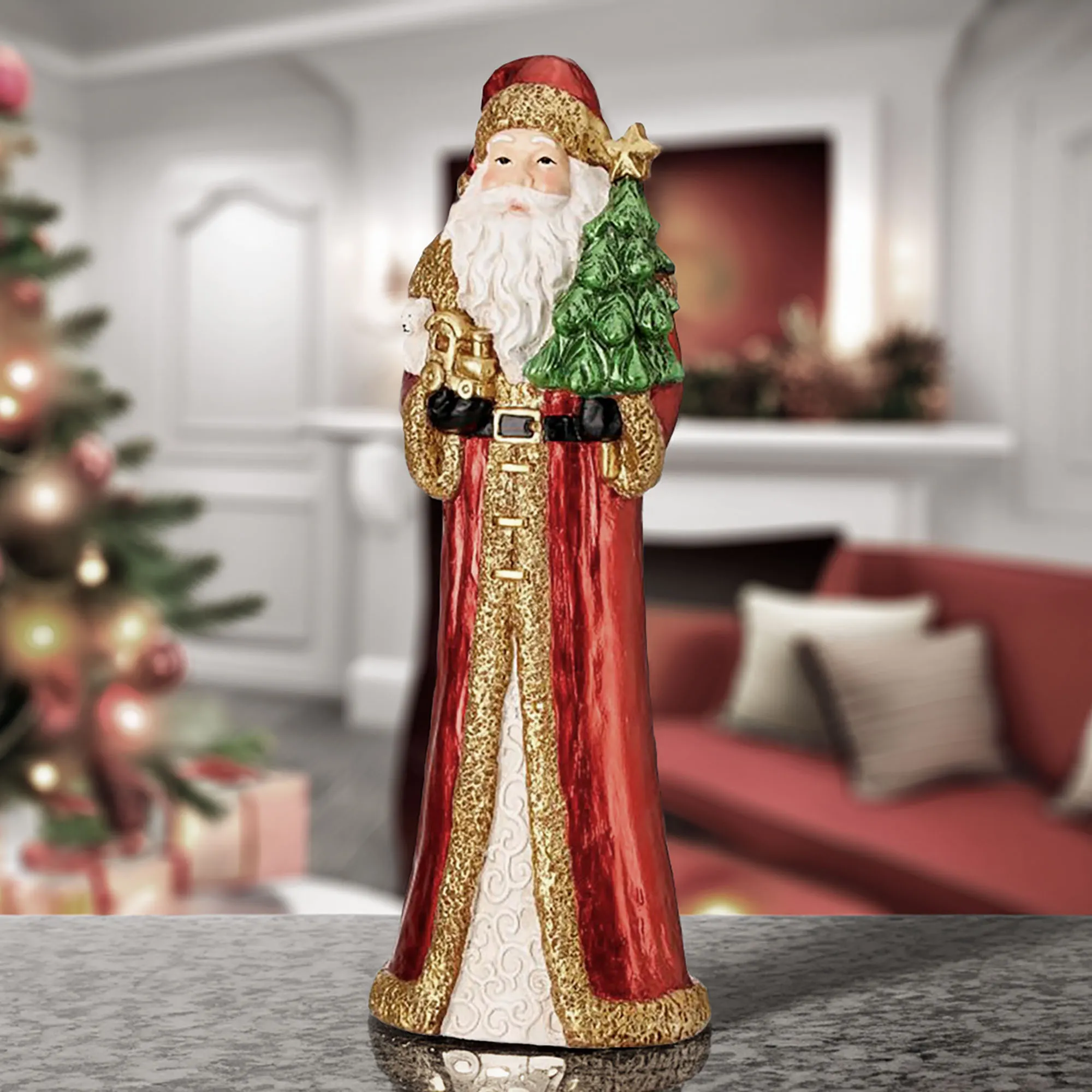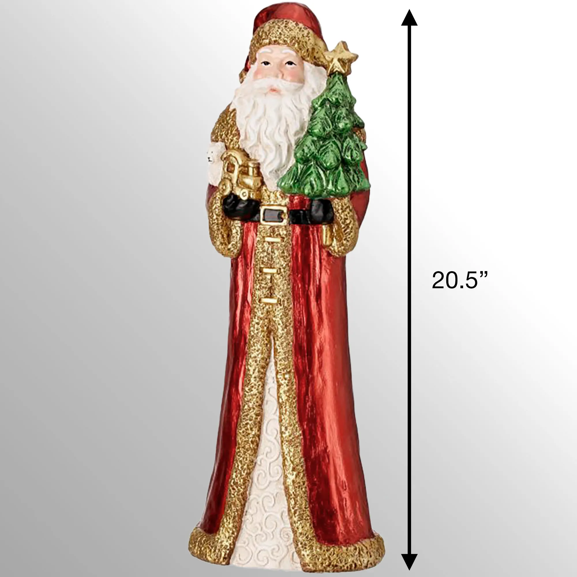 Let Father Christmas decorate your home with seasonal splendor. This polystone sculpture features a Victorian Santa in a long red coat with vibrant gold trim and an off-white gown with a scroll design. One hand holds a green Christmas tree, and the other hand holds a gold train with a little bear. Measures 6.5"Wx4.5"Dx20.5"H.
