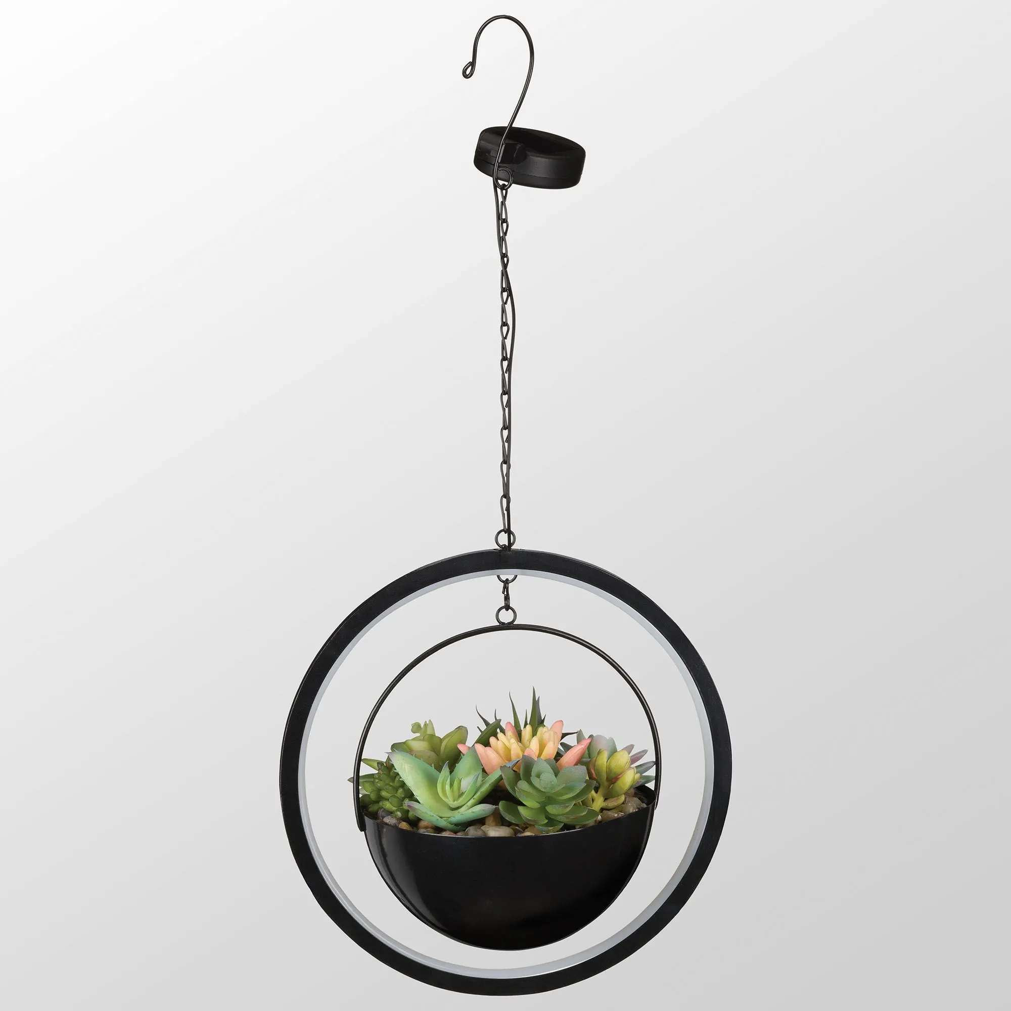 Uniquely light up your space with the Succulent Solar Orb Hanging Lantern. This acrylic, open circle lantern has a black finish and a metal hanging pot with a powder-coat finish that will turn and spin on its own. At night, this outdoor lantern creates a fun look as it illuminates the faux succulent plants in the center. Solar lights also require the included AAA battery. Lantern accent will look great on your patio, in your garden on a shepherd's hook, or hanging in a tree. May be used outdoors year round. Measures 10"Wx7"Dx21.5"H.