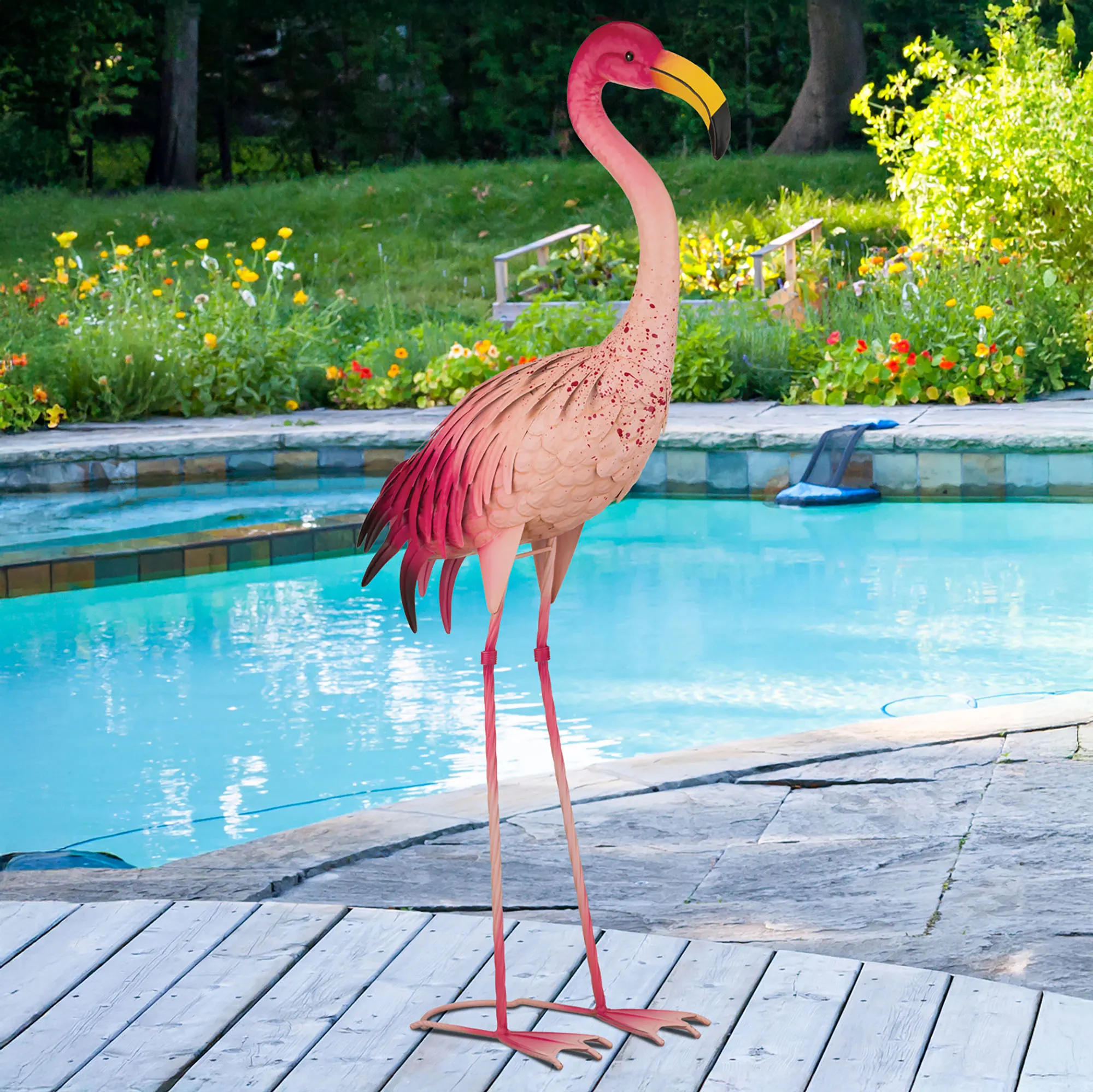 Pink Feathered Flamingo Metal Outdoor Sculpture