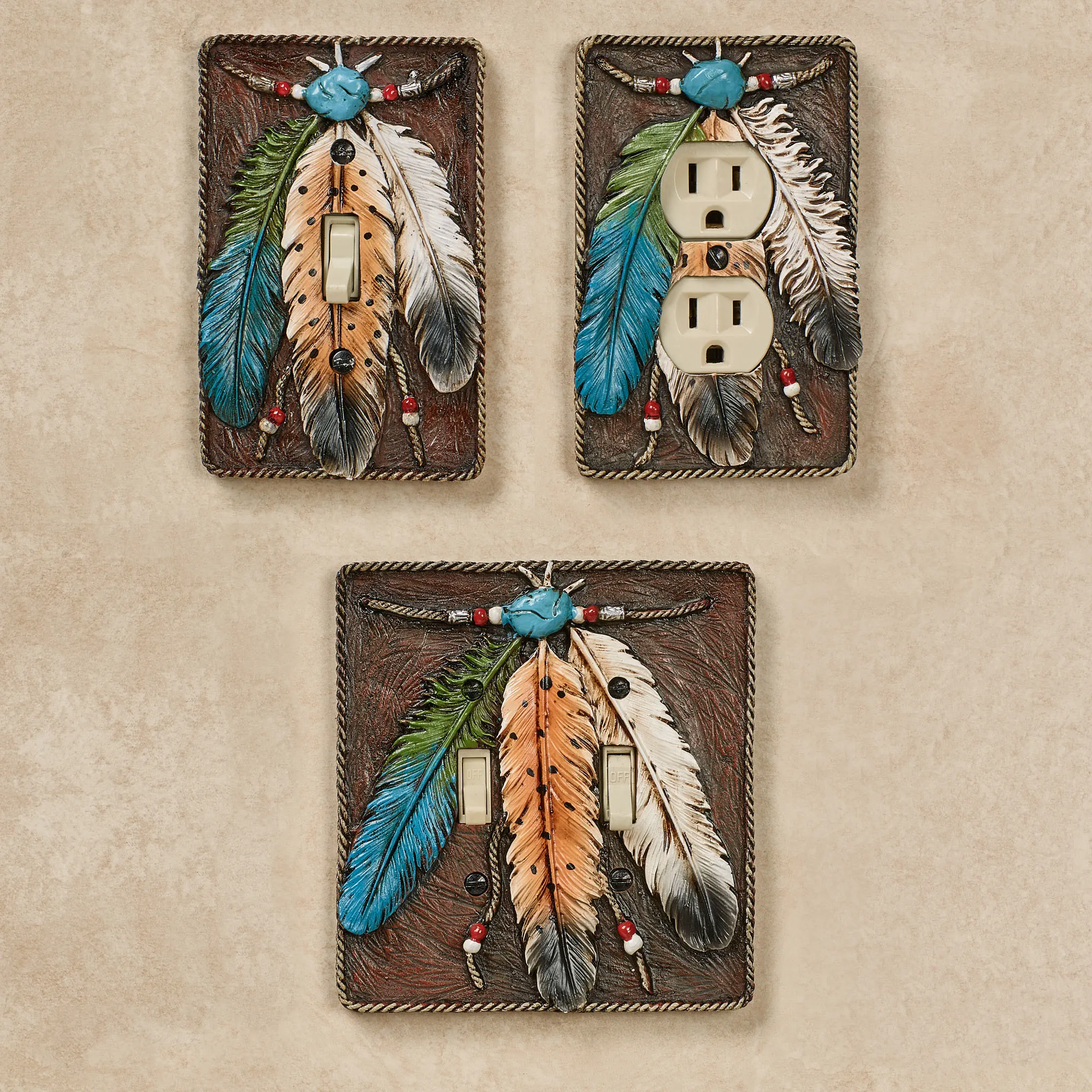 Feathers and twisted motifs on a textured background create an impressive Southwestern display. Made of resin, these brown switchplates have raised designs including feathers, beads, and cords. Colors include black, orange, red, green, blue, and white. Single Switch is 3.25"Wx5"H. Double Switch is 5.25"Wx5.5"H. Single Outlet is 3.25"Wx5"H. Do not over-tighten screws.