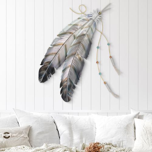 • Features two feathers with a silver finish and bronze-toned heat patines