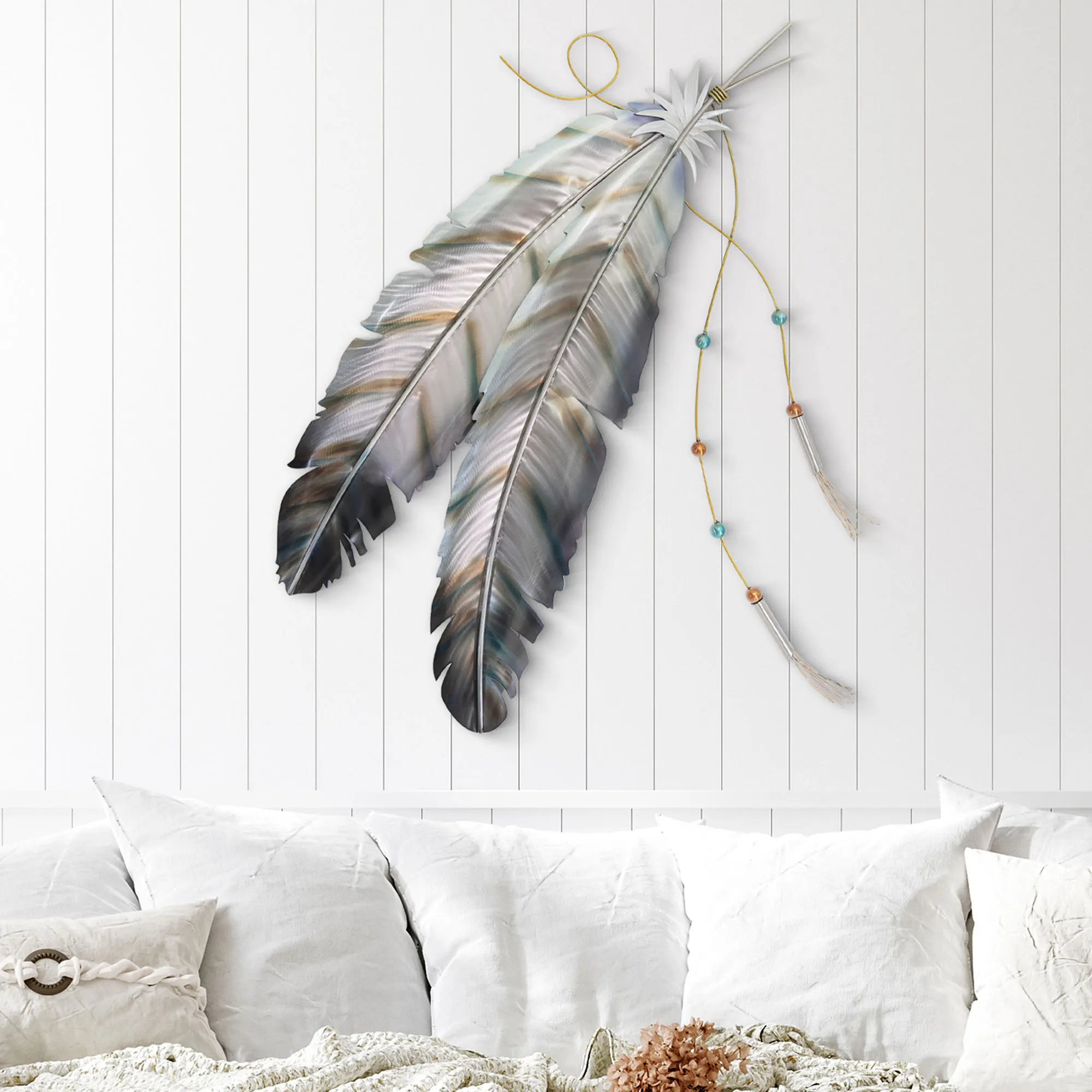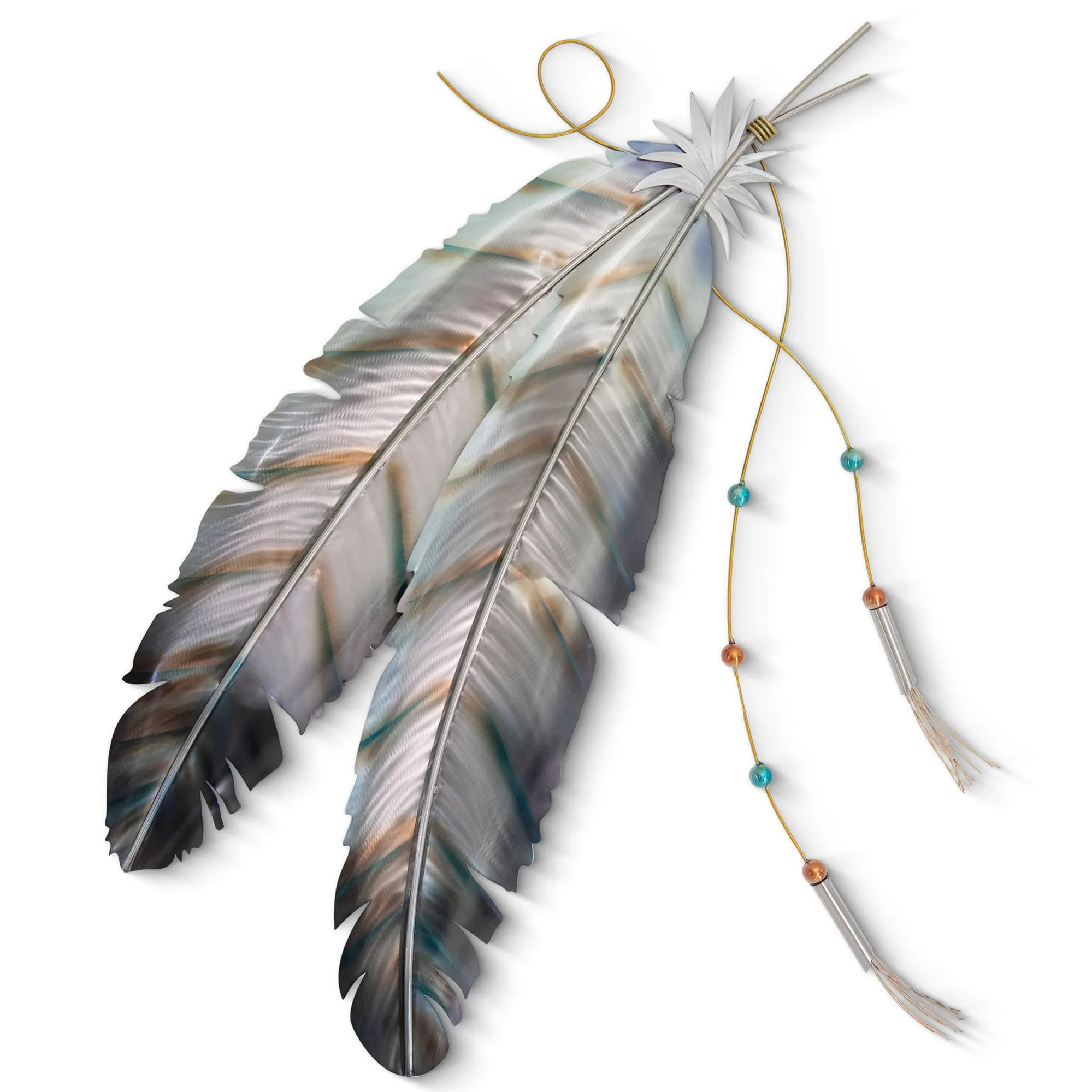 Focus on the unique beauty of the Feathers Wall Sculpture. This handcrafted stainless steel wall sculpture, by M. Malizia, features two feathers with a hand-ground, hand-flamed, and hand-finished silver finish and bronze-toned heat patinas. The gold rope has aqua and orange bead and tassel accents. Wall art is suitable for indoor or covered outdoor use. Feathers wall sculpture measures 35"Wx2"Dx41"H.