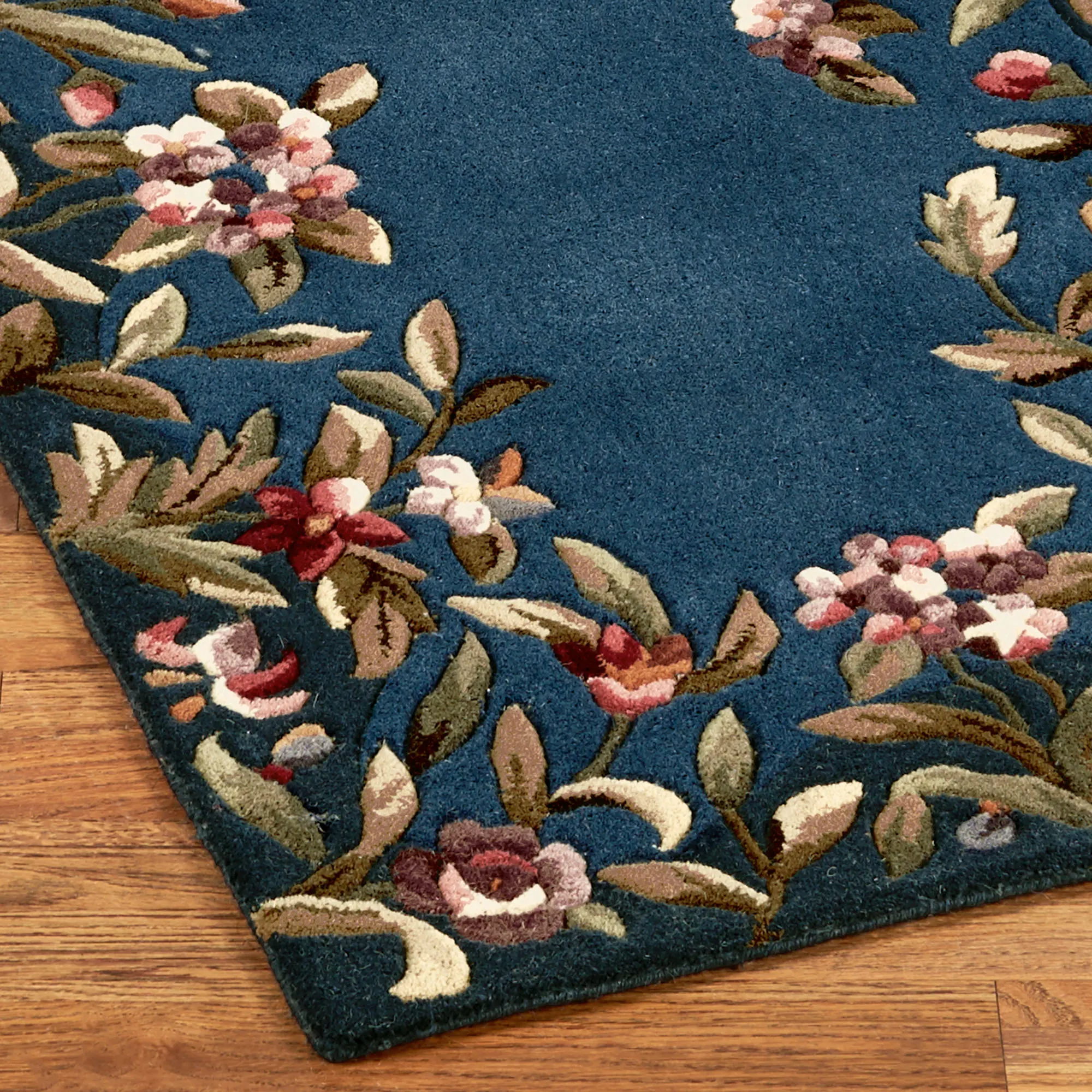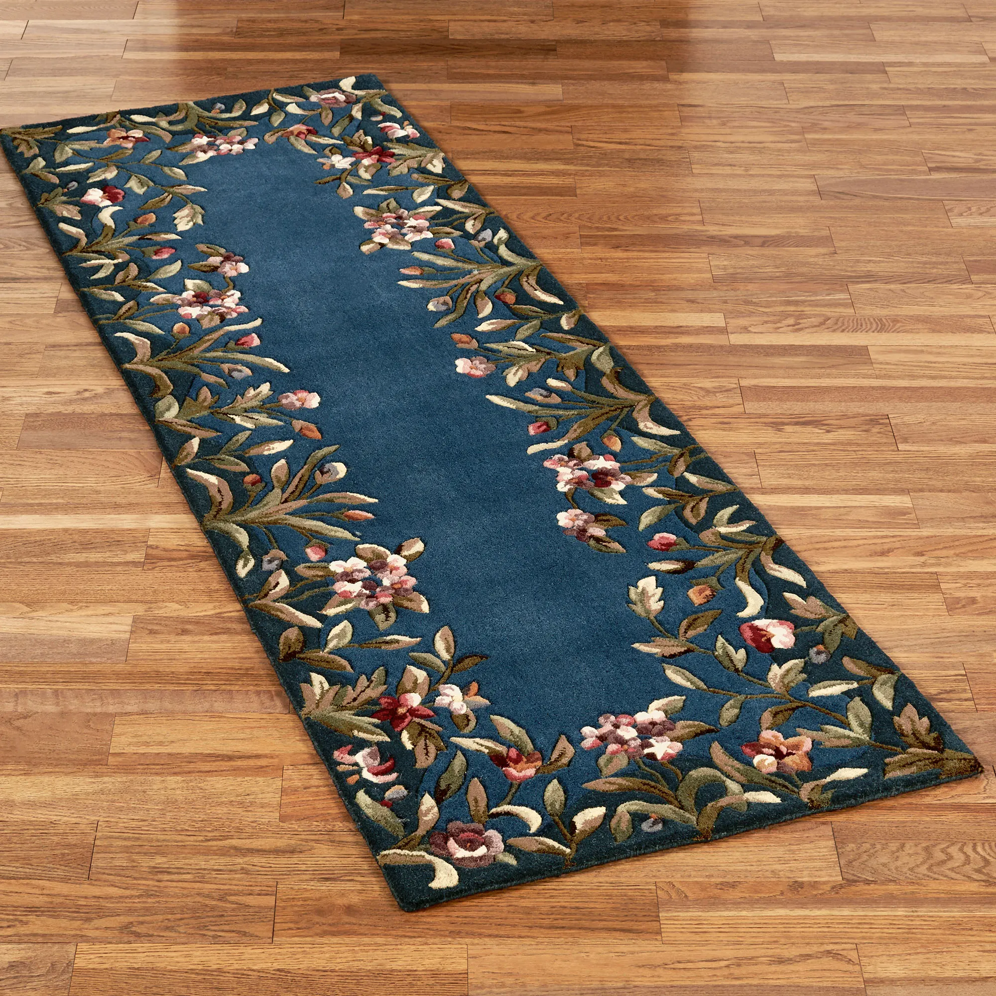 The Felisha Floral Border Rug Runners bring a summer garden to your home. Wool area rugs, .5" thick, are skillfully hand-tufted. Outer floral border designs are on a solid ground. Handcarving adds dimension to the floral and foliage designs. Accent colors include buttercup, rose, sage, lilac, plum, peach, burgundy, cedar, and ivory. Indigo has a midnight blue outer border. Lavender has a dark purple outer border. Sage has a dark dusty sage outer border. Backing is cotton-covered latex. Due to the handcrafted nature, slight variations may occur. We recommend professional cleaning by a rug cleaner. Imported.