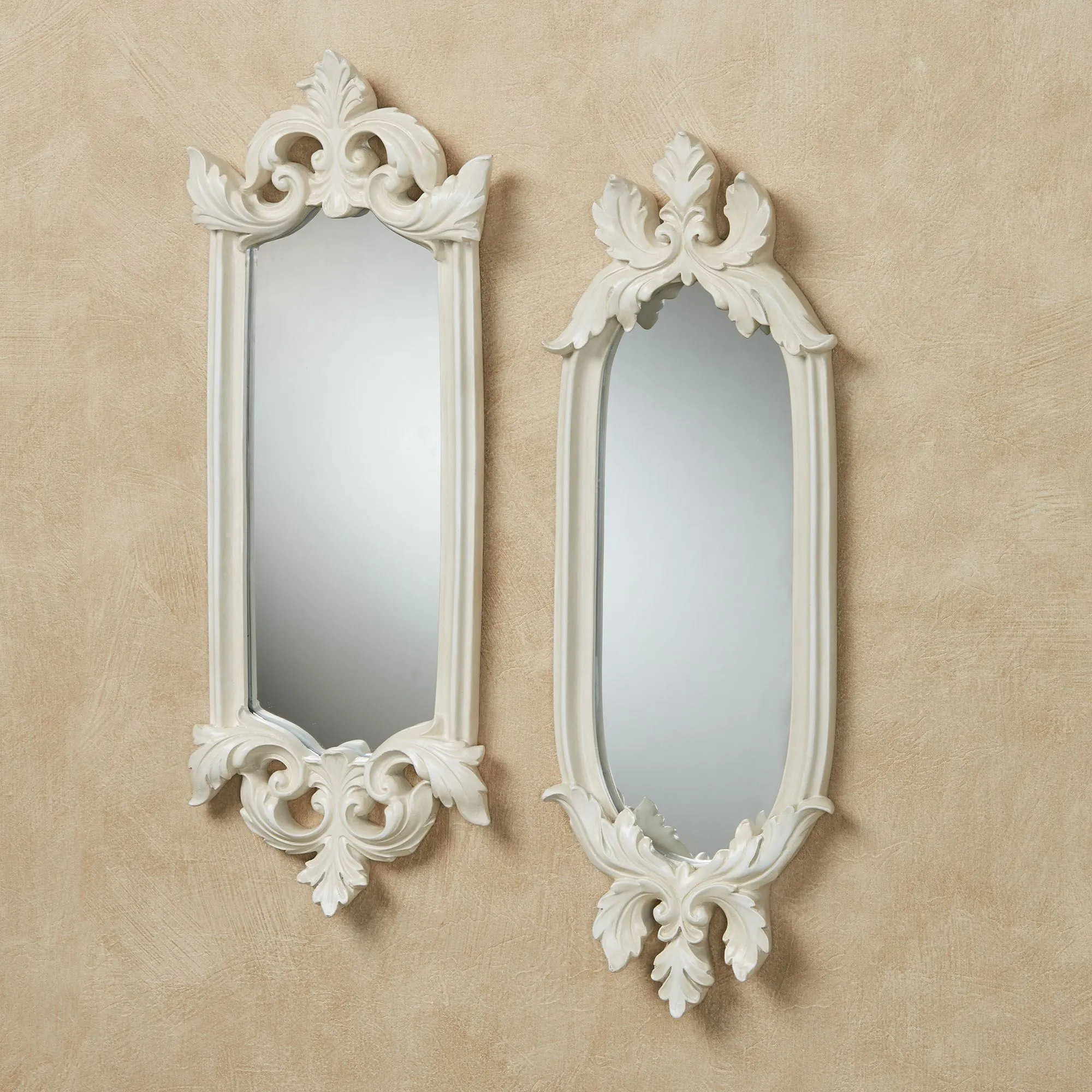 The rich appearance of the Felissia Accent Wall Mirror Set makes any wall look regally elegant. These resin wall mirrors have a stunning antique white finish and acanthus leaf accents. Each is approx. 6.5"Wx1.5"Dx16"H.