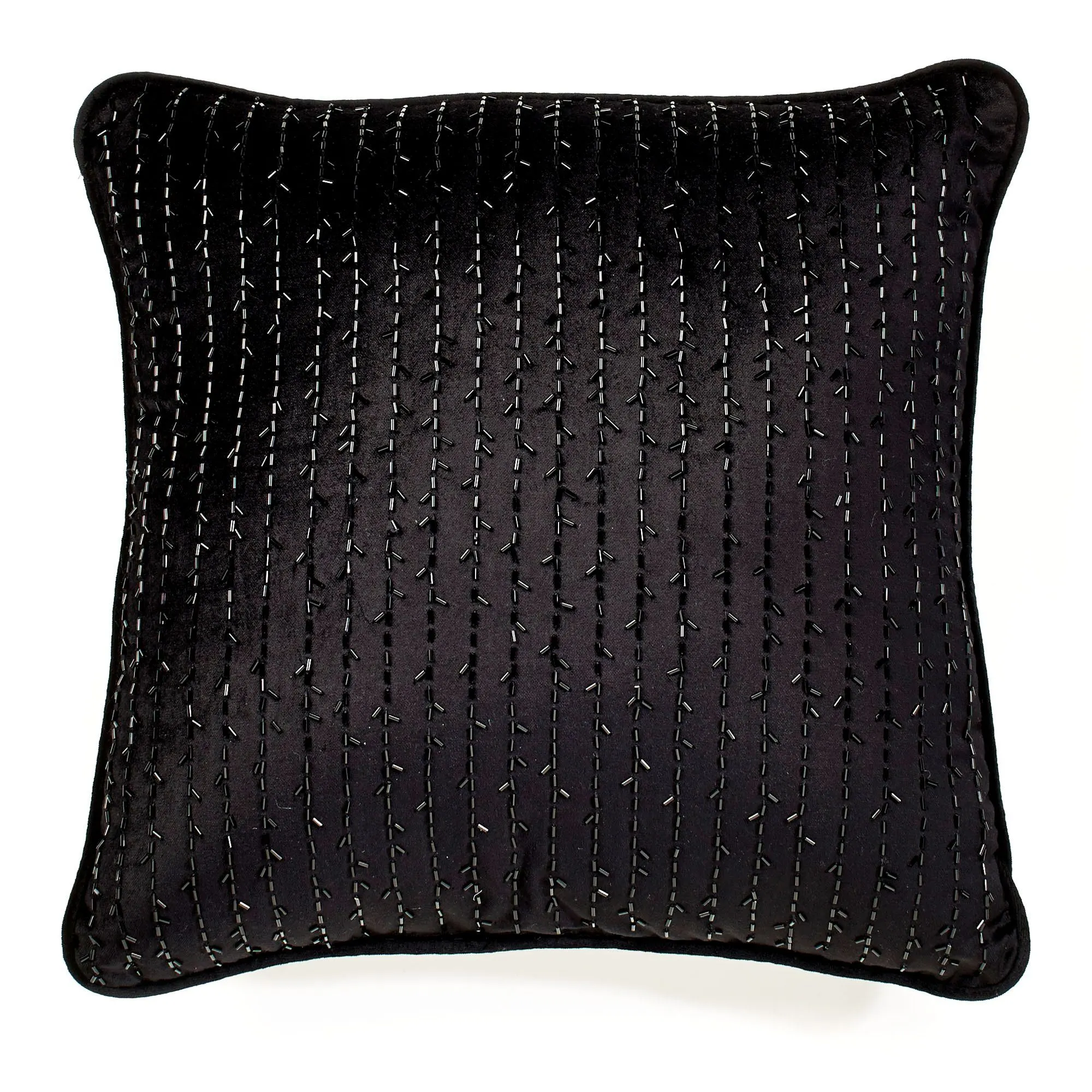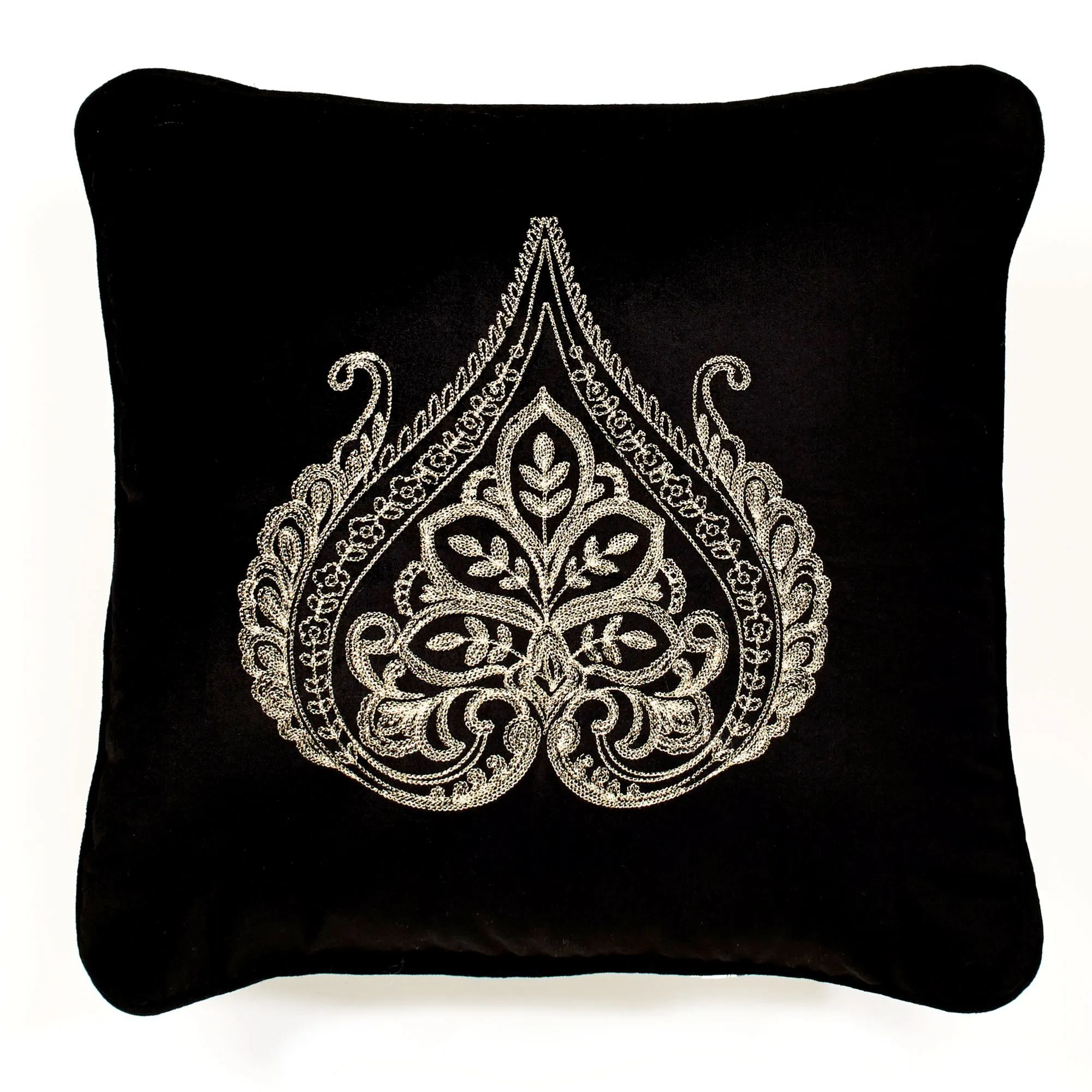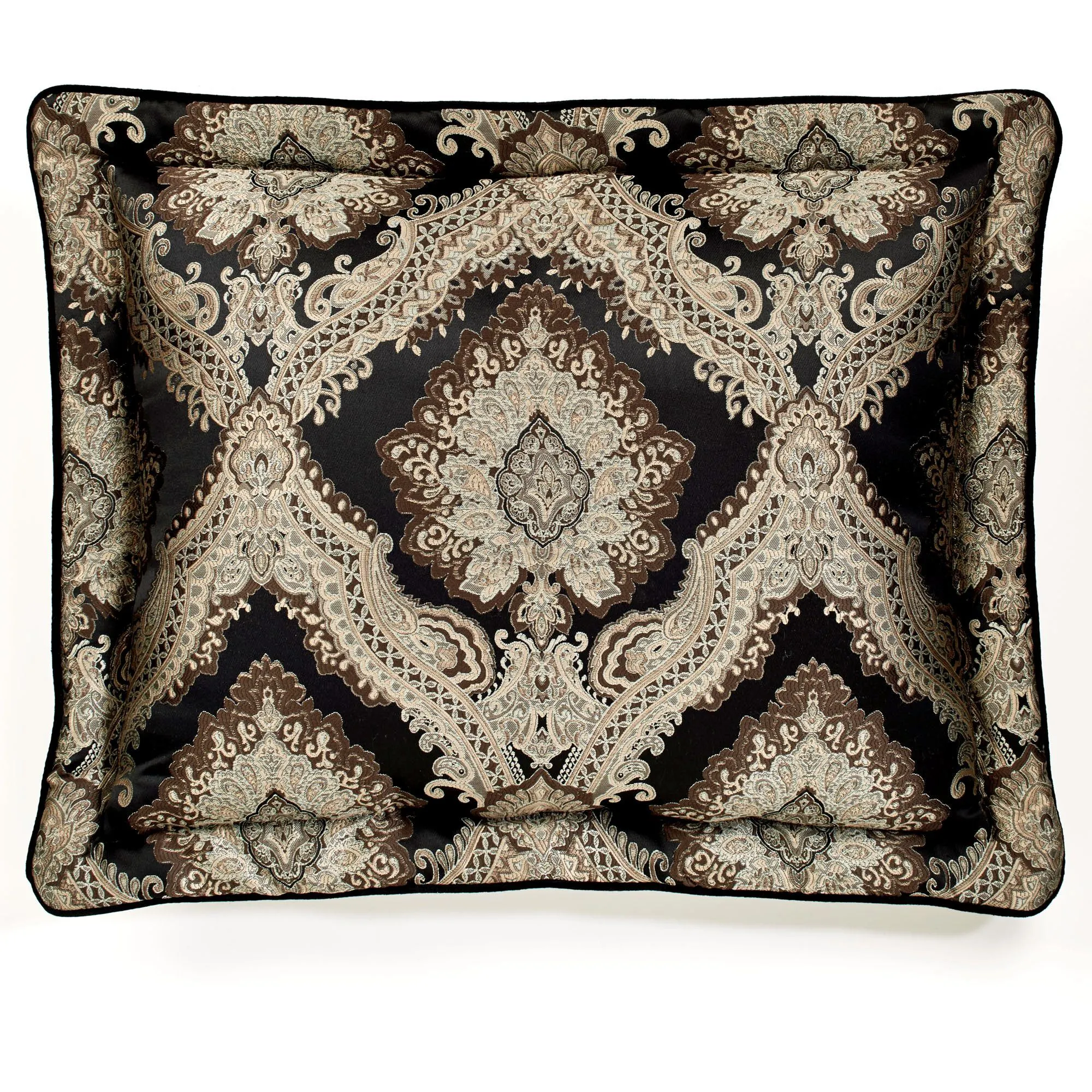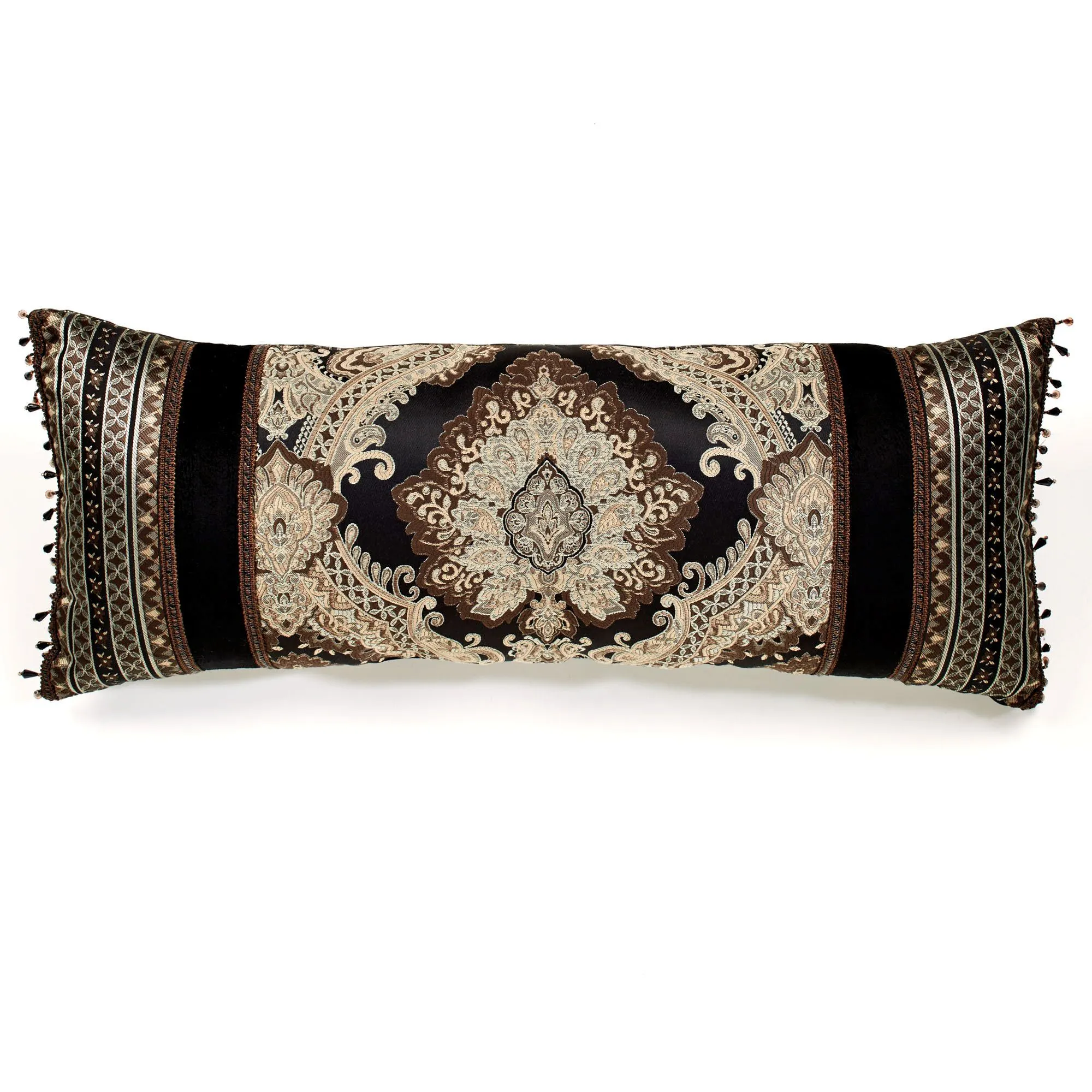 Pillows: Spot clean. Piped Embroidered Square is solid black velveteen and has an embroidered scroll medallion. Tailored Square is solid black velveteen with buggle bead accents. Piped Damask Square mimics the comforter and reverses to coordinating woven stripes. Rectangle has damask designs, woven stripes, gimp trim, velveteen bands, and bead accents; pillow is reversible to stripes.