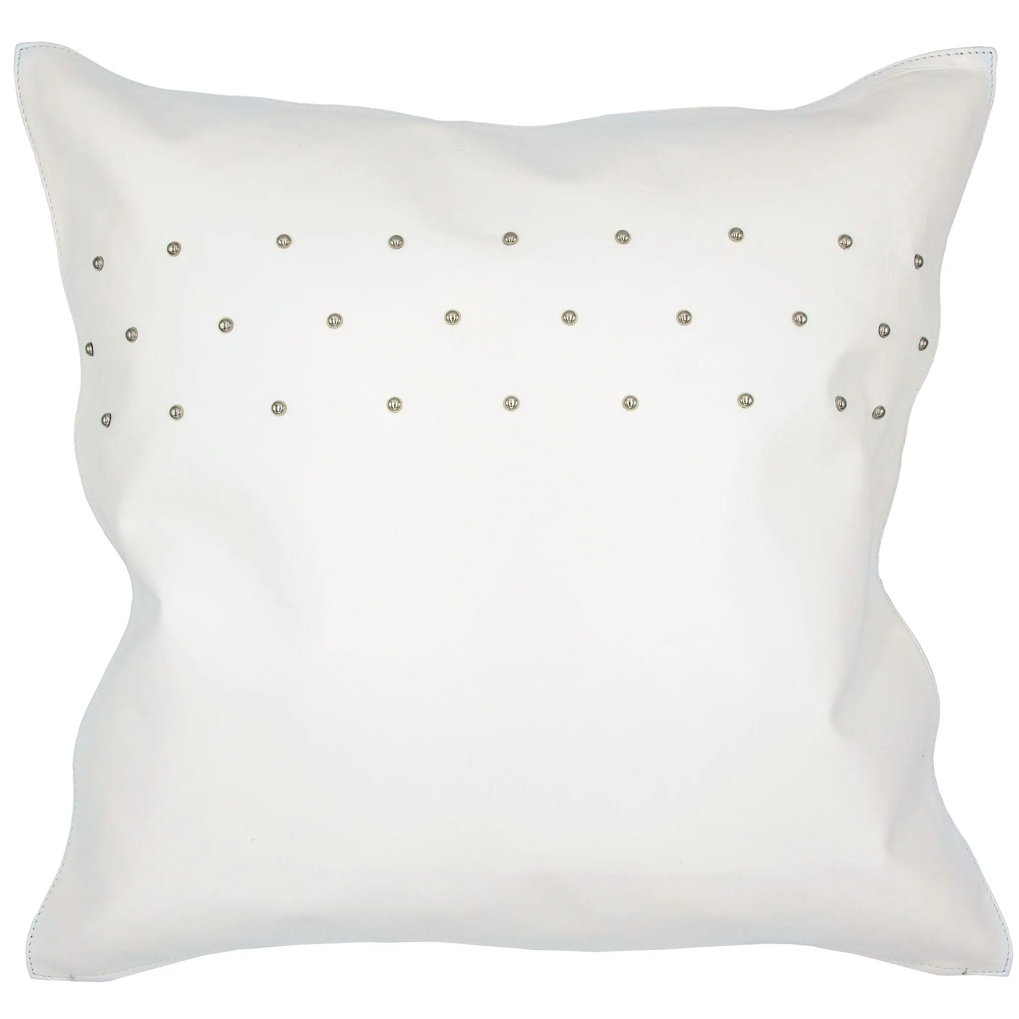 Pillows have zipper closures and waterfowl feather inserts. Rectangle is channel-quilted stonewashed gray velvet cotton with bound edges. Tailored Square is off-white leather with silver metal stud accents.