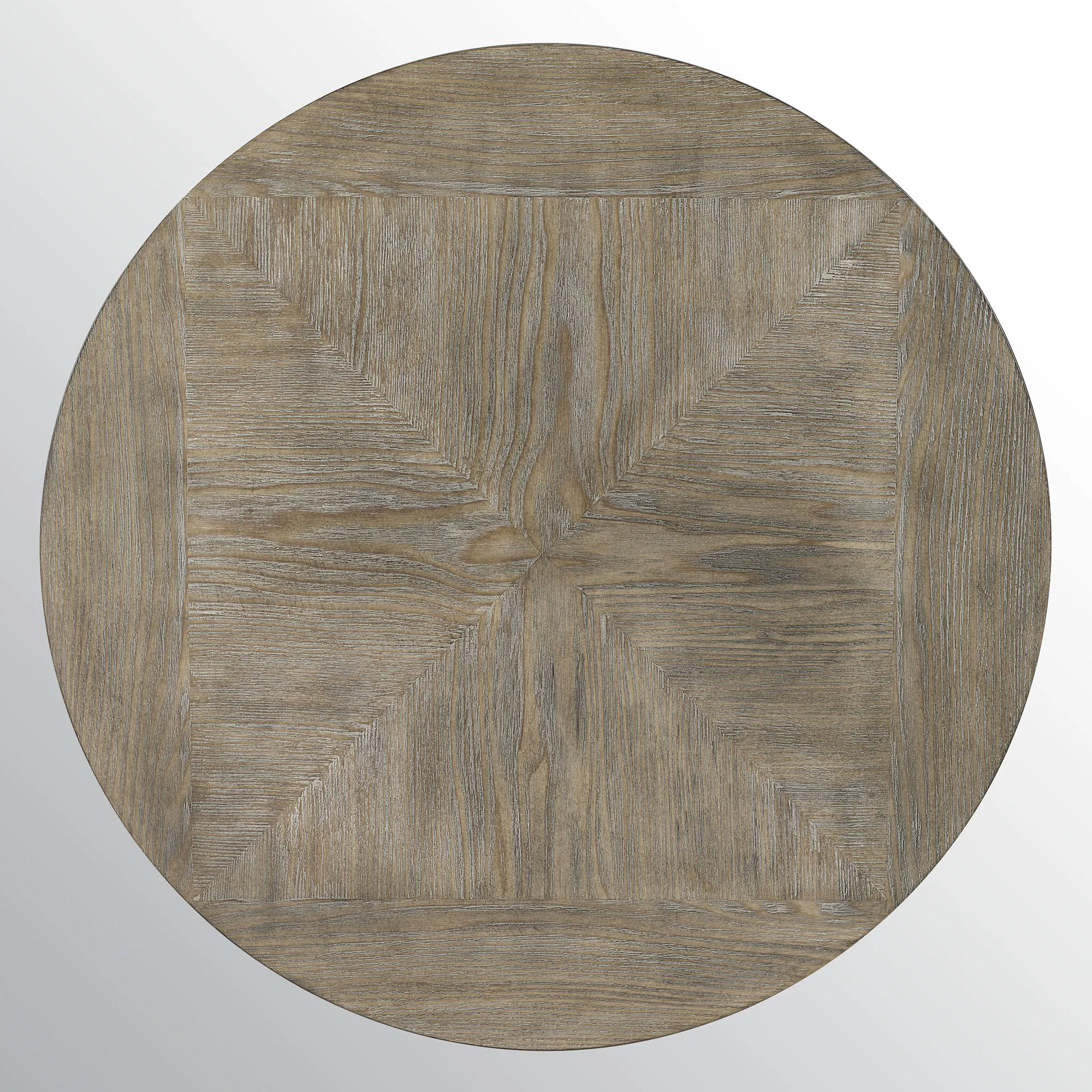 Elements converge with a stylized industrial feel in the Ferdinand Accent Table. With two wooden surfaces, the round accent table features ash veneer in a subtle gray hue complemented by the gunmetal powder-coated flaring metal table legs and round hardware accents. The 24" dia. tabletop provides ample space with a charming inlaid geometric woodgrain pattern. The lower shelf measures 12" dia. Maximum weight recommended is 100 lbs. Overall, the side table measures 24"dia.x23"H and weighs approx. 22 lbs.