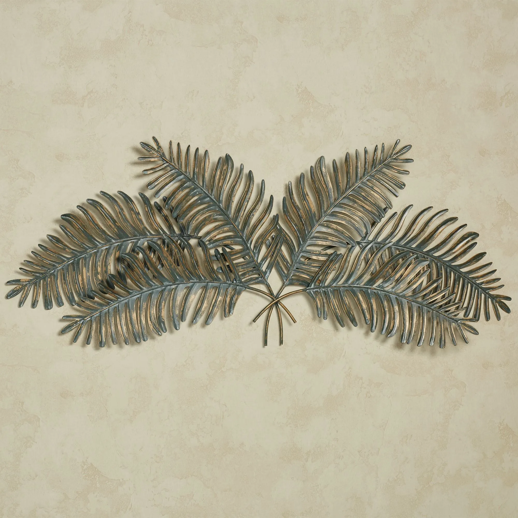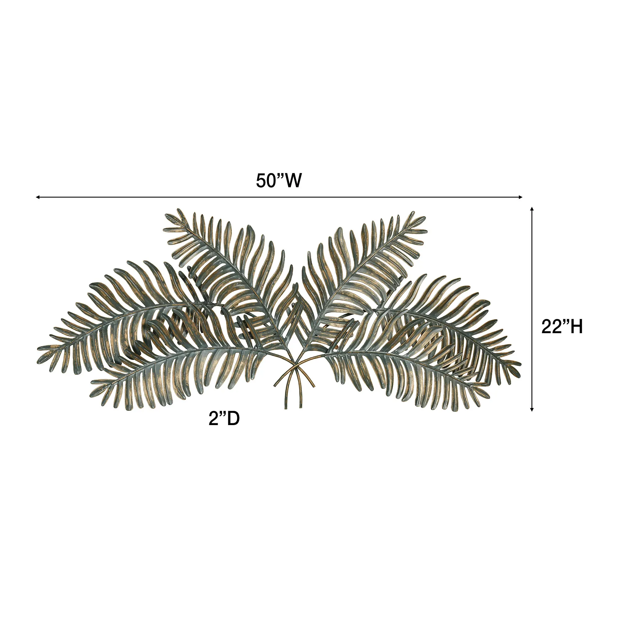 Swaying Fern Fronds add tropical vibes to your decor. This metal wall topper has a verdi green finish with gold accents. Measures 50"Wx2"Dx22"H.