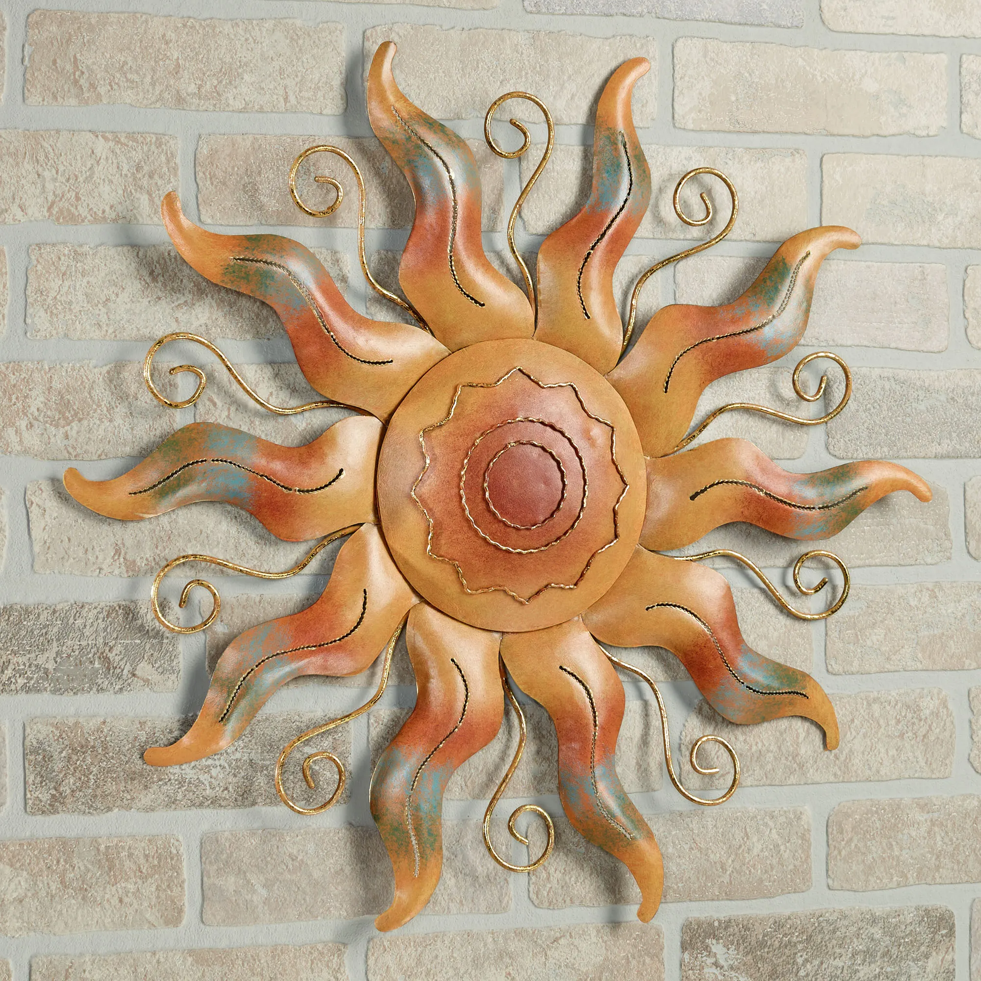 The lively Fiesta Sun Indoor/Outdoor Wall Art heats up your home with a fun, zesty charm. Handcrafted metal wall art features a sun with wavy rays and spiraling wires in between. Handpainted orange tones radiate out from the center with aqua toward the tips of the rays. Due to the handcrafted nature of this item, minor variations may occur. Sun wall art measures 22"dia.x1.5"D.