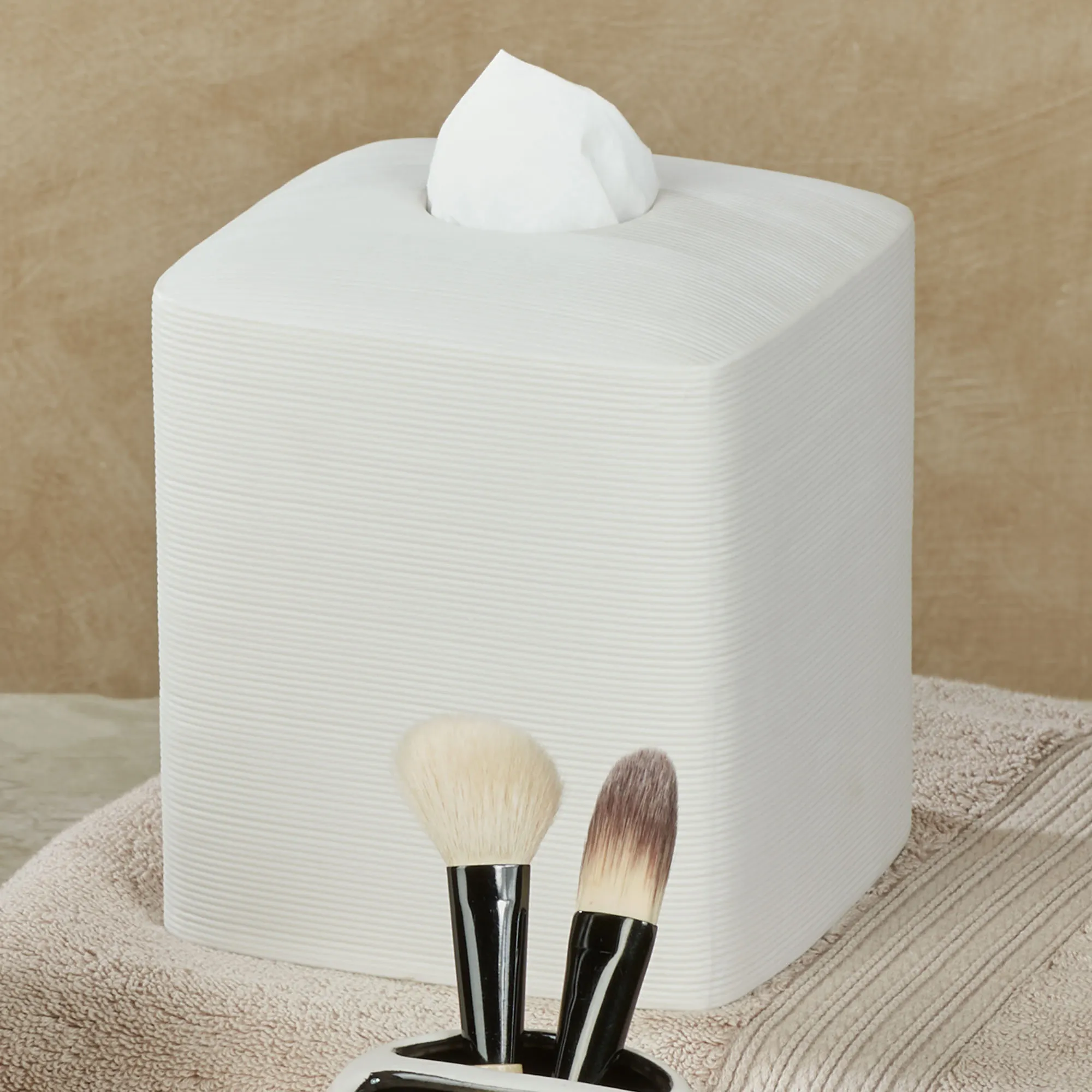 The Fillmore Bath Accessories decorate with a sophisticated style. These ivory porcelain accents have a ribbed texture. Most have a glossy black interior (the Lotion/Soap Dispenser does not). The Brush Holder can hold makeup brushes or toothbrushes. Specify Wastebasket, Tissue Cover, Tray, Lotion/Soap Dispenser, Covered Jar, Brush Holder, or Soap Dish.