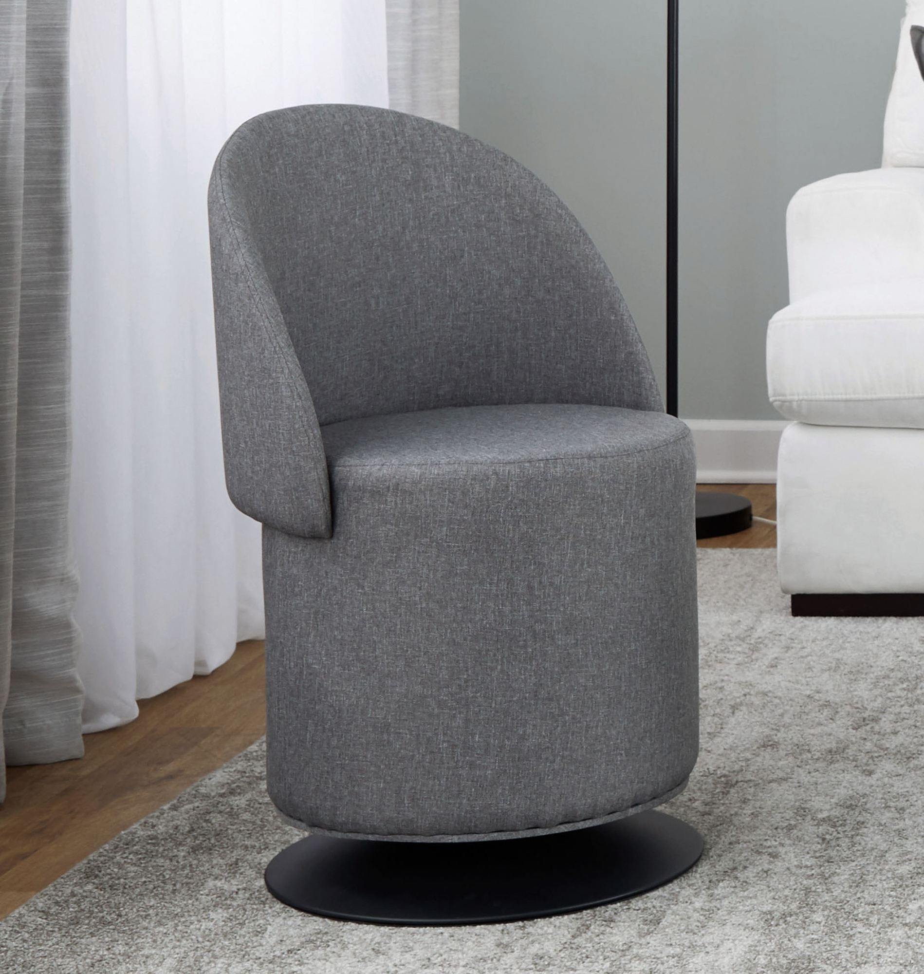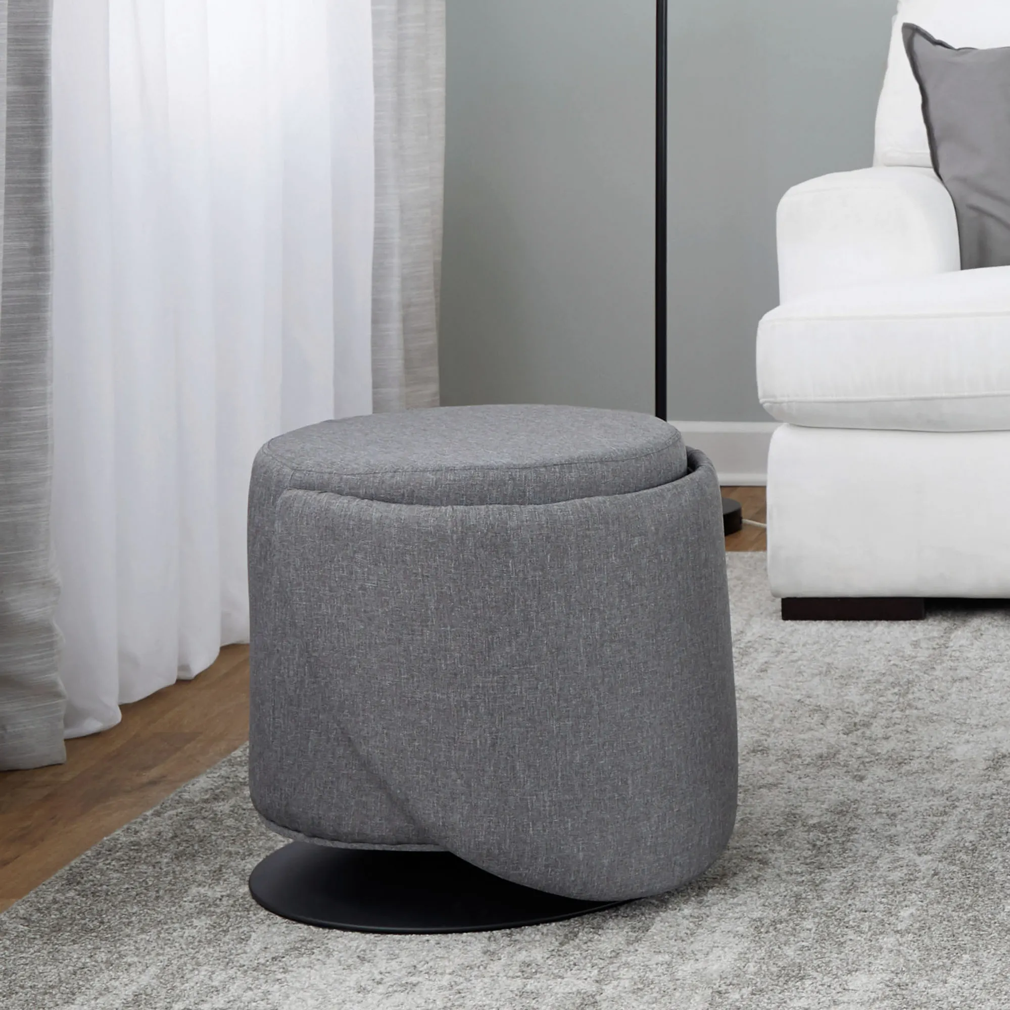 The Finch Chair easily converts into a stylish ottoman or charming supportive seating. On a black metal base, the round furnishing features a foam-cushioned design and gray woven polyester fabric. The curved back folds upright to create a comfortable armless chair or folds down for easy storage or use as an ottoman. The swiveling design also rotates a full 360 degrees. Seat height is 18". Maximum weight capacity is 250 lbs. Overall, the chair measures 21.5"Wx18.5"Dx30.5"H and weighs approx. 21 lbs. Spot clean the fabric.