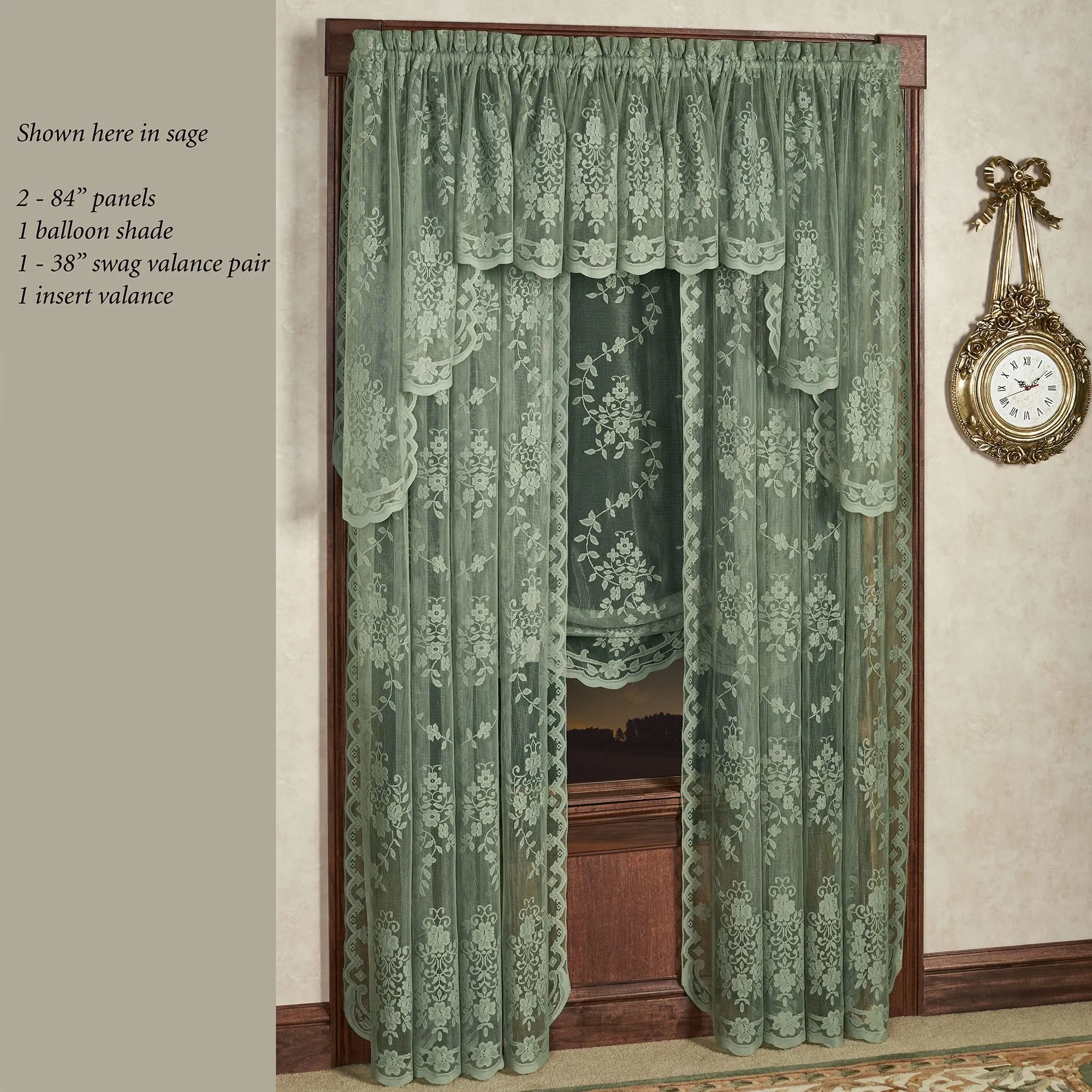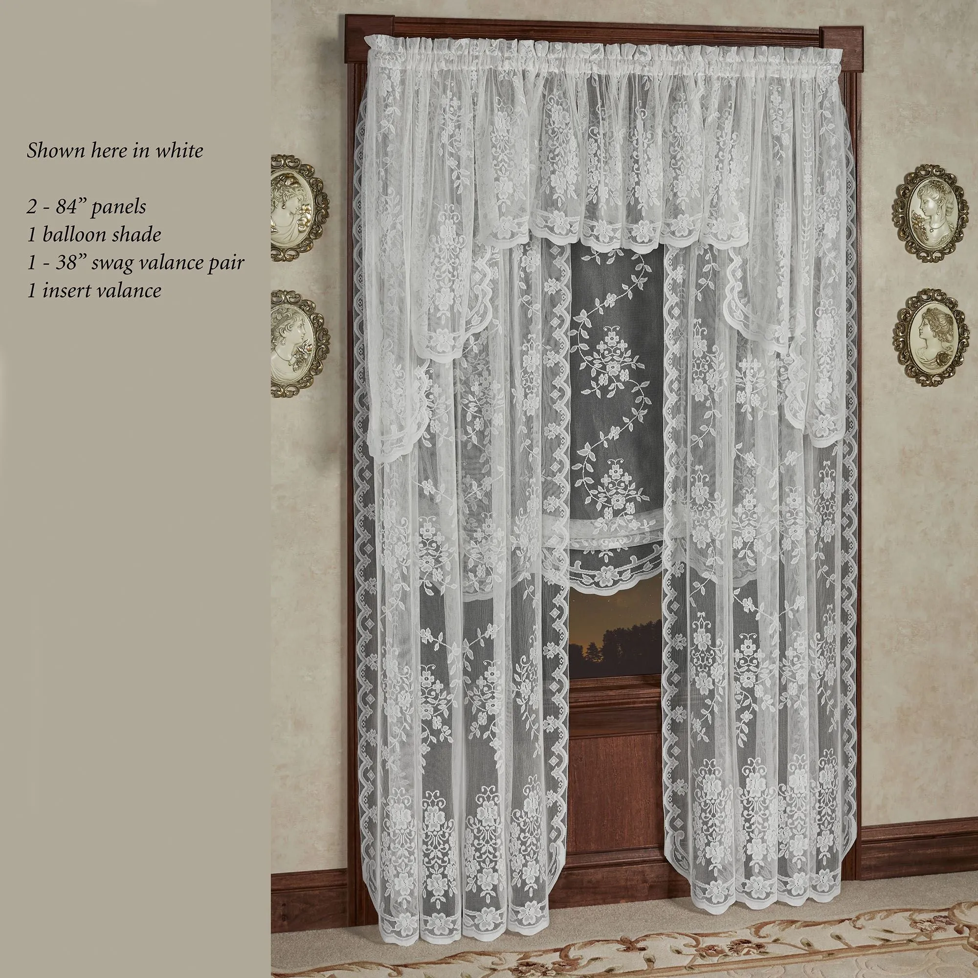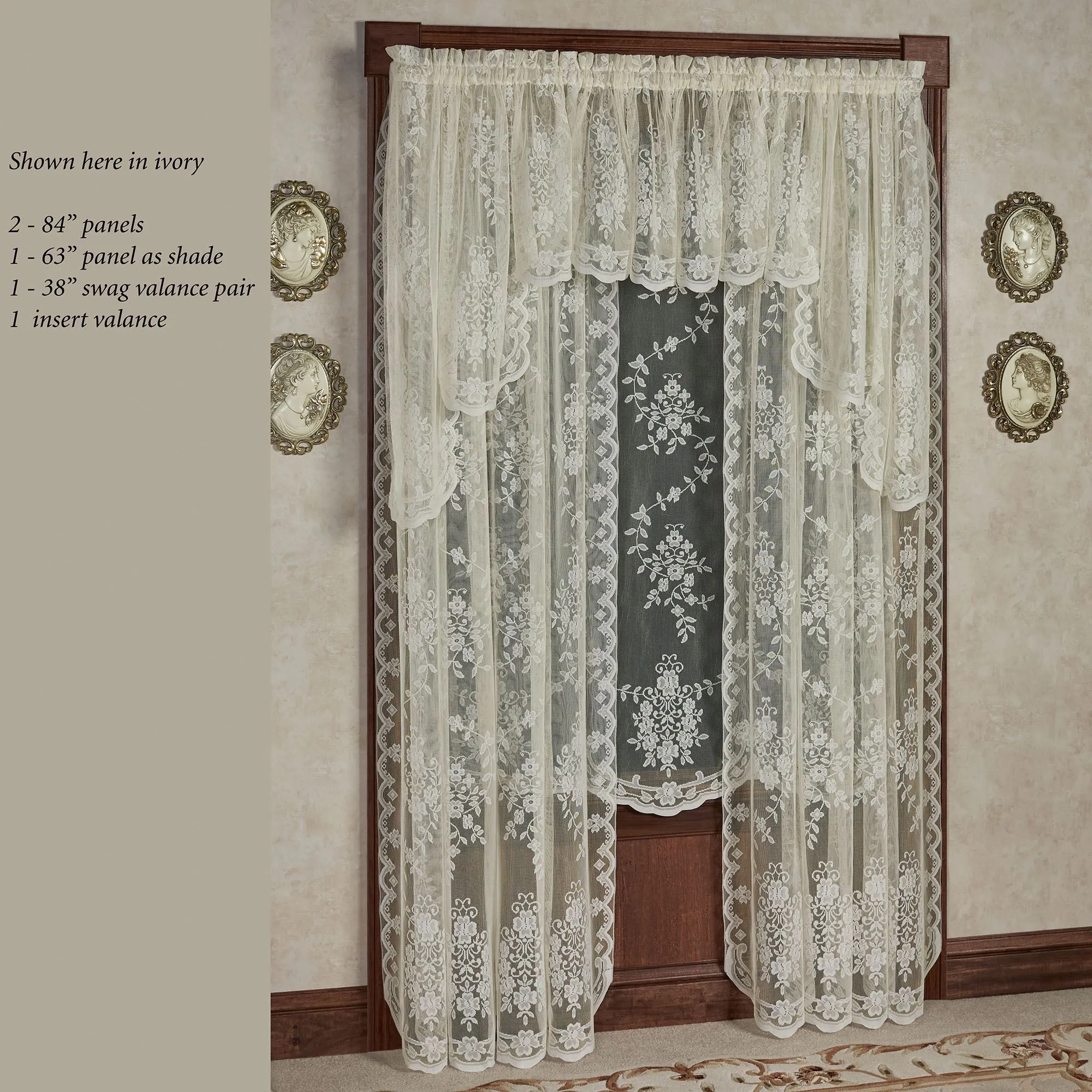 The Fiona II Window Treatment is inspired by a timeless Scottish lace pattern. Easy-care polyester window treatment features floral motifs, vine designs, and scalloped bottom edges. Rod pocket is 1.75". Choose Curtain Panel, Balloon Shade, Swag Valance Pair, Insert Valance, or Tuck Valance. Balloon Shade has rings on the back to adjust the length. Click on the Sizes tab for measurements. Machine washable. Imported.