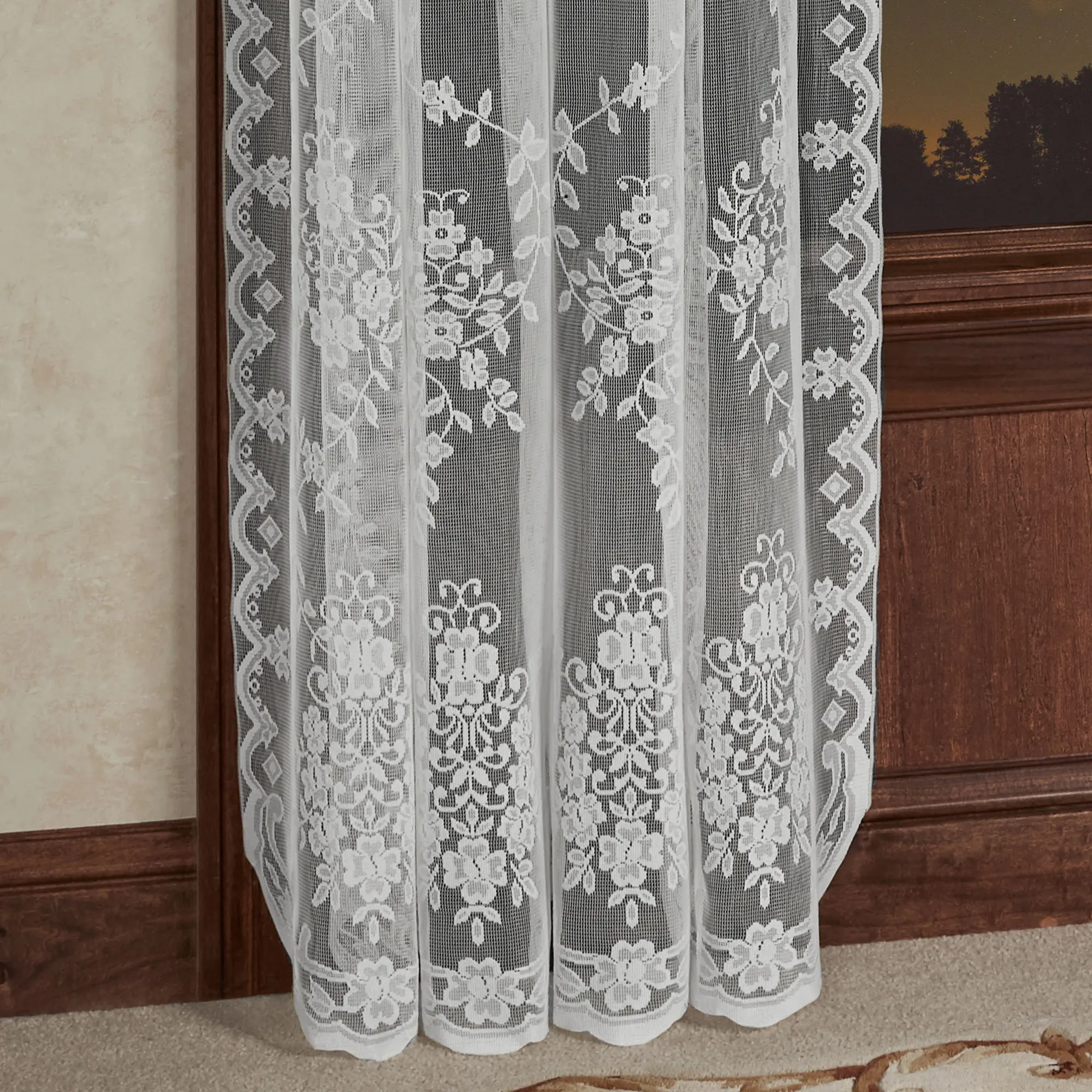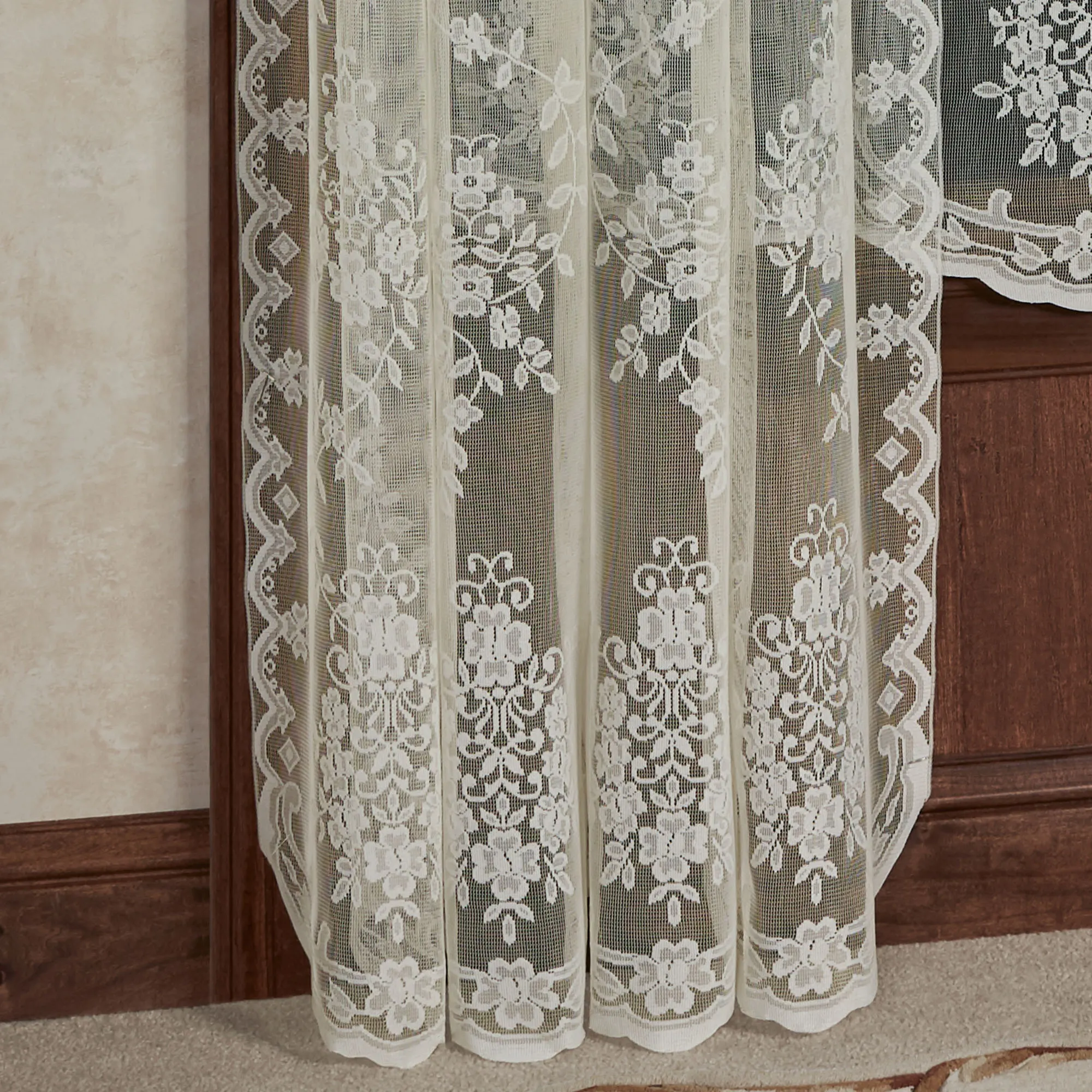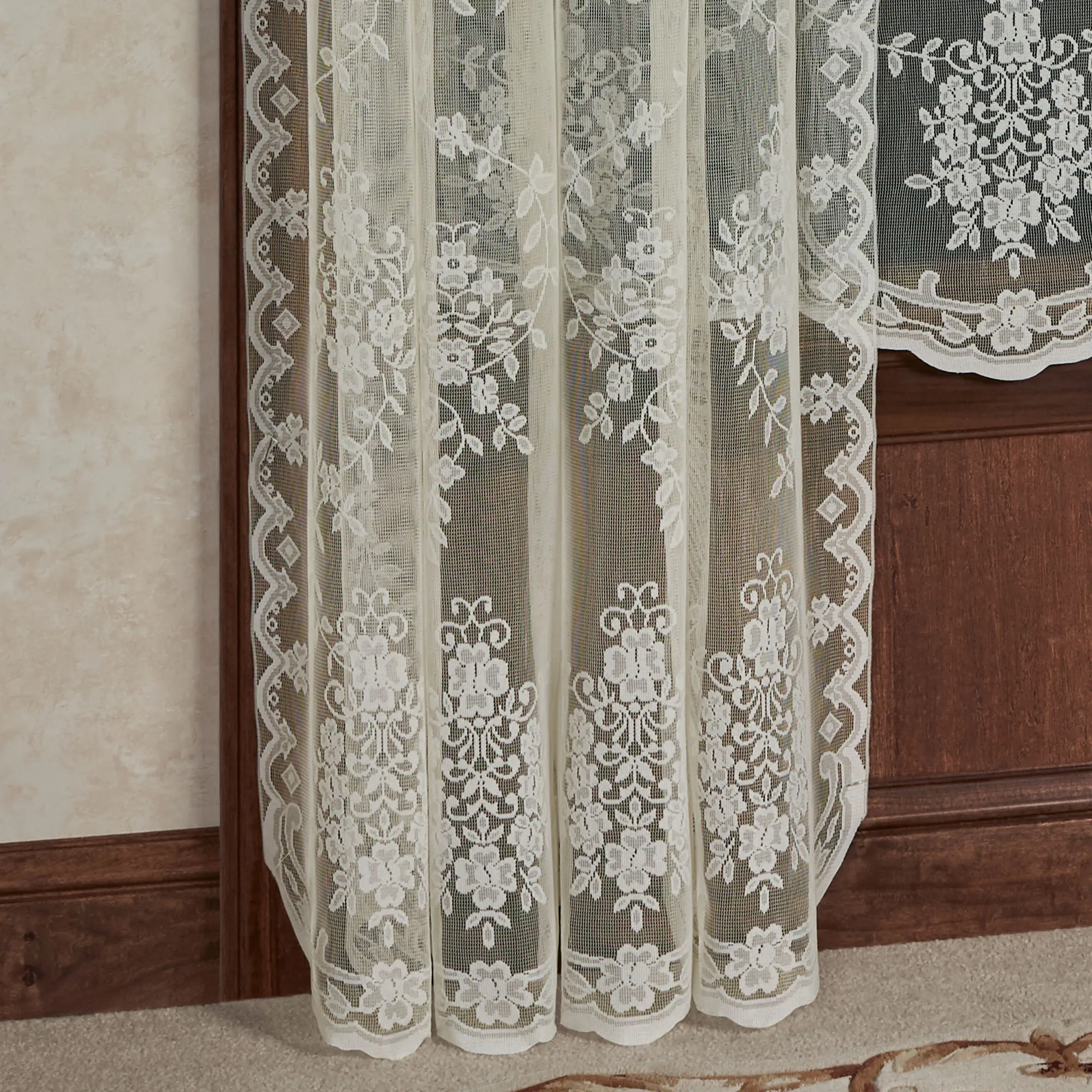 The Fiona II Window Treatment is inspired by a timeless Scottish lace pattern. Easy-care polyester window treatment features floral motifs, vine designs, and scalloped bottom edges. Rod pocket is 1.75". Choose Curtain Panel, Balloon Shade, Swag Valance Pair, Insert Valance, or Tuck Valance. Balloon Shade has rings on the back to adjust the length. Click on the Sizes tab for measurements. Machine washable. Imported.