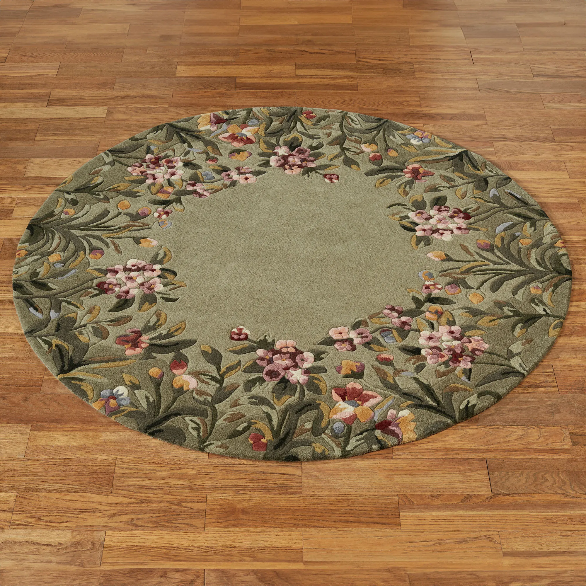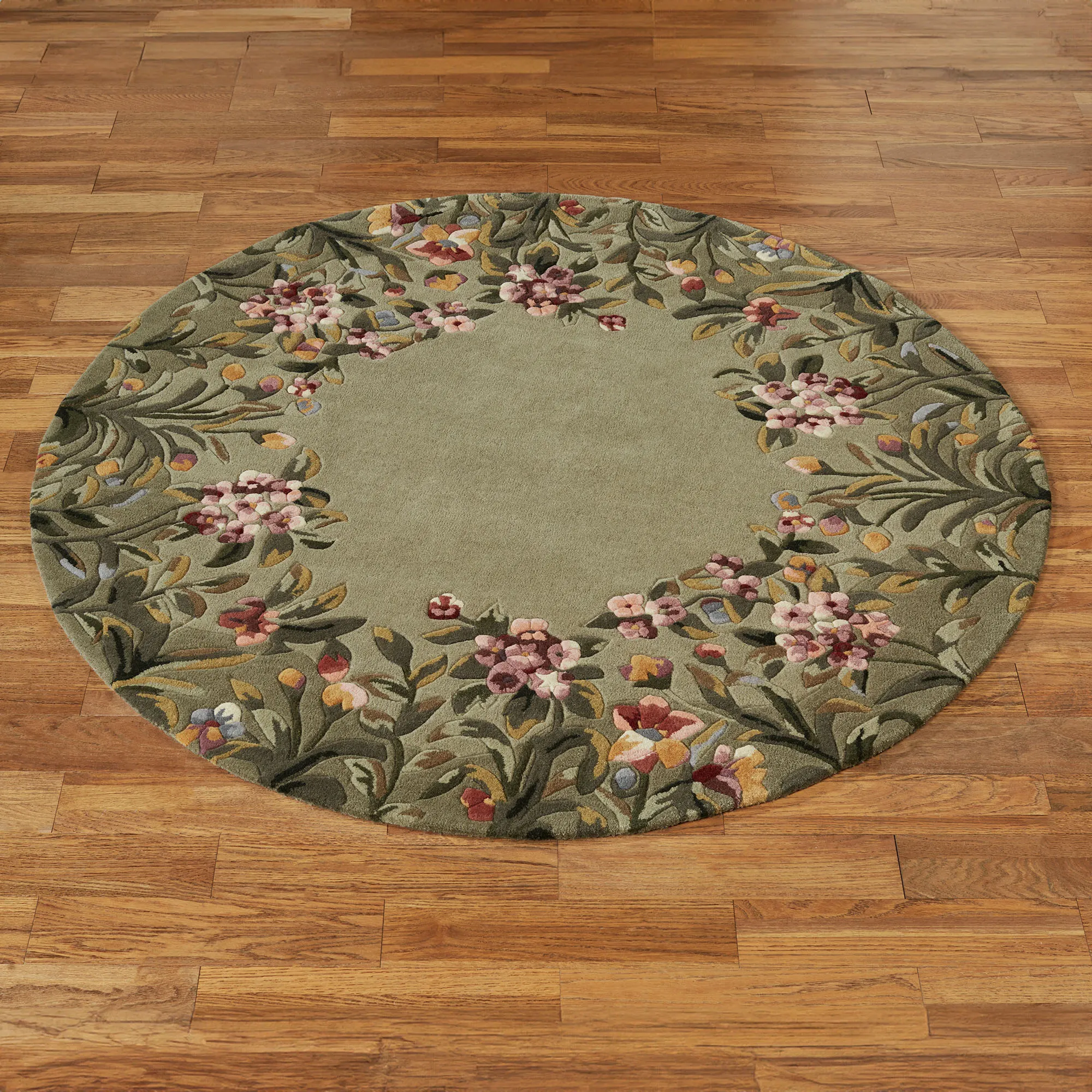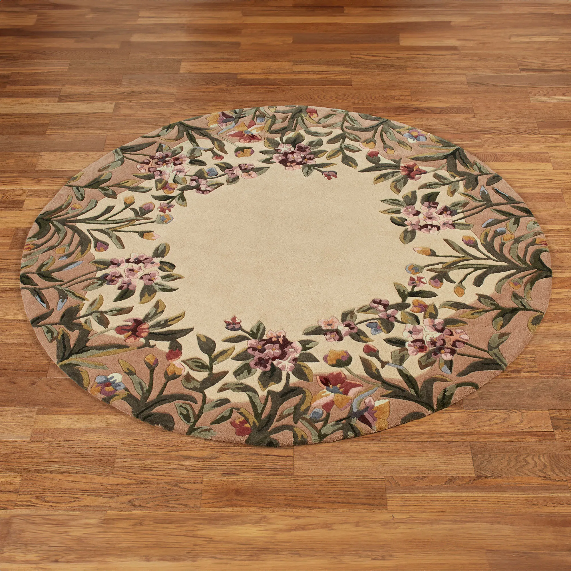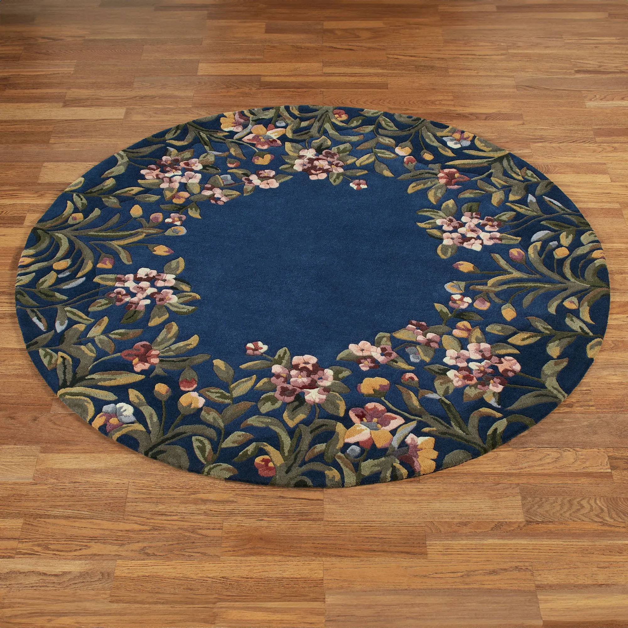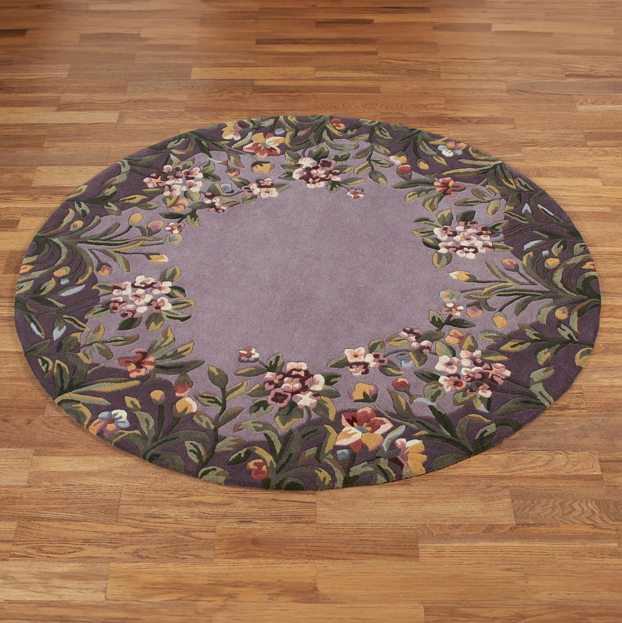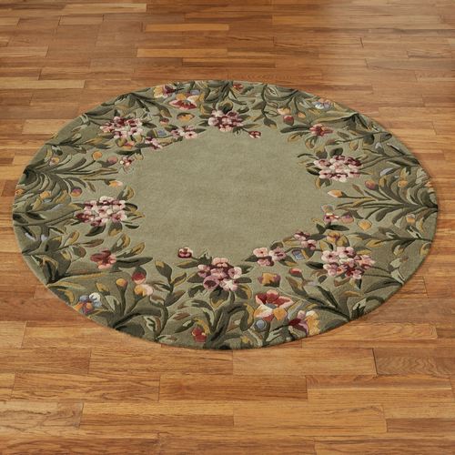 A summer garden always blooms beautifully on the Fiona Floral Round Rug. The hand-tufted and handcarved wool rug, .75" thick, features floral and foliage designs. Colors include shades of buttercup, rose, sage, lilac, plum, peach, burgundy, cedar, and ivory. Beige has a beige center and a mocha outer border. Indigo has an indigo center and a midnight blue outer border. Lavender has a lavender center and a dark purple outer border. Sage has a light dusty sage center and a dark dusty sage outer border. Backing is cloth-covered latex. We recommend professional cleaning by a rug cleaner. Imported.