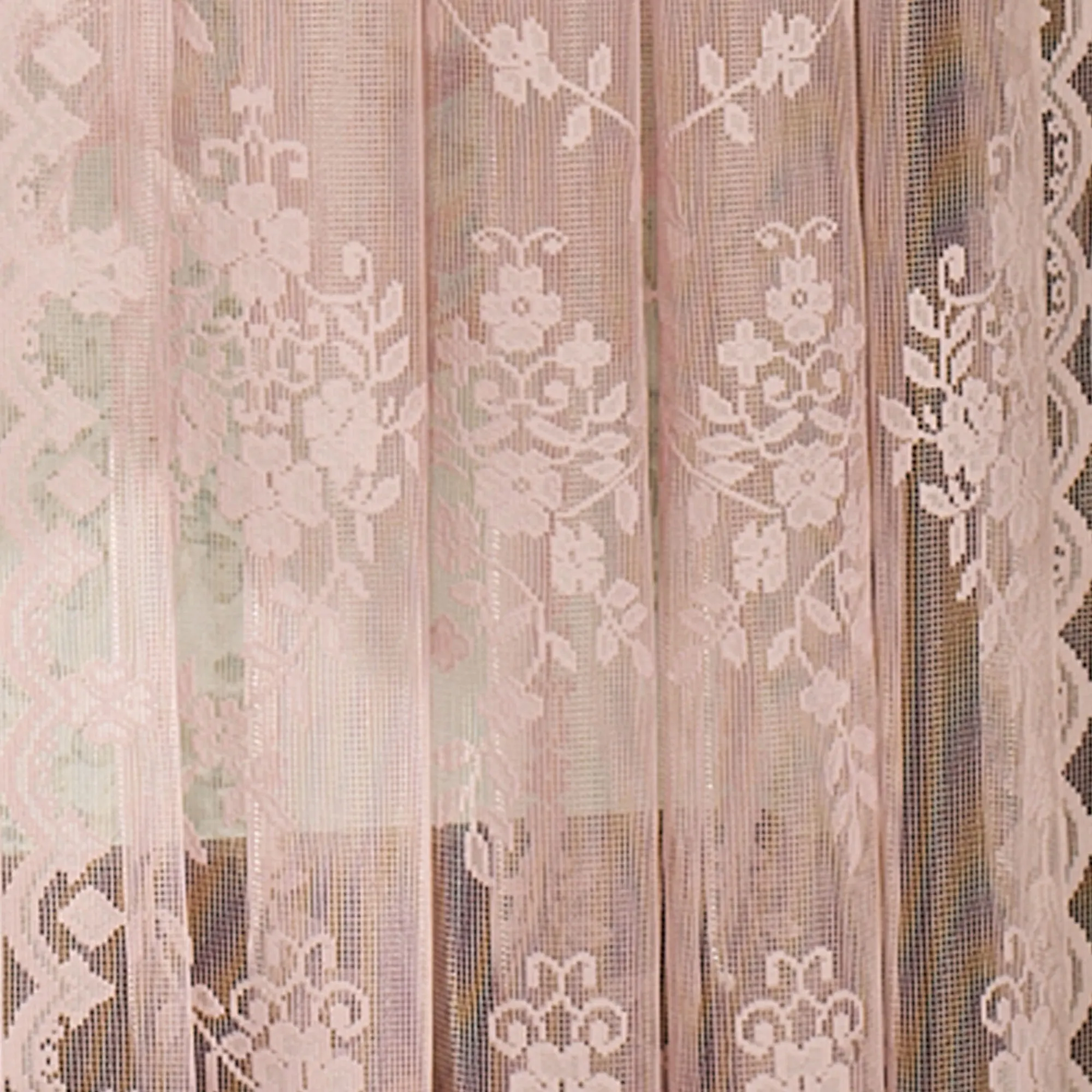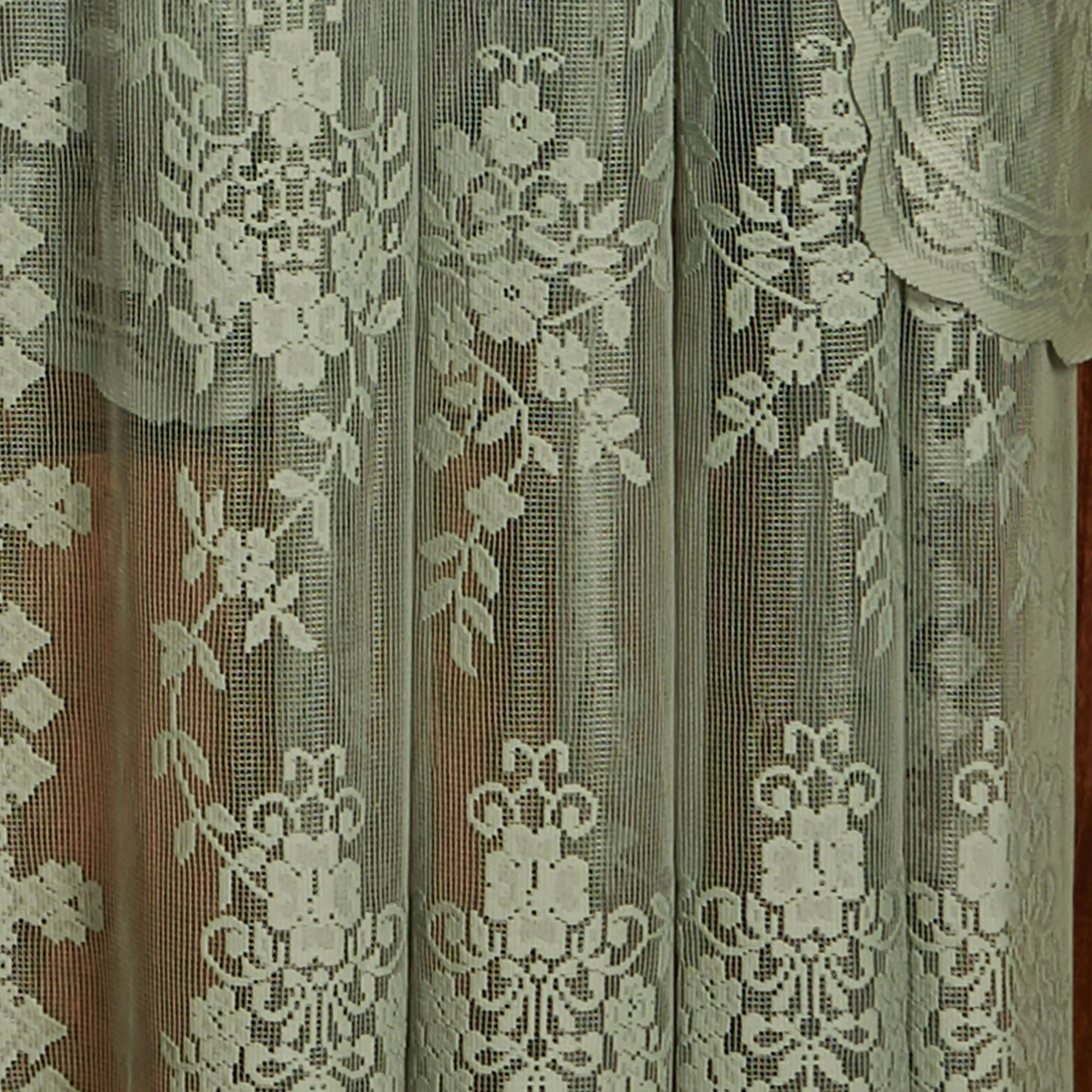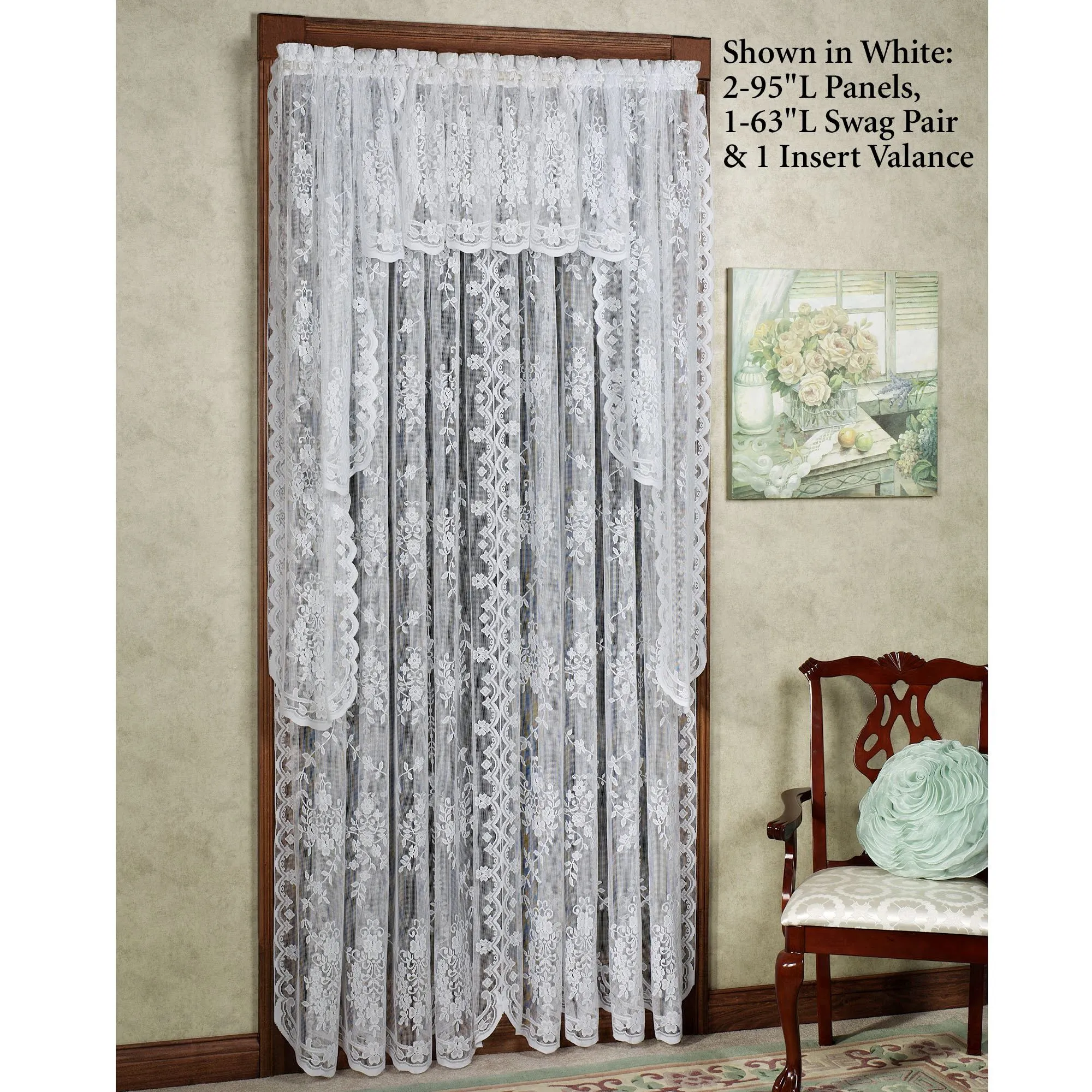 Inspired by a traditional Scottish lace pattern, the lovely Fiona Lace Window Treatment adds grace to your window. Made of easy-care polyester, the floral and vine design lends a special touch, along with the scalloped bottoms. Rod pocket is 1.75". Specify Curtain Panel or 63"L Swag Valance Pair; sorry, the other valances and shades are no longer available. Washable. Imported.