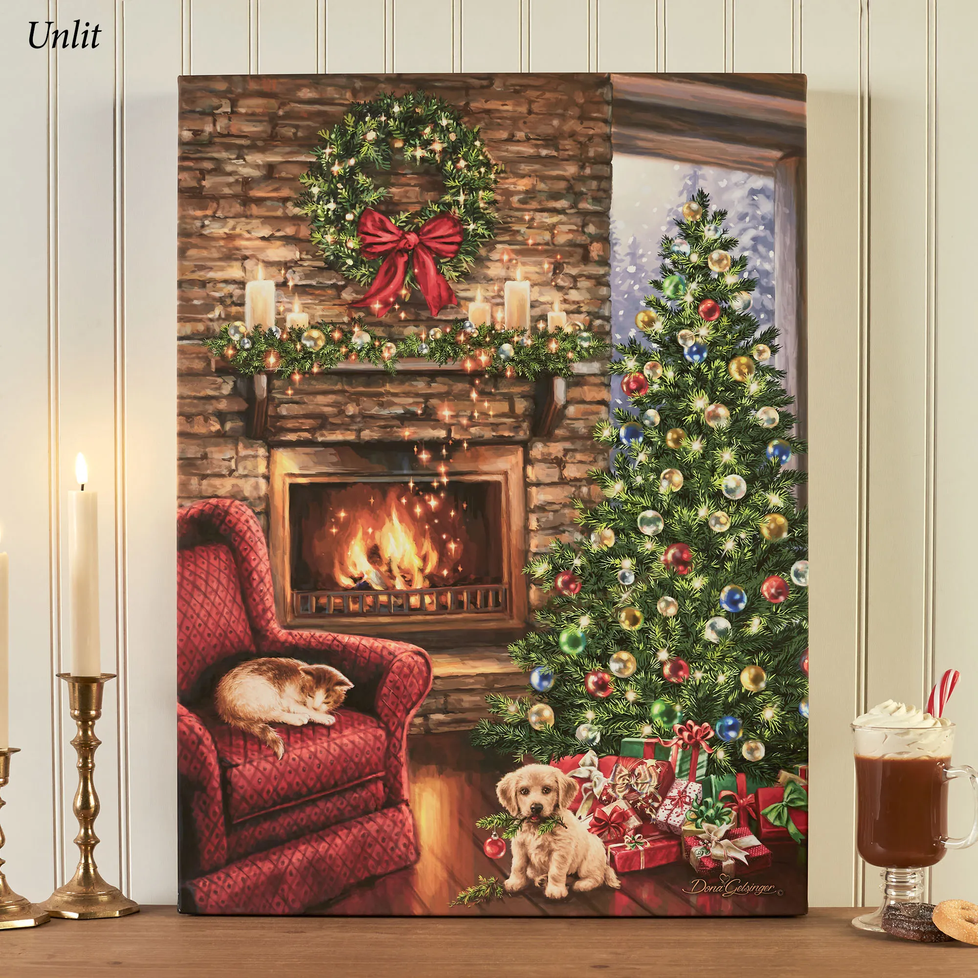 Dona Gelsinger Fireside Christmas Pets Kitten and Puppy LED Lighted Wall Art by Glow Decor
