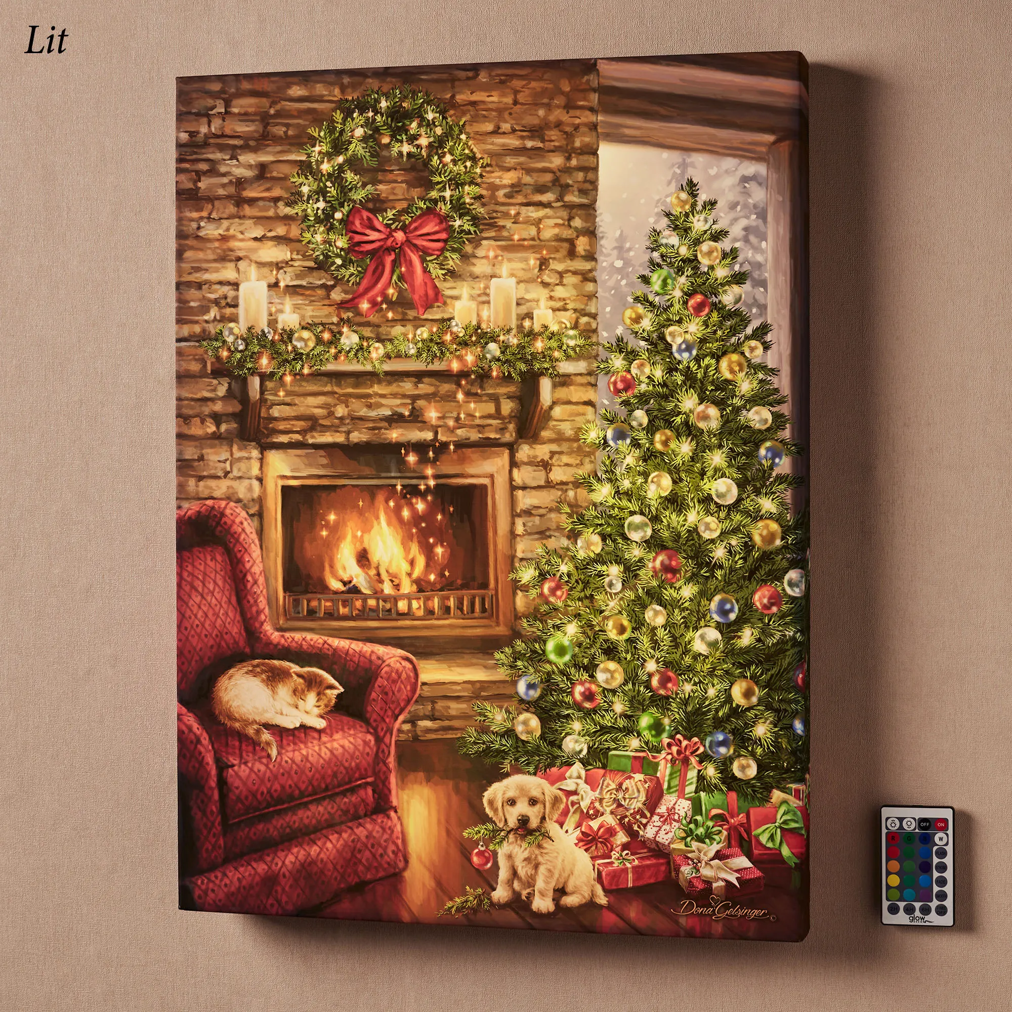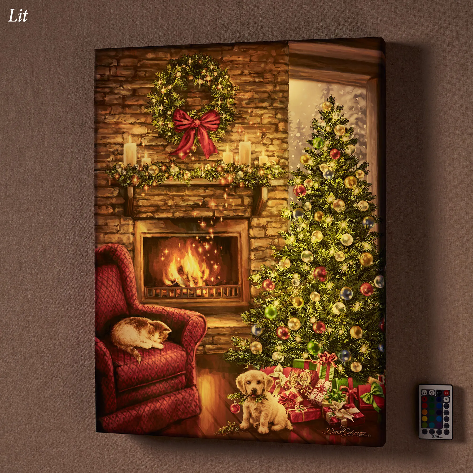 Children will never forget the Fireside Christmas where they received their furry friends. Emitting magic into the air, the fire roars in the fireplace beside the decorated Christmas tree, pile of presents, and lovely mantel. A cute kitten sleeps in the red armchair, while a mischievous puppy plays on the floor. Fully illuminated by LED lights, the Glow Decor(R) printed artwork features a silky satin cloth gallery-wrapped around a wood frame and adorned with art originally by artist (C)Dona Gelsinger. Requires three of your AA batteries or your power adapter for use with the included USB cord. The included multifunctional remote, battery also included, offers built-in two-, four-, or six-hour timer options; brightness control; various all-over color selections; and multiple glow modes. Overall, the Christmas lighted wall art measures 18"Wx2"Dx24"H. Imported/USA.