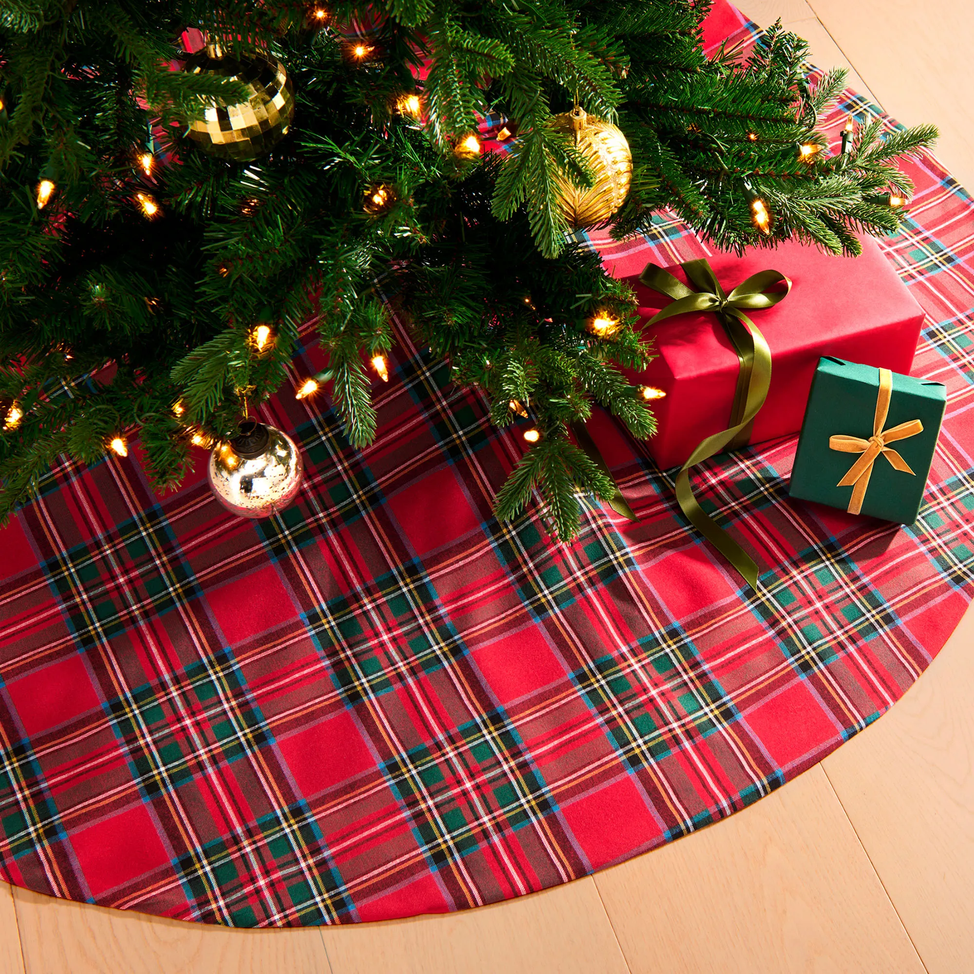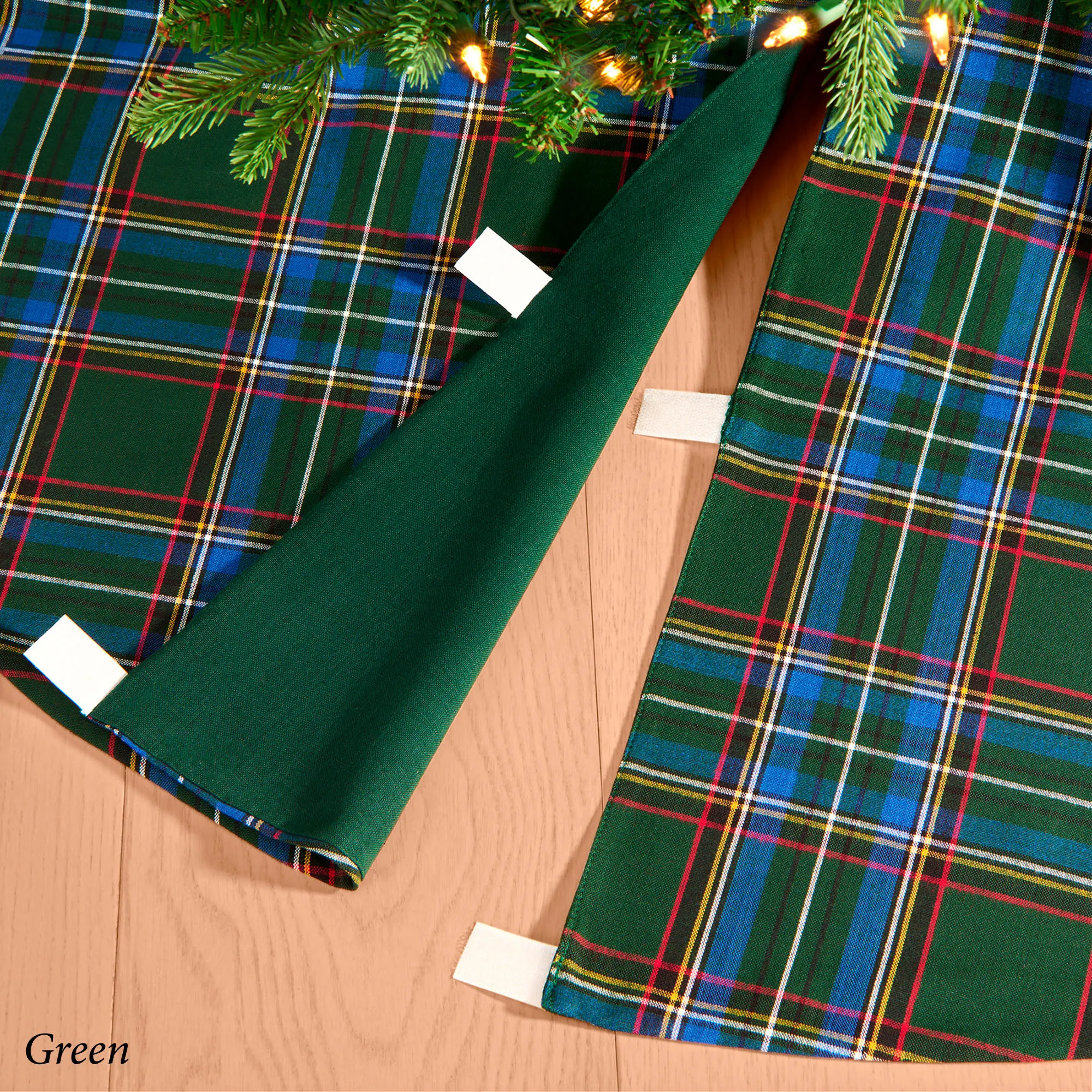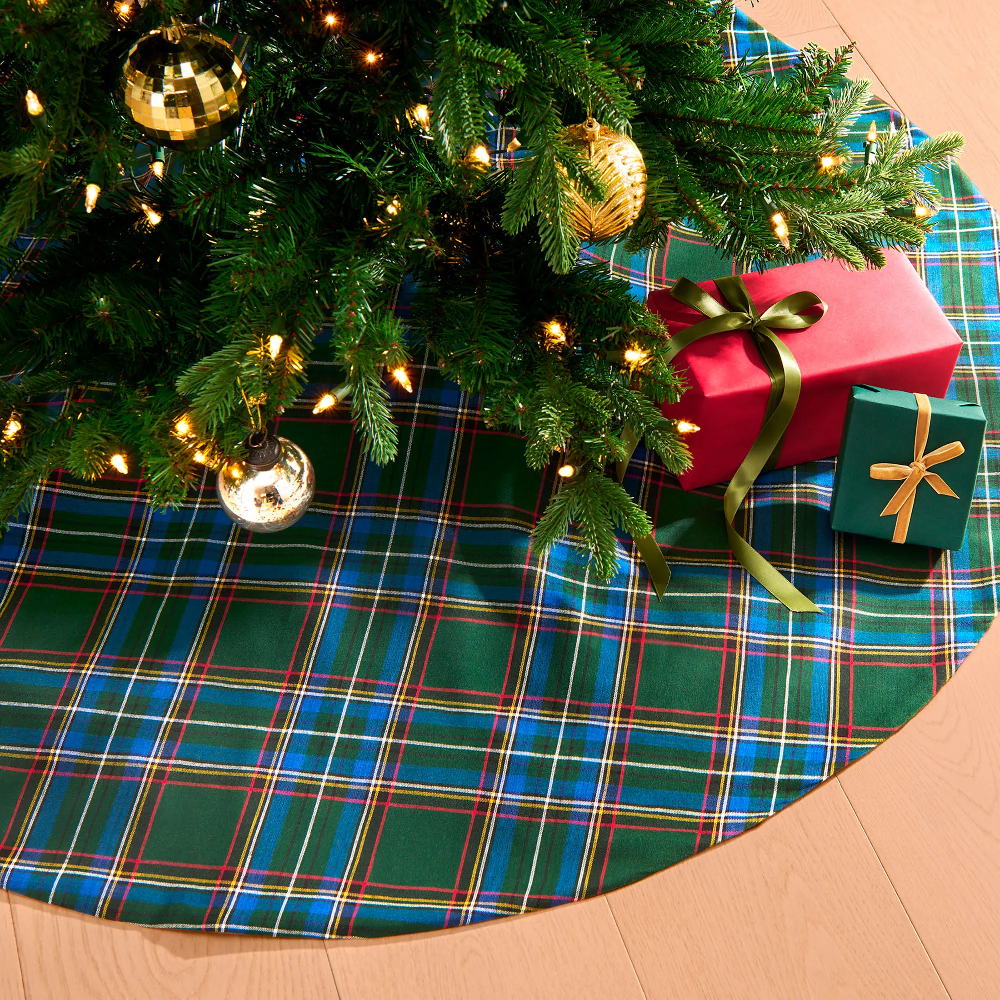 Dress your Christmas tree with the classic Fireside Tartan Tree Skirt. With a timelessly fashionable look, the cotton/polyester-blend design features a yarn-dyed plaid pattern with accent hues of Christmas red, hunter green, royal blue, gold, and white. Tailored edges, a 5" center opening for your tree, and 1.5" hook-and-loop closure tabs surround your holiday focal point with a beautiful look. Overall, the plaid Christmas tree skirt measures 48" dia. Machine washable. Imported.