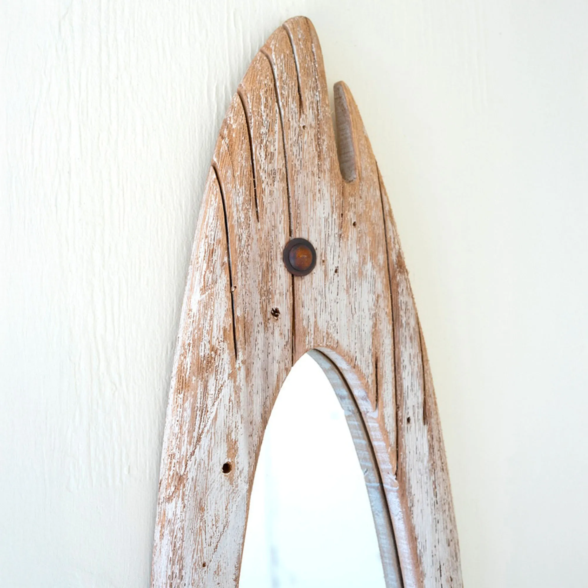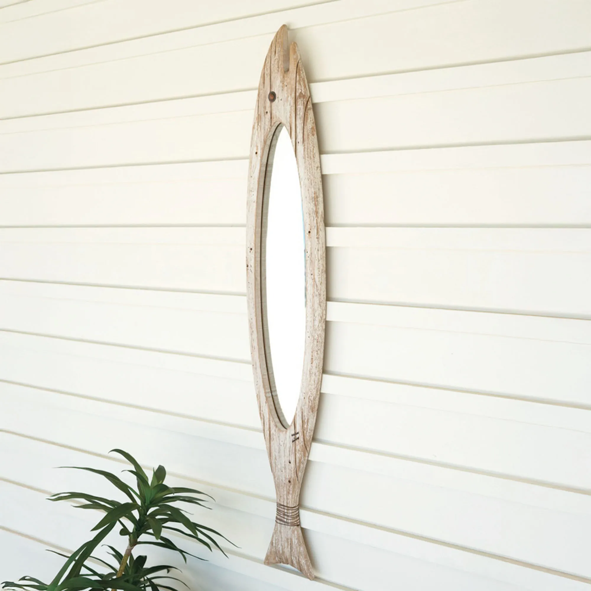 Fishy Reflections cast you to the depths of the sea or along the lakeshore with just a glimpse. Complete with a classic whitewashed hue, the shaped wall mirror features a light brown wood frame carved to resemble a long fish. An open mouth, dimensional eye, and wrapped tail add to the design. The center oval mirror glass measures 6"x26". Panel mirror may hang vertically or horizontally. Overall, the coastal fish-shaped wall mirror measures 8.5"Wx1"Dx47"H.