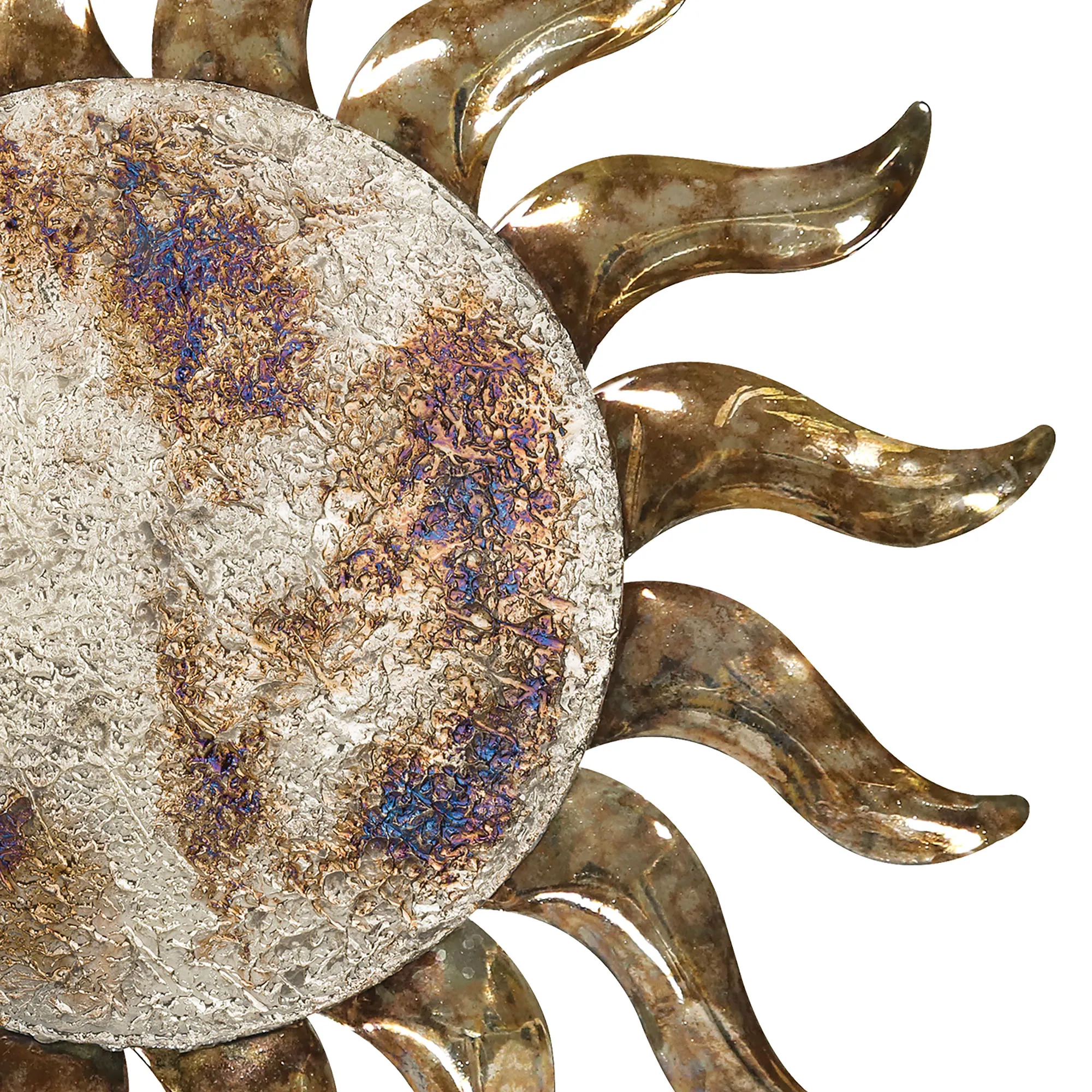 The Flamed Sun Wall Art blazes any space with its radiant glow. Made of metal, this striking sun features wavy rays, a textured center, and a metallic silver and champagne gold plated "flamed" finish that is weather- and fade-resistant. Indoor or outdoor year-round use. Measures 29"dia.x2"D.