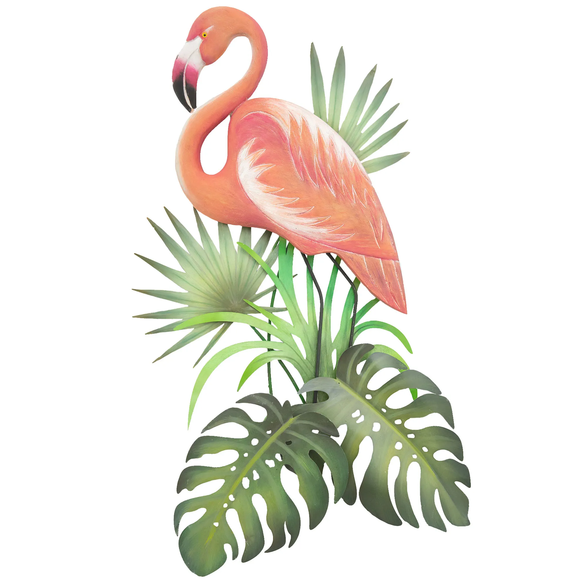 Perched among the palm leaves, the Flamingo in Tropical Foliage exudes a classic allure. Designed by artist Joanne Ferrara, the handcrafted dimensional wall sculpture features a handcarved wood flamingo surrounded by various metal tropical palm leaves. Handpainted pink and green shades bring the exotic design to life. Perfect for your indoor space, covered porch, or enclosed patio, the flamingo wall art measures 17"Wx3"Dx36"H.