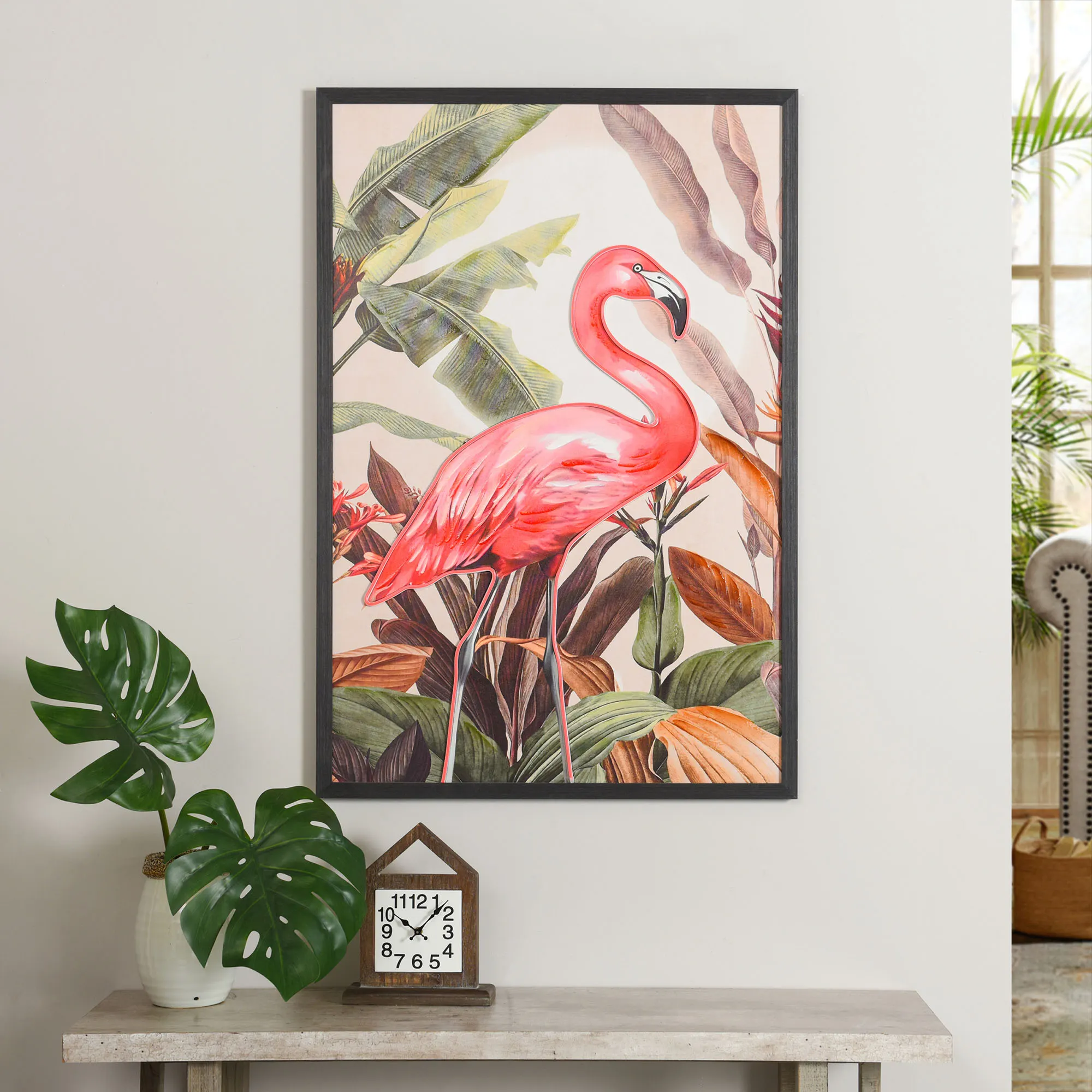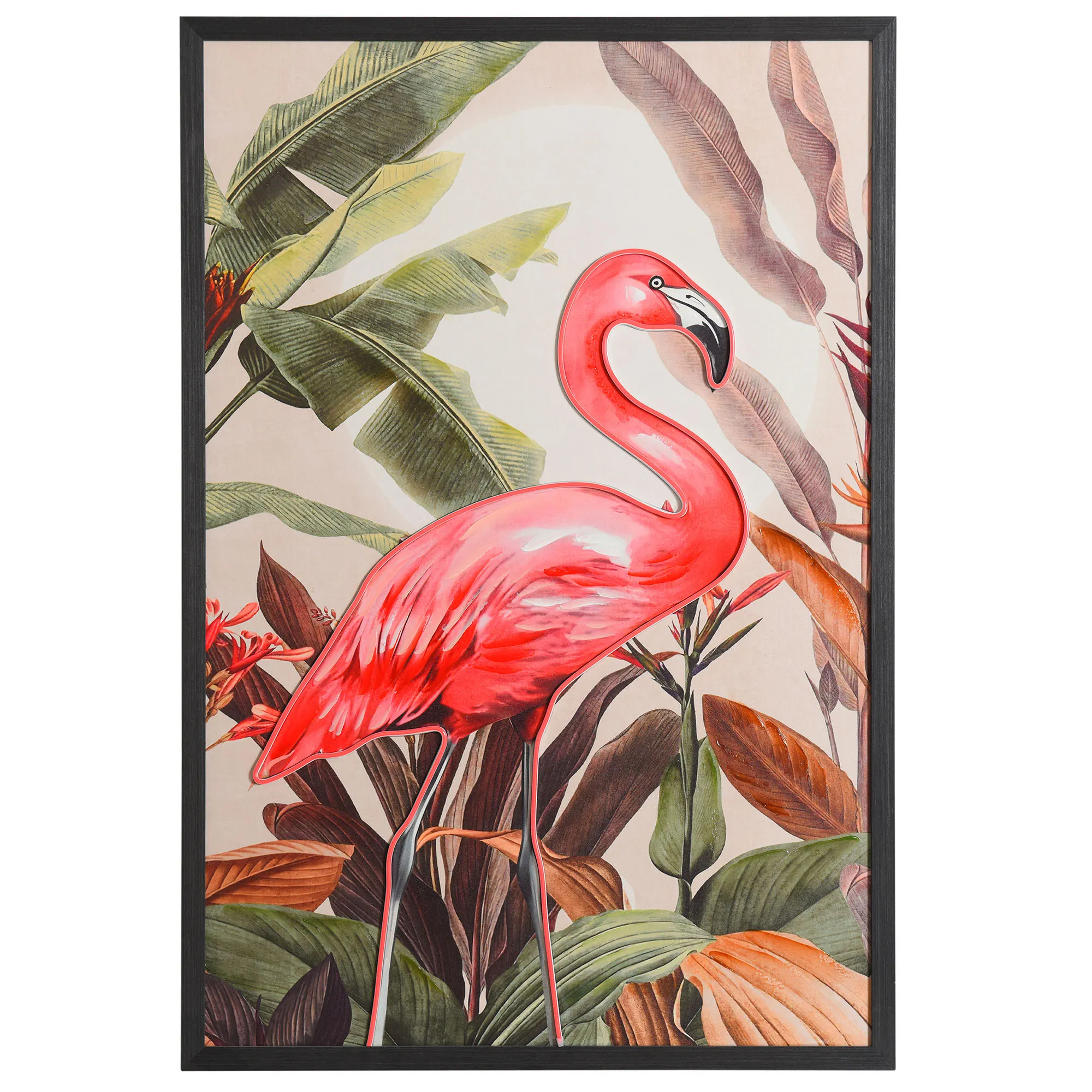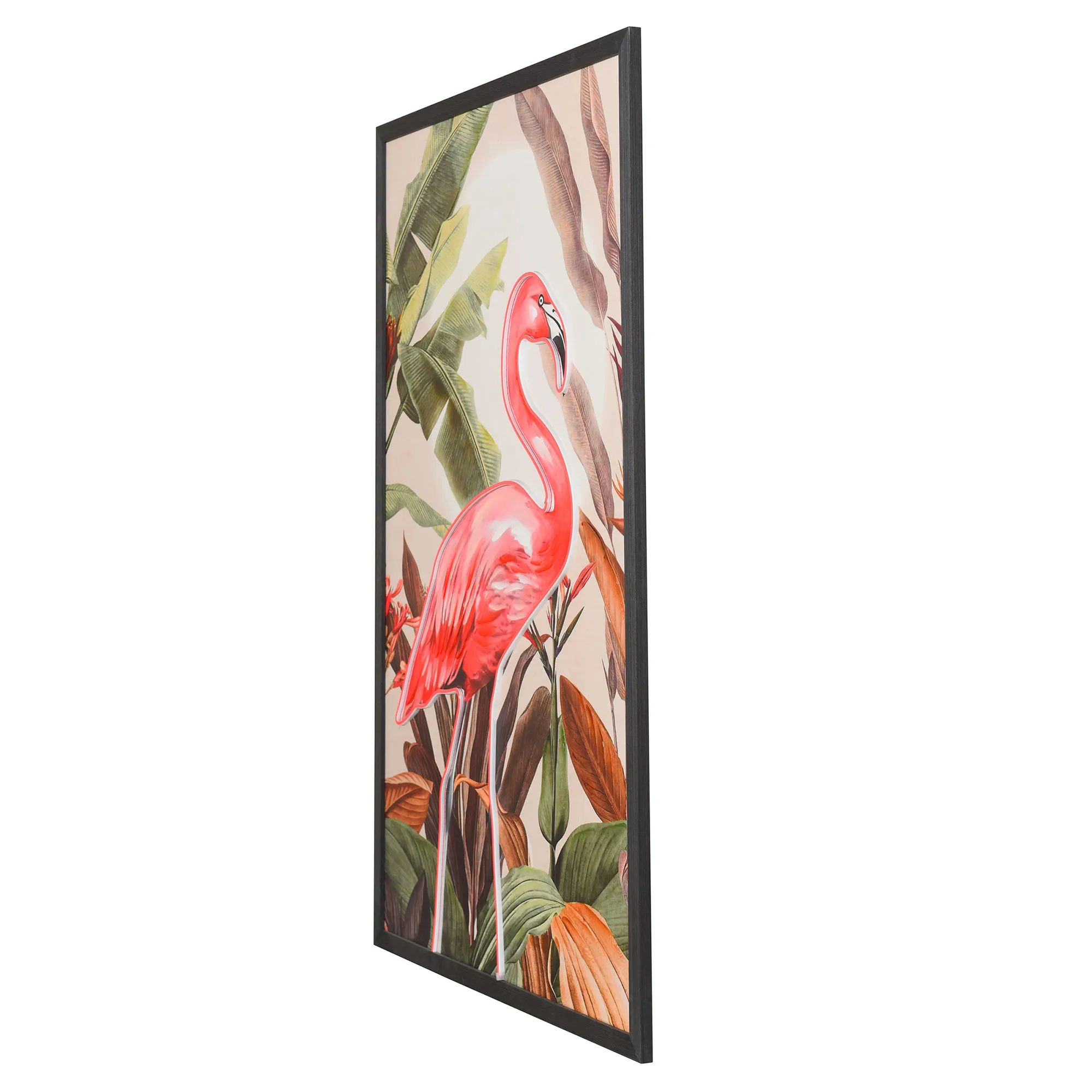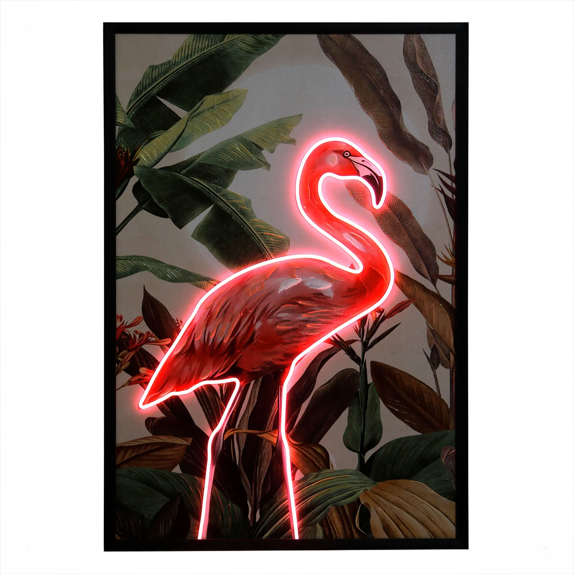 The Flamingo LED Lighted Canvas Wall Art pops in your space with bold tropical allure. Surrounded by glowing, brilliant pink LED light, a pink flamingo stands in front of classic colorful tropical leaf designs inside a black wood frame. Gallery-wrapped over a wooden frame, the lighted canvas operates from an in-line switch. Measures 33"Wx1"Dx49"H.