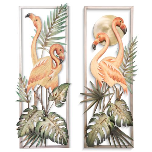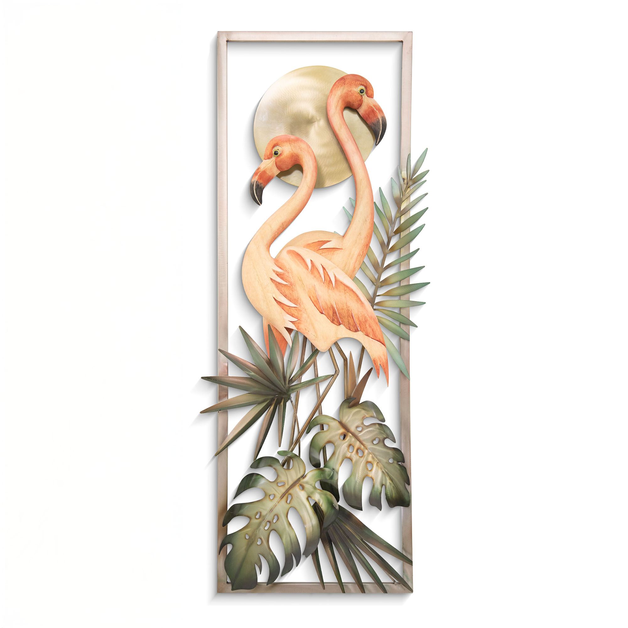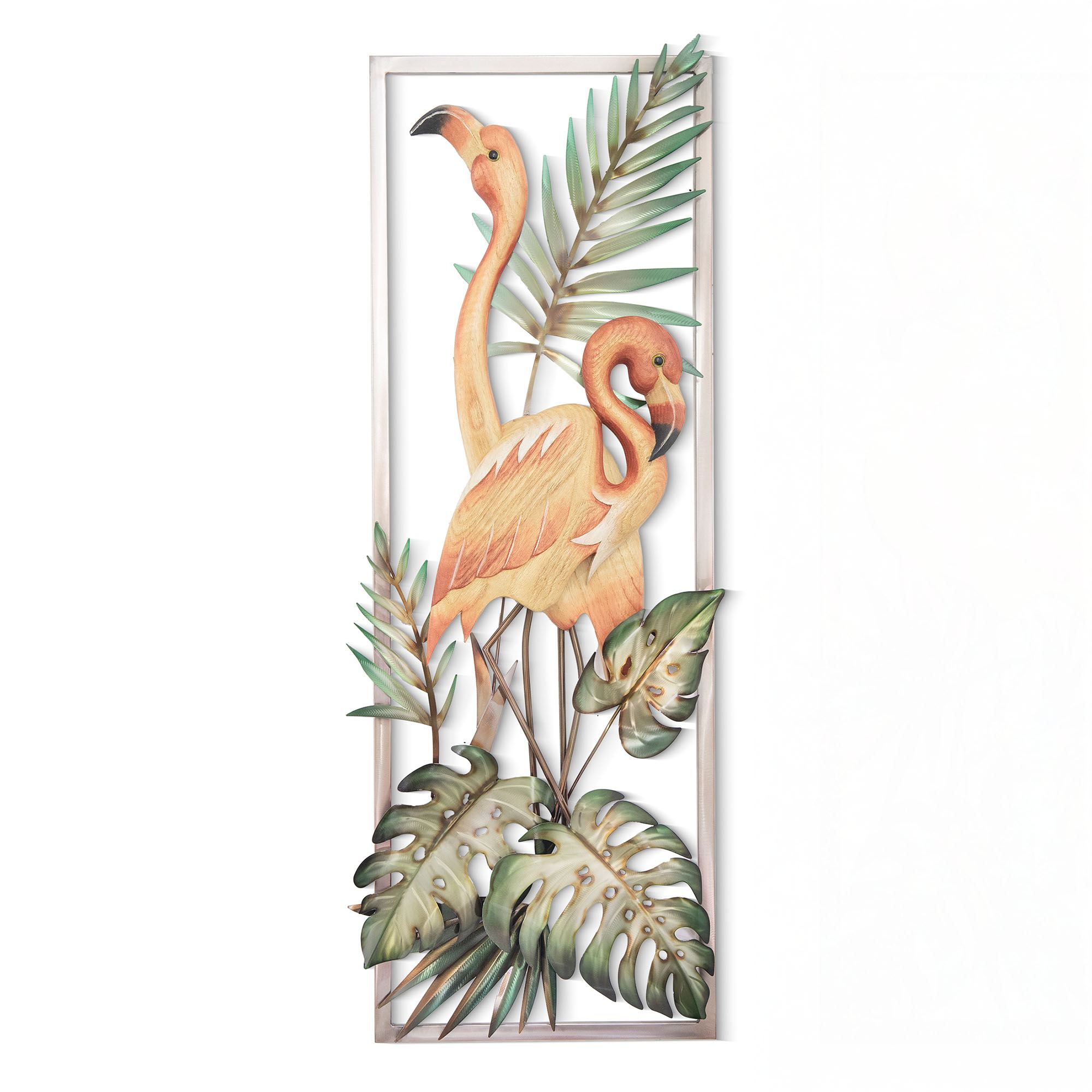 The Flamingos in the Tropic Wall Art is stainless steel, metal, and wood.