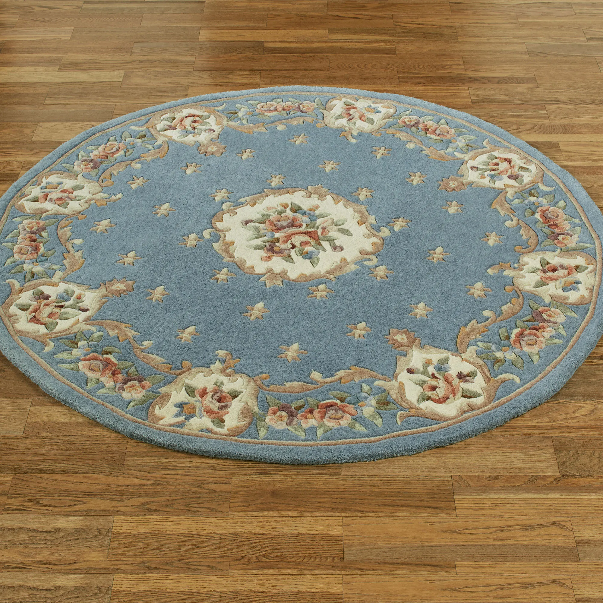 The handcarved, pure wool Fleur-de-Lis Aubusson Round Rugs are hand-tufted. Fields feature a central Aubusson of florals encased in scrolls. Fleurs-de-lis are evenly spaced on the solid grounds. These handmade, luster-washed area rugs, .75" thick, have cloth-covered latex backs. Design may vary by size. Due to the handcrafted nature of these rugs, slight variations may occur. We recommend professional cleaning by a rug cleaner. Imported.