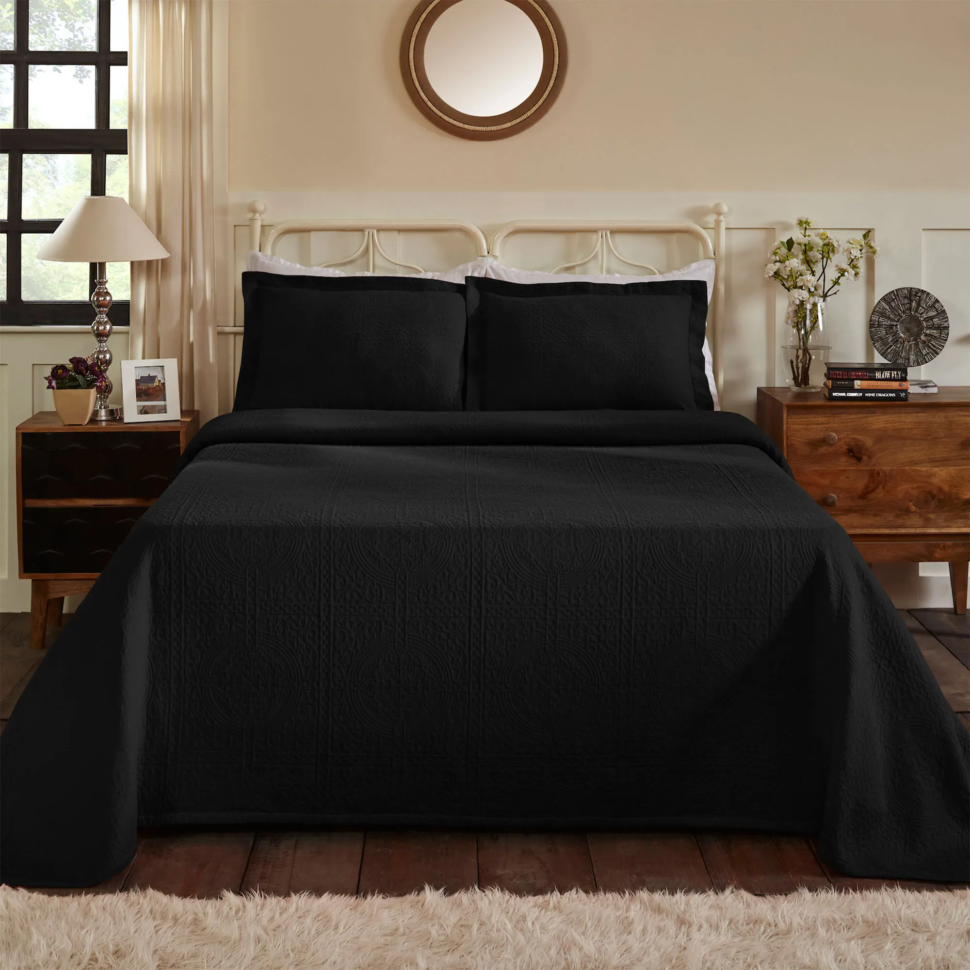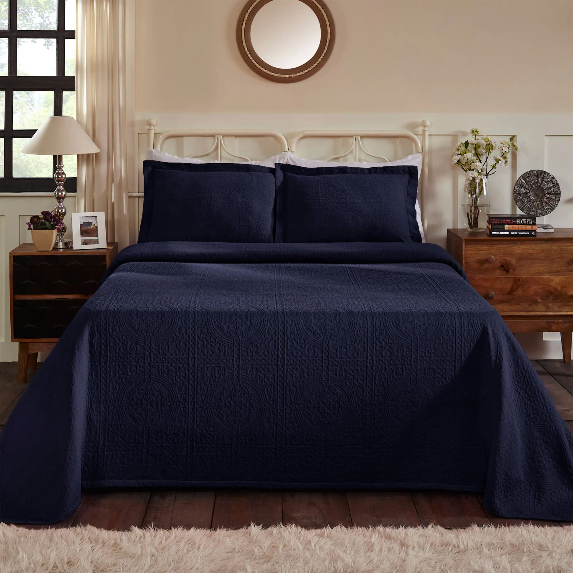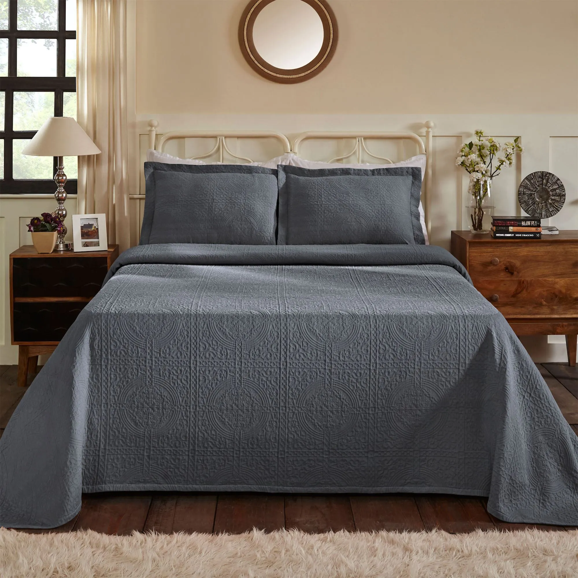Complement your sleeping space with the simply elegant Fleur-de-Lis Matelasse Bedding. The Bedspread Set includes a bedspread and sham(s). This lightweight, solid color cotton bedding features an intricate, jacquard-woven matelasse traditional pattern with texture. The bedspread has bound ends. The flanged sham(s) mimics the bedspread and has a French back closure(s). Specify Gray, Black, Dark Teal, Garnet Rose, Ivory, Navy, or White. Machine washable. Imported.