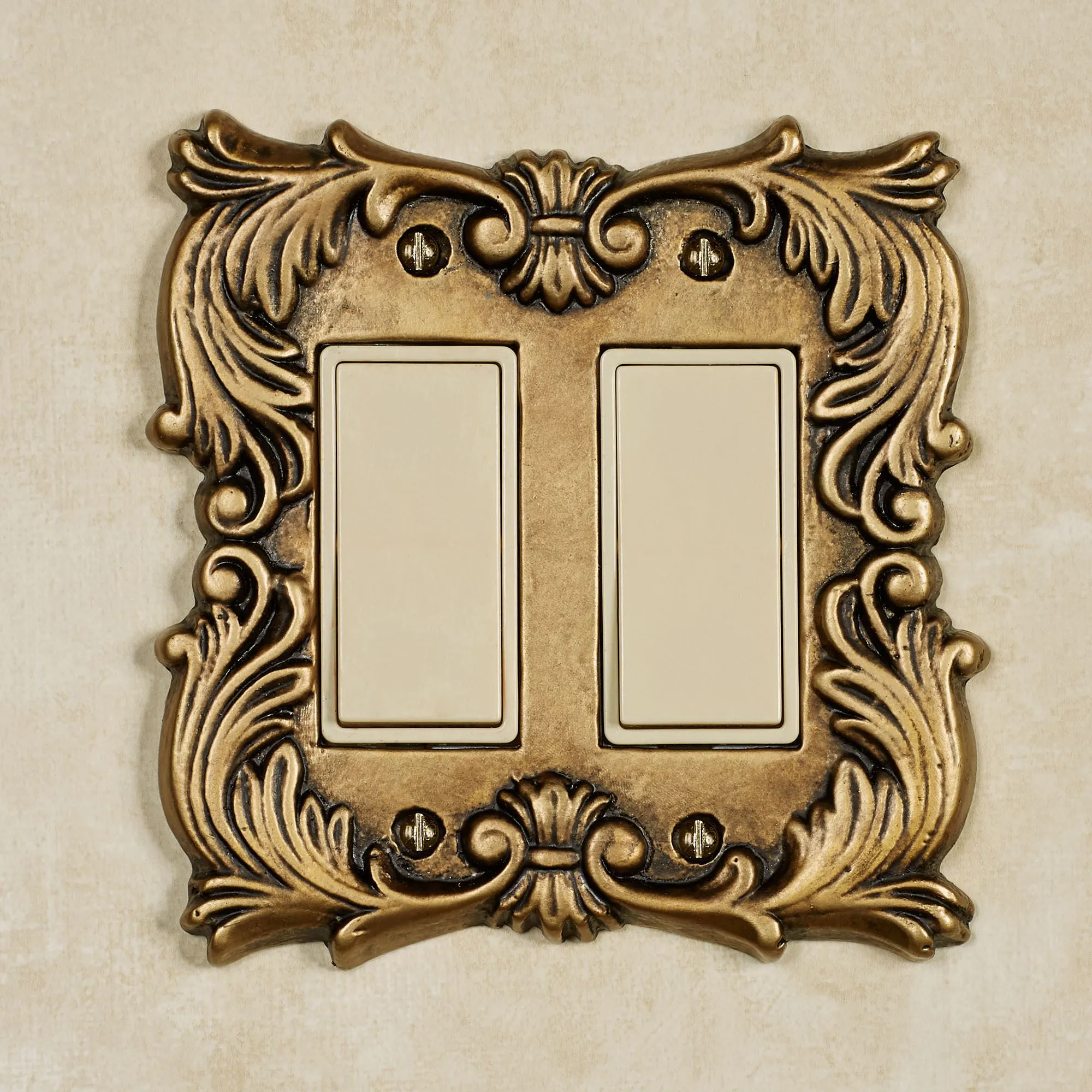 The hand-cast aluminum Fleur-de-Lis Decorative Switchplates are hand-finished in antique brass. The border of scrolling, stylized fleurs adds class. Single Switch, 3.5"Wx5.5"H. Double Switch, 5.5"Wx5.75"H. Single Outlet (two sockets), 3.5"Wx5.5"H. Single Dimmer/Rocker, 3.5"Wx5.5"H. Double Dimmer/Rocker, 5.5"Wx5.75"H.